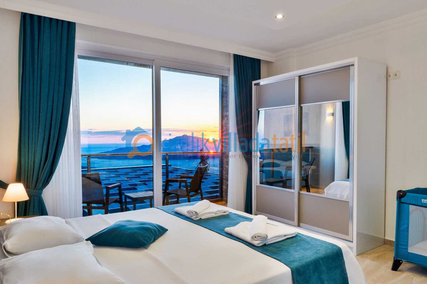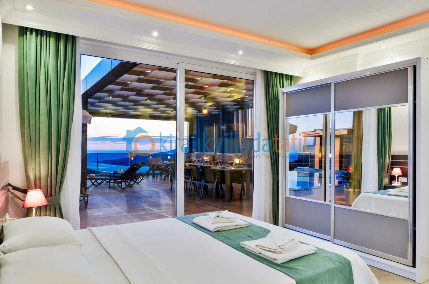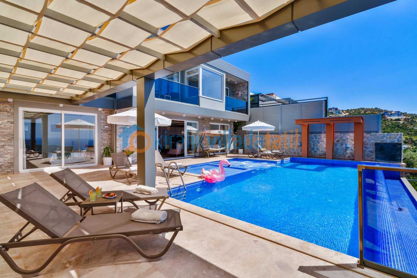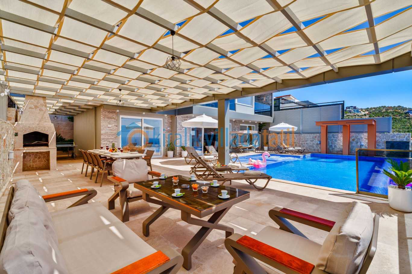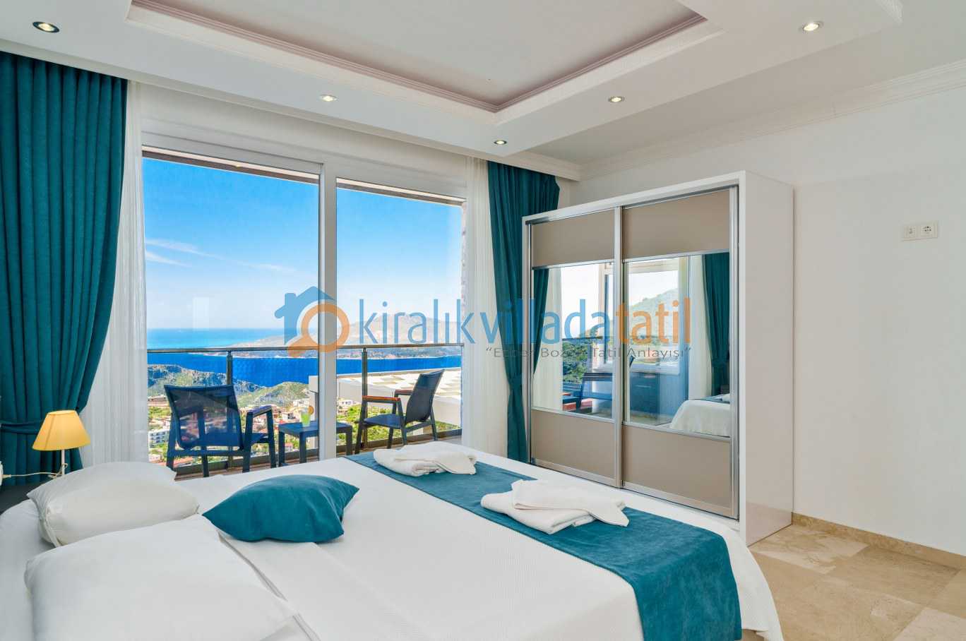 Deniz manzarası ile birleşen geniş teras alanı akşam saatlerinde çok daha etkileyici bir atmosfere dönüşür. Gün batımını izlemek açık havada vakit geçirmek ve sakin bir akşam geçirmek isteyenler için oldukça keyifli bir alan oluşturur. Hem merkezi konumda olup hem de bu kadar özel bir manzara sunması bu lüks villa seçeneğini daha değerli hale getirir. Kalkan’ın canlı yapısına yakın olmak isteyen ama aynı zamanda daha özel bir tatil geçirmek isteyen misafirler için dengeli bir alternatif sunar.