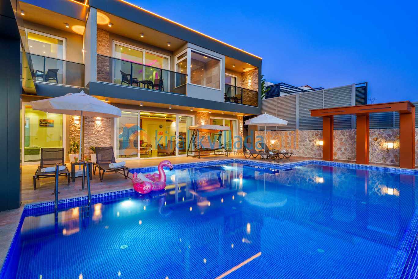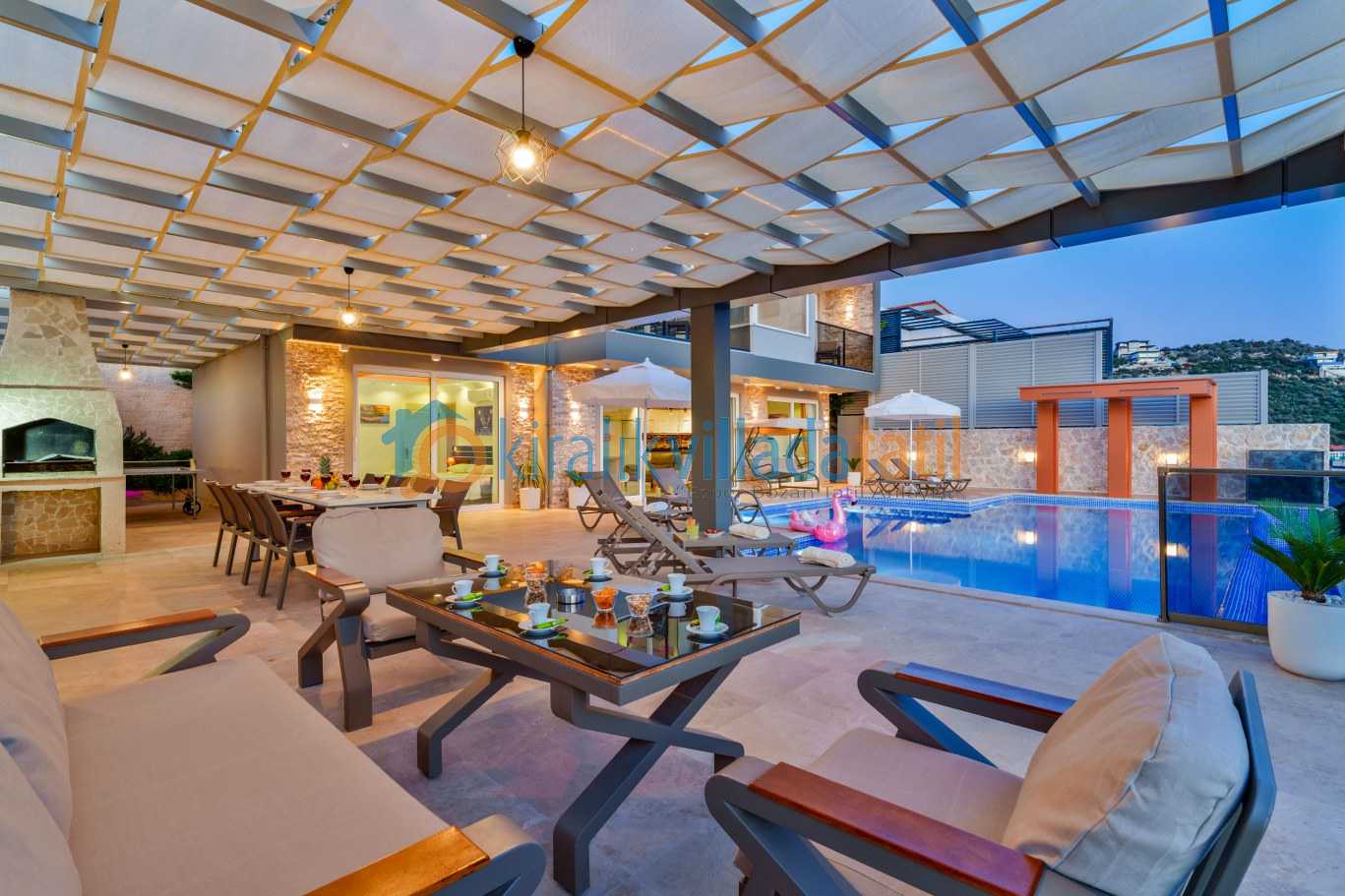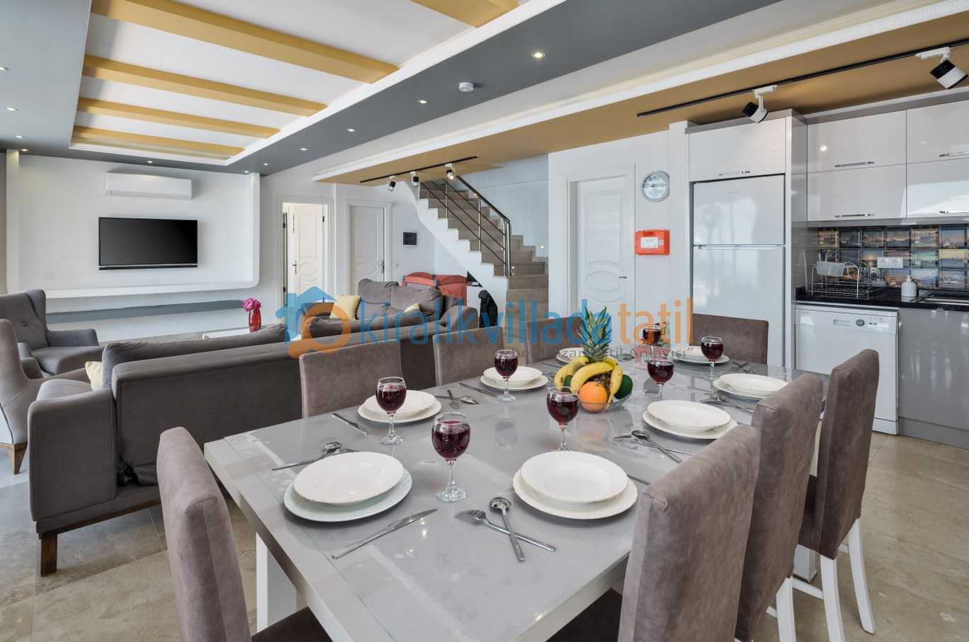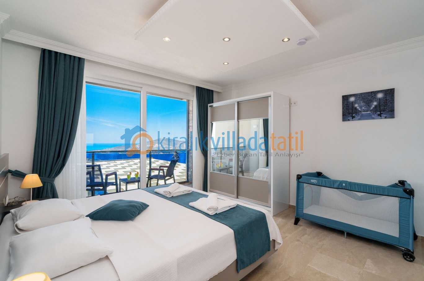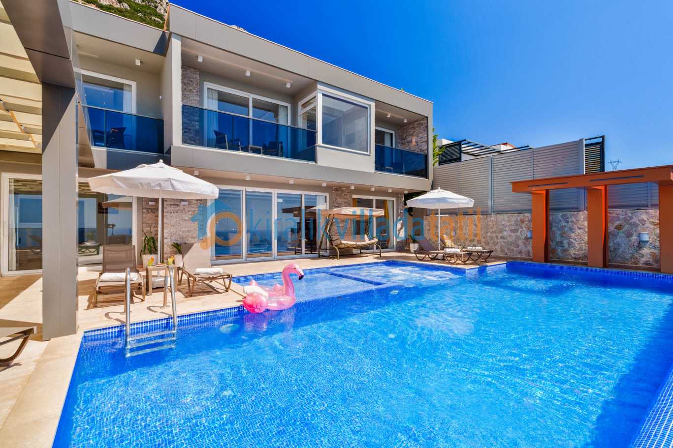 Deniz manzarası ile birleşen geniş teras alanı akşam saatlerinde çok daha etkileyici bir atmosfere dönüşür. Gün batımını izlemek açık havada vakit geçirmek ve sakin bir akşam geçirmek isteyenler için oldukça keyifli bir alan oluşturur. Hem merkezi konumda olup hem de bu kadar özel bir manzara sunması bu lüks villa seçeneğini daha değerli hale getirir. Kalkan’ın canlı yapısına yakın olmak isteyen ama aynı zamanda daha özel bir tatil geçirmek isteyen misafirler için dengeli bir alternatif sunar.