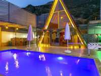 Villa, üçgen formda tasarlanmış ahşap konseptiyle dikkat çeker. Doğanın tam ortasında konumlanan bu modern tasarım, huzurlu bir atmosfer yaratırken aynı zamanda konuklarına sıcak ve samimi bir ortam sunar. Korunaklı havuz alanı sayesinde dışarıdan görünmeden tamamen size özel bir tatil yaşama imkânı elde edersiniz. Bu özelliği, muhafazakâr villa arayan misafirler için önemli bir avantaj sağlar.