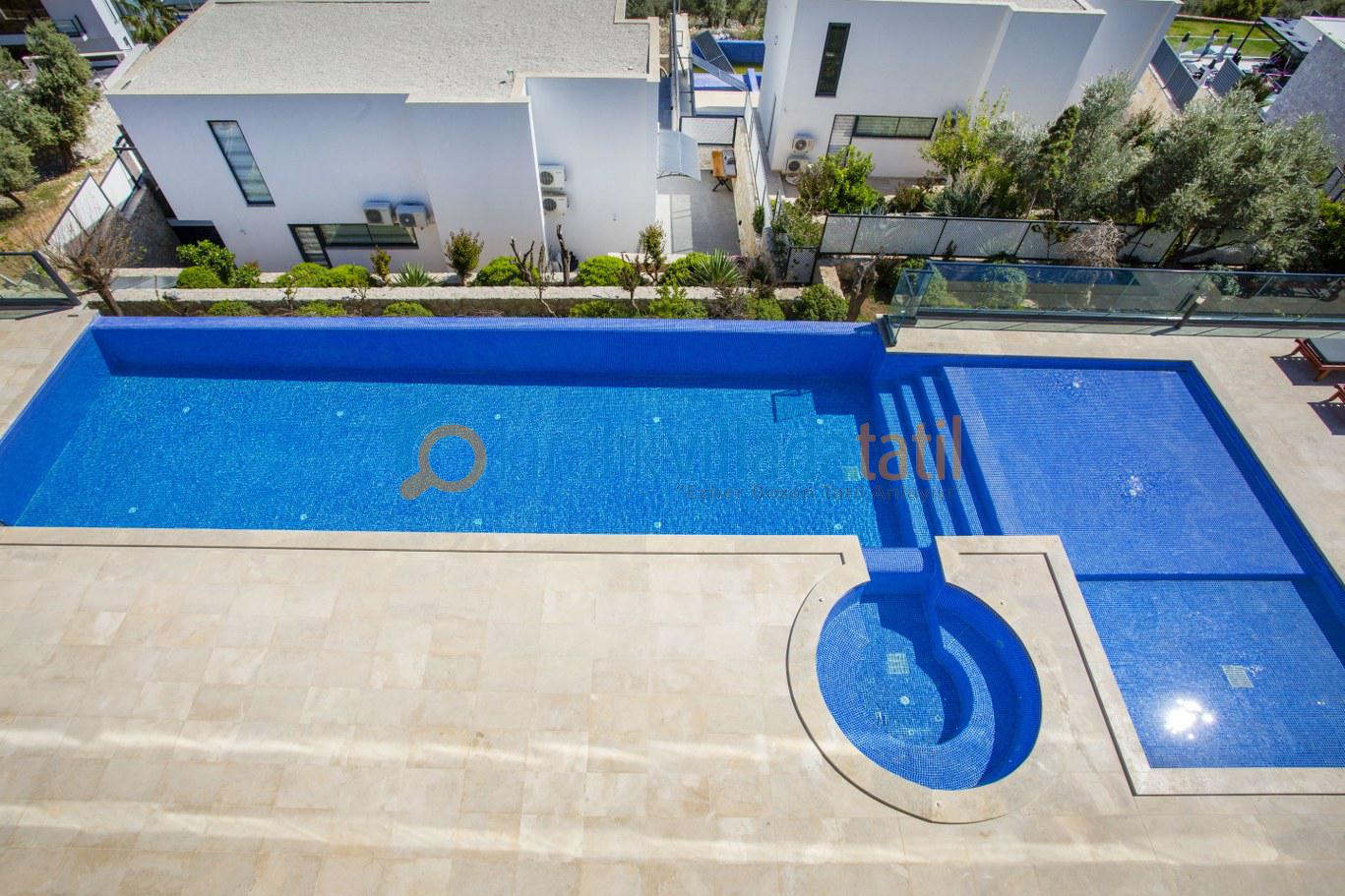 Villanın dış alanında yer alan büyük özel yüzme havuzu, çocuklar için sığ havuz bölümü ve havuz içerisinde konumlandırılmış yuvarlak oturma köşesiyle gün boyu keyifli vakit geçirme imkânı sunuyor. Geniş havuz terası; güneşlenme alanları, açık hava oturma grubu, mangal köşesi ve yemek masasıyla hem gündüz hem akşam saatlerinde sosyal yaşamı destekleyecek şekilde tasarlanmış durumda. Ayrıca masa tenisi gibi aktivite alanları tatilinize hareket katıyor.