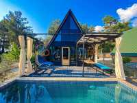 Tamamen doğal masif ahşap kullanılarak yapılmış evlerin aynı şekilde masif ahşap ağırlıklı tam donanımlı açık mutfağı , cıvıl cıvıl renkler ile döşenmiş full eşyalı salonu ,tuvalet banyo ve iki adet tek kişilik yatak mevcuttur .