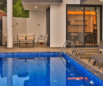 Villamızın korunaklı bahçesinde havuz, şezlonglar, güneş şemsiyeleri, oturma köşesi, yemek masası ve barbekü alanı bulunmaktadır. Modern bir mimari anlayışıyla dizayn edilen villamızda ayrıca jakuzi de mevcuttur. Villamızın içerisinde ise ihtiyacınız olabilecek tabak, bardak, çatal vs. mevcuttur. Unutulmaz bir tatil için villamız siz değerli misafirlerimizi beklemektedir.