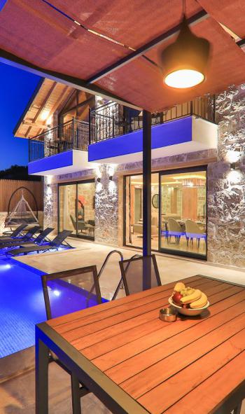 Villamızın geniş bahçesi ve özel yüzme havuzu, misafirlerimizin huzurlu ve keyifli bir tatil geçirmeleri için özel olarak tasarlanmıştır. Havuz alanının tam korunaklı olması, dışarıdan hiçbir şekilde görülmemesini sağlar ve misafirlerimize mahremiyet sunar. Geniş terasta gün boyu güneşlenebilir veya akşam saatlerinde yıldızları seyredebilirsiniz. Ayrıca, villamızda bulunan çift kişilik jakuziler, rahatlamanızı ve tatilinizin tadını çıkarmanızı sağlar.