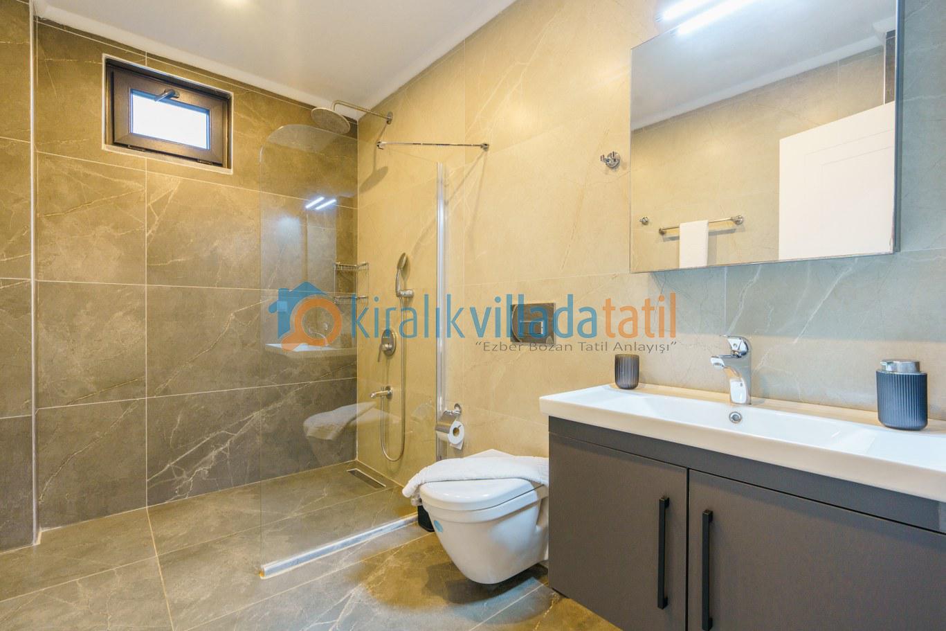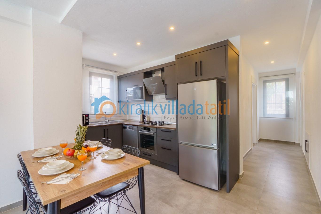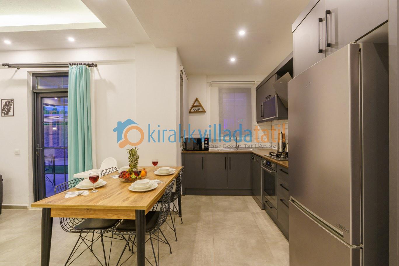 Salon bölümünde modern oturma grubu, televizyon, uydu yayını, klima ve havuz terasına doğrudan çıkış bulunuyor. Gün içerisinde dinlenmek ve keyifli vakit geçirmek için rahat bir kullanım sunan bu alan, villanın genel ferahlığını destekliyor. Amerikan mutfak düzenine sahip mutfakta ise buzdolabı, çamaşır ve bulaşık makinesi, ankastre fırın, mikrodalga, dört gözlü ocak, kettle ve günlük kullanım için gerekli tüm mutfak ekipmanları eksiksiz olarak yer alıyor.