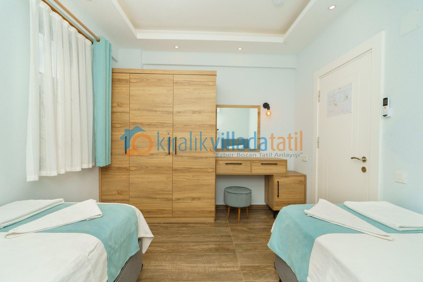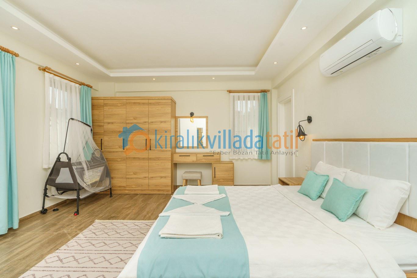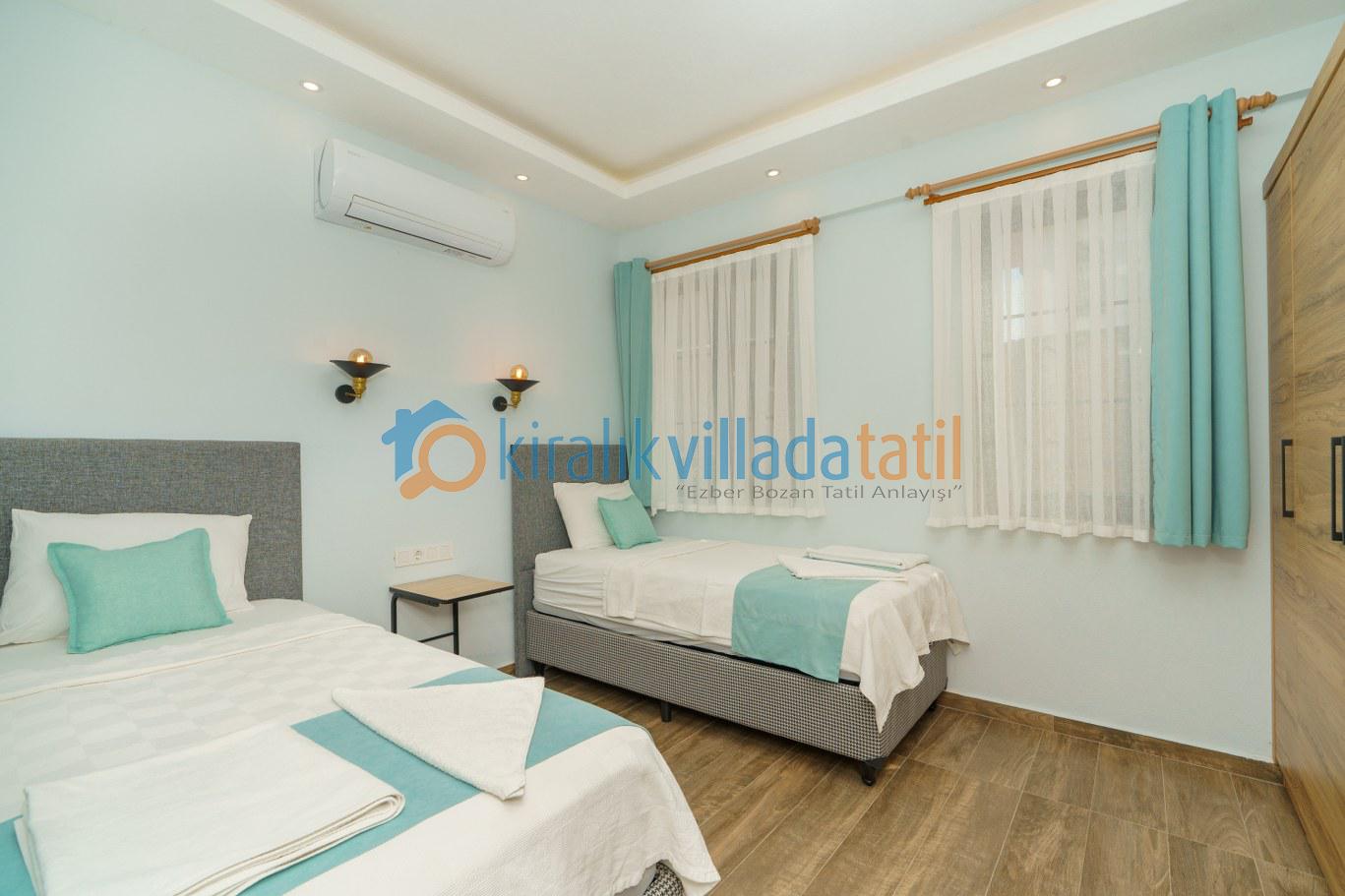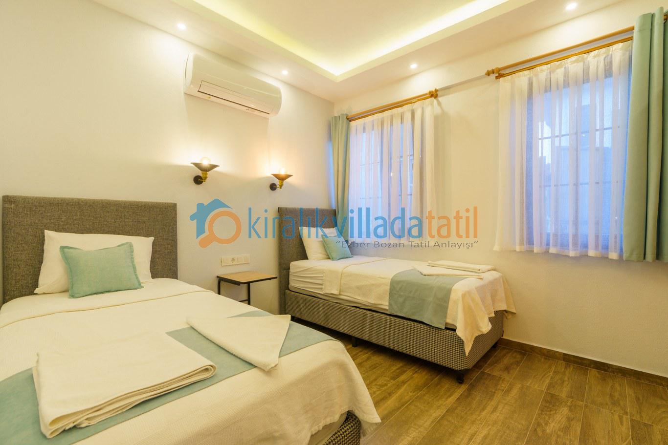 Yatak odalarından biri çift kişilik yatak, jakuzi, klima ve özel banyoya sahipken; diğer yatak odasında iki adet tek kişilik yatak, klima ve banyo bulunuyor. Her iki oda da konforlu ve kullanışlı şekilde düzenlenmiş durumda.