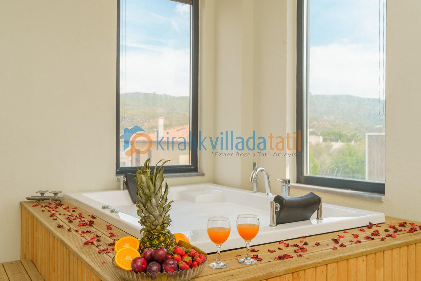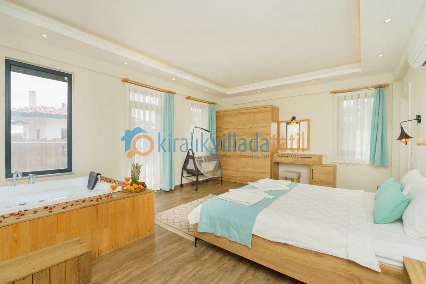 İki yatak odasıyla dört kişilik konaklama kapasitesine sahip olan bu villa, hem çekirdek aileler hem de balayı çiftleri için ideal bir yaşam alanı oluşturuyor. Ana yatak odasında yer alan jakuzi, günün yorgunluğunu atabileceğiniz keyifli bir dinlenme alanı sunarken, modern ve sade dekorasyon villanın tamamında ferah bir atmosfer yaratıyor.