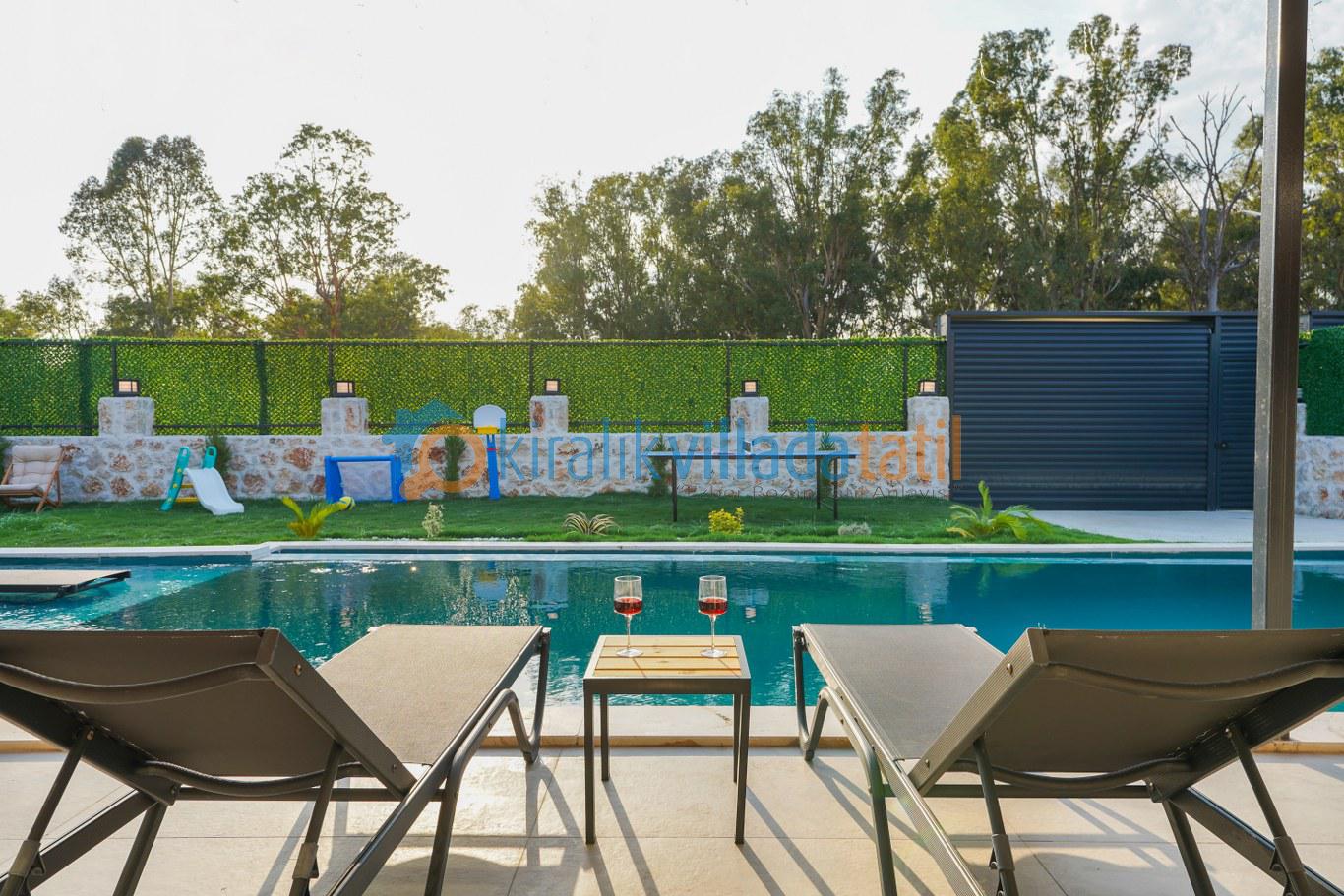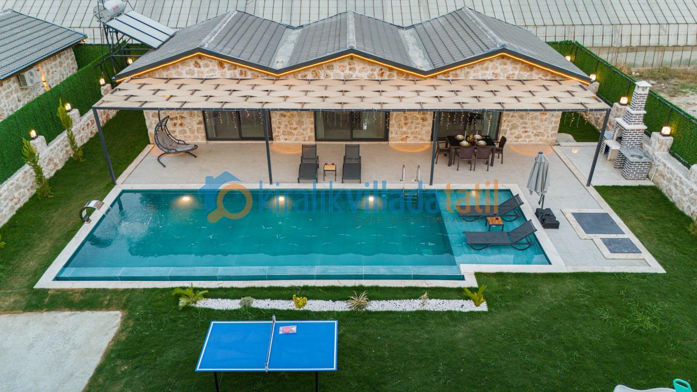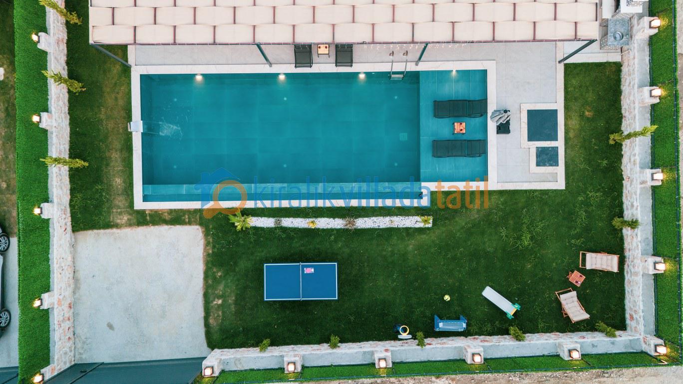 Geniş ve bakımlı bahçe alanı villanın öne çıkan detaylarından biridir. Bahçe içerisinde yer alan salıncak, masa tenisi ve çocuklar için düşünülmüş oyun alanı sayesinde her yaştan misafir için keyifli vakit geçirme imkânı sunulmaktadır. Doğa ile iç içe konumu, ferah atmosferi ve sakin çevresiyle şehir kalabalığından uzak, huzurlu bir tatil ortamı oluşturur.