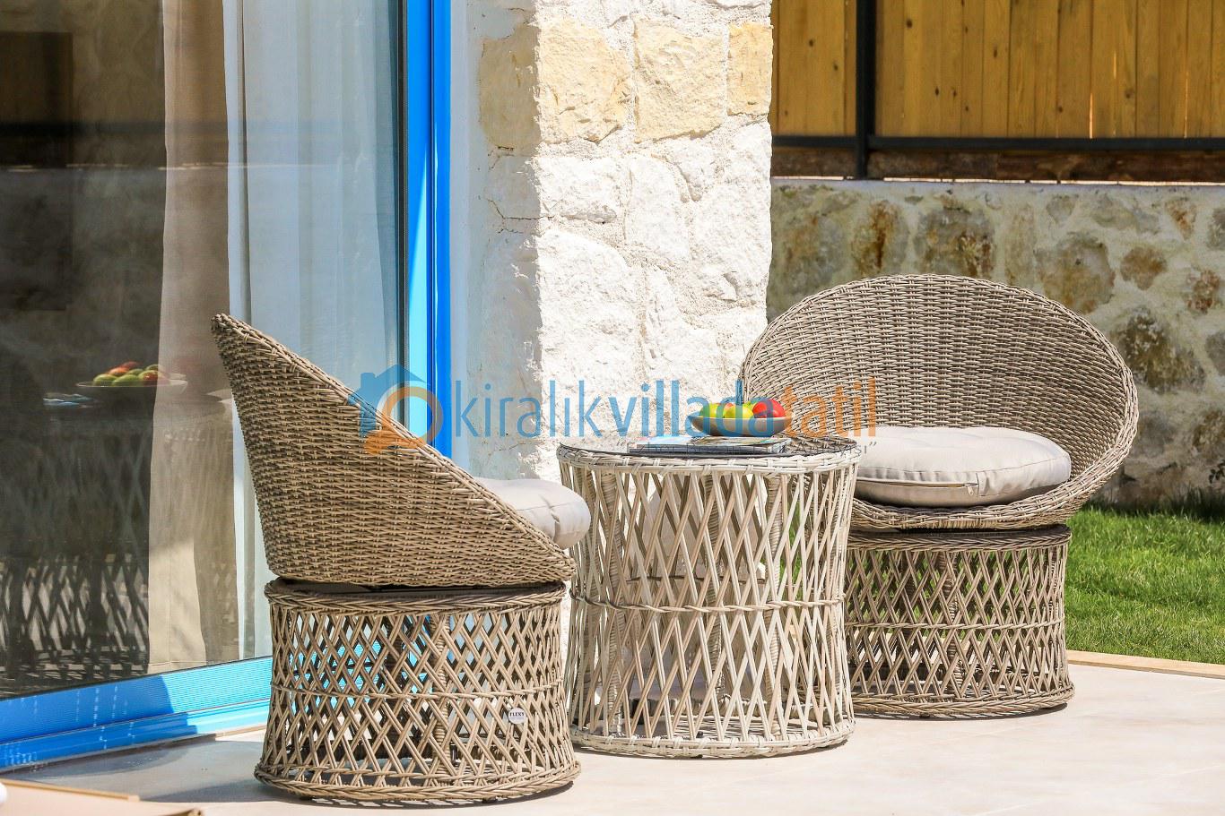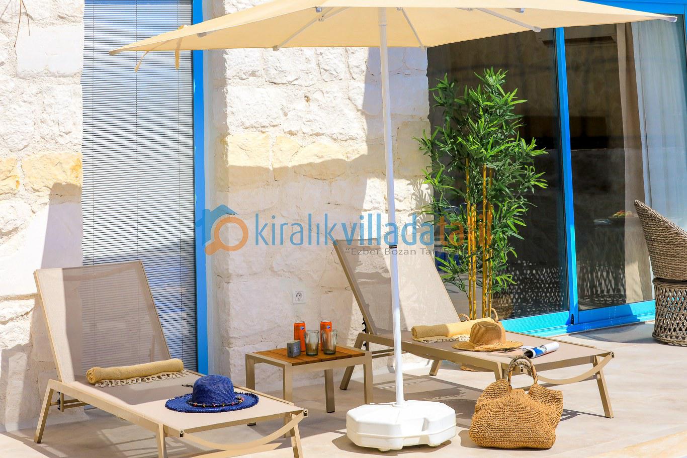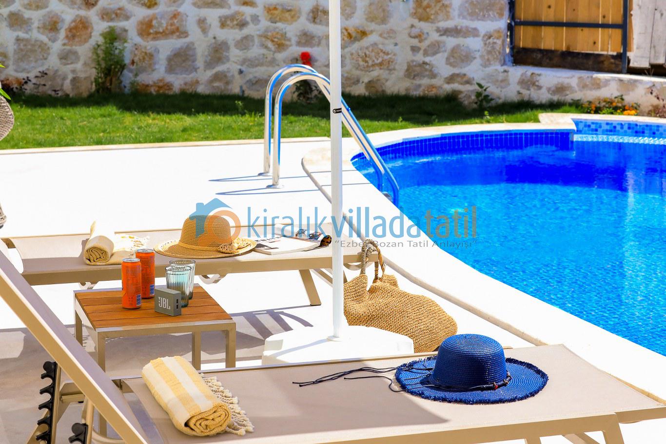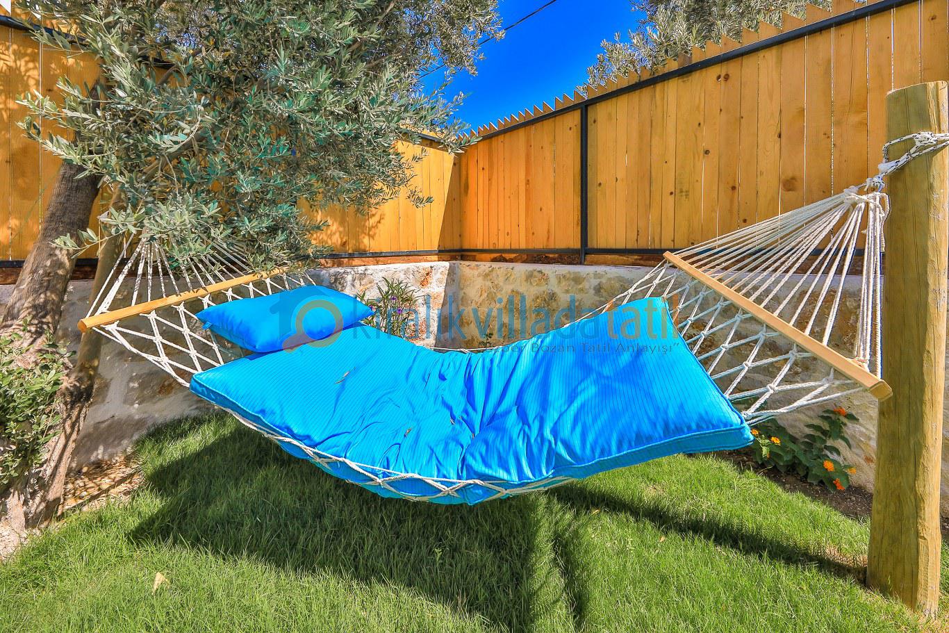 Villanın yüksek duvarlarla çevrili, tamamen korunaklı villa konseptine sahip geniş bahçesi; yaz sıcaklarında serinleyebileceğiniz özel yüzme havuzu, şezlonglar, güneş şemsiyeleri, oturma alanı, salıncak, barbekü ve yemek masası gibi birçok konforlu donanımla zenginleştirilmiştir. Bu yapı, dışarıdan görünmeden tatil yapmak isteyen muhafazakâr villa tercih eden misafirler için büyük avantaj sağlar.