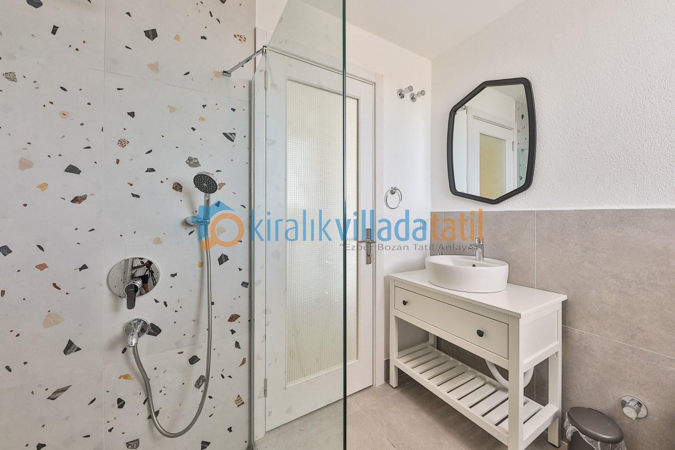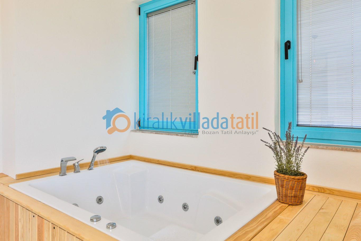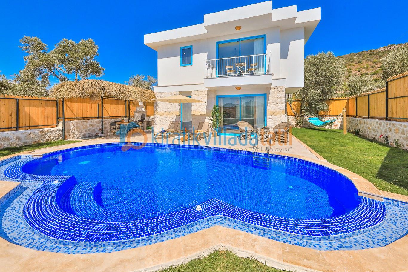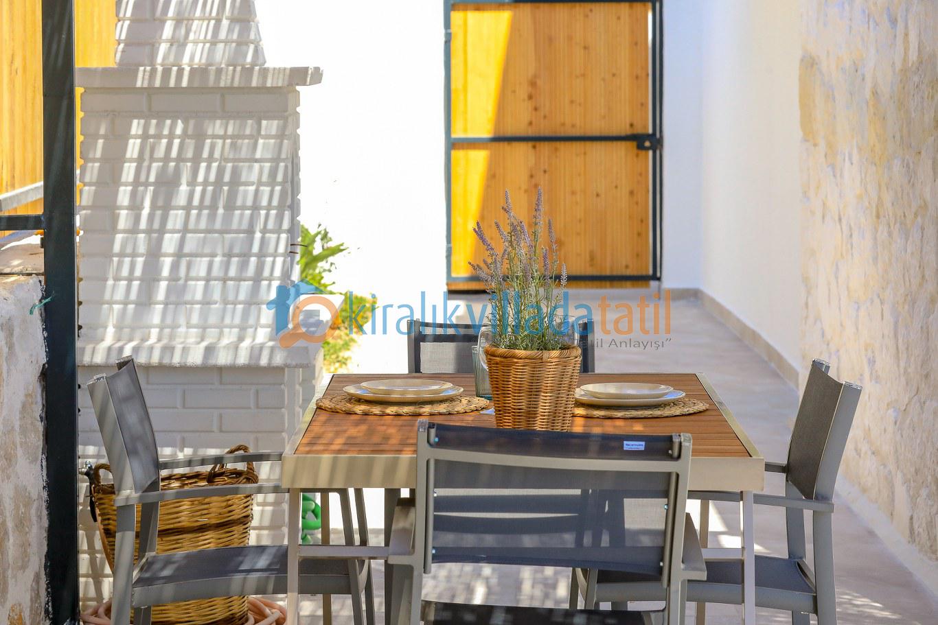 Villanın yüksek duvarlarla çevrili, tamamen korunaklı villa konseptine sahip geniş bahçesi; yaz sıcaklarında serinleyebileceğiniz özel yüzme havuzu, şezlonglar, güneş şemsiyeleri, oturma alanı, salıncak, barbekü ve yemek masası gibi birçok konforlu donanımla zenginleştirilmiştir. Bu yapı, dışarıdan görünmeden tatil yapmak isteyen muhafazakâr villa tercih eden misafirler için büyük avantaj sağlar.