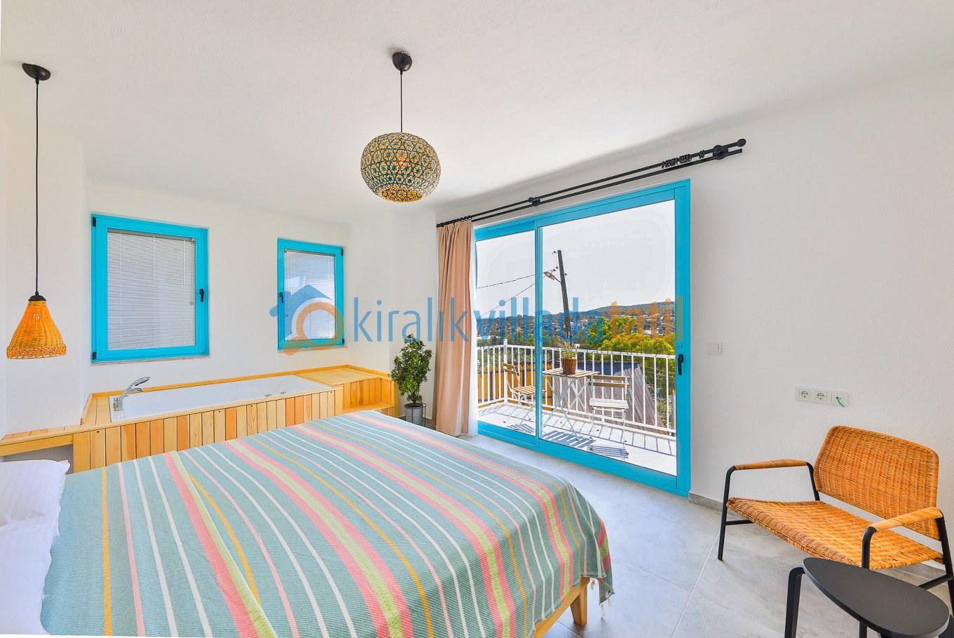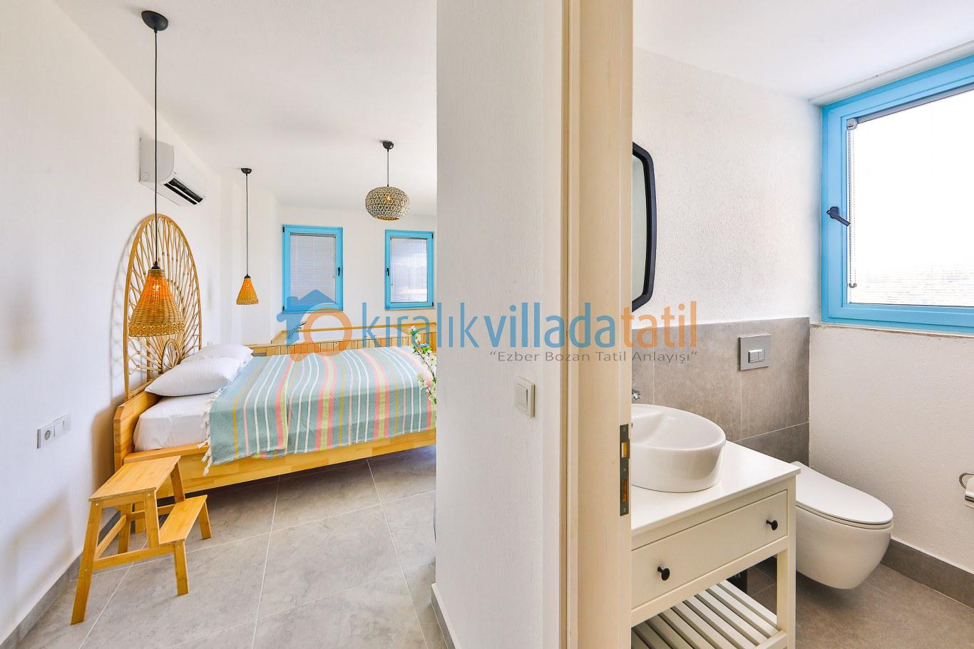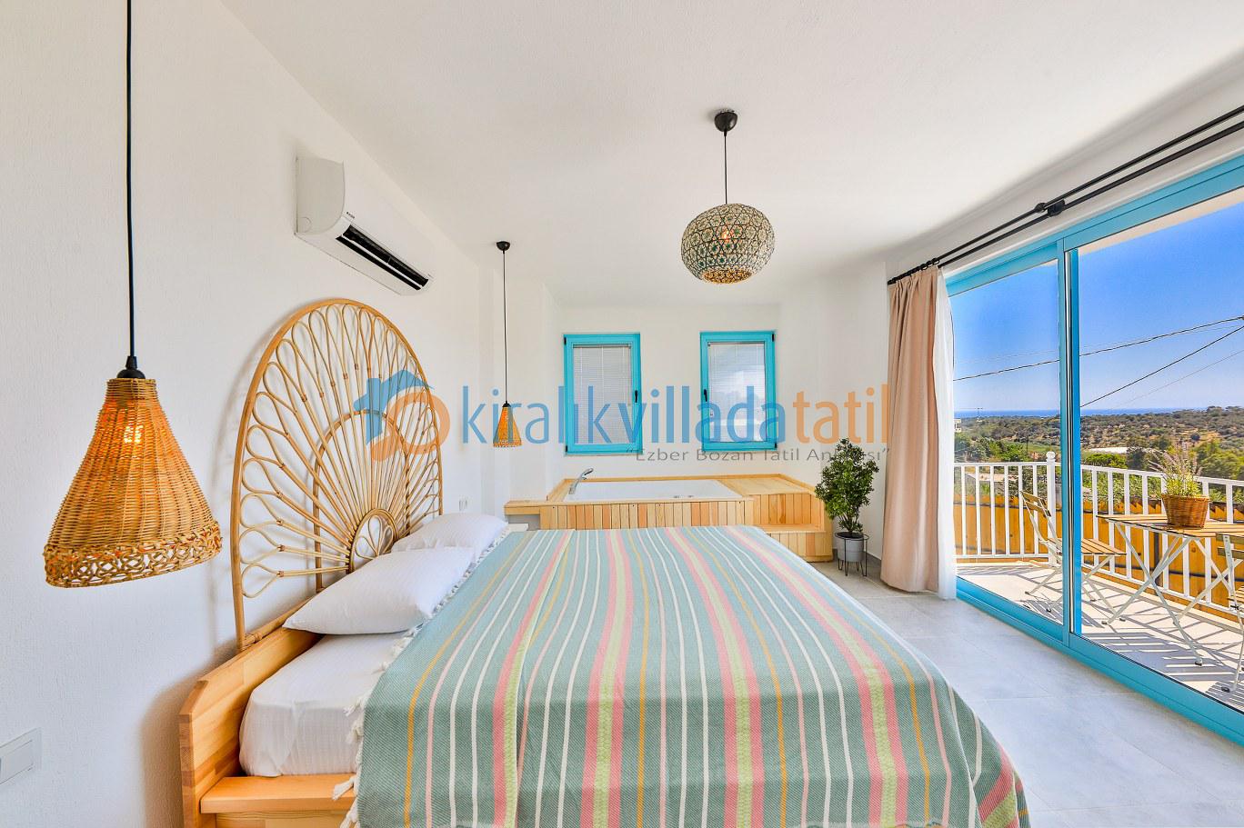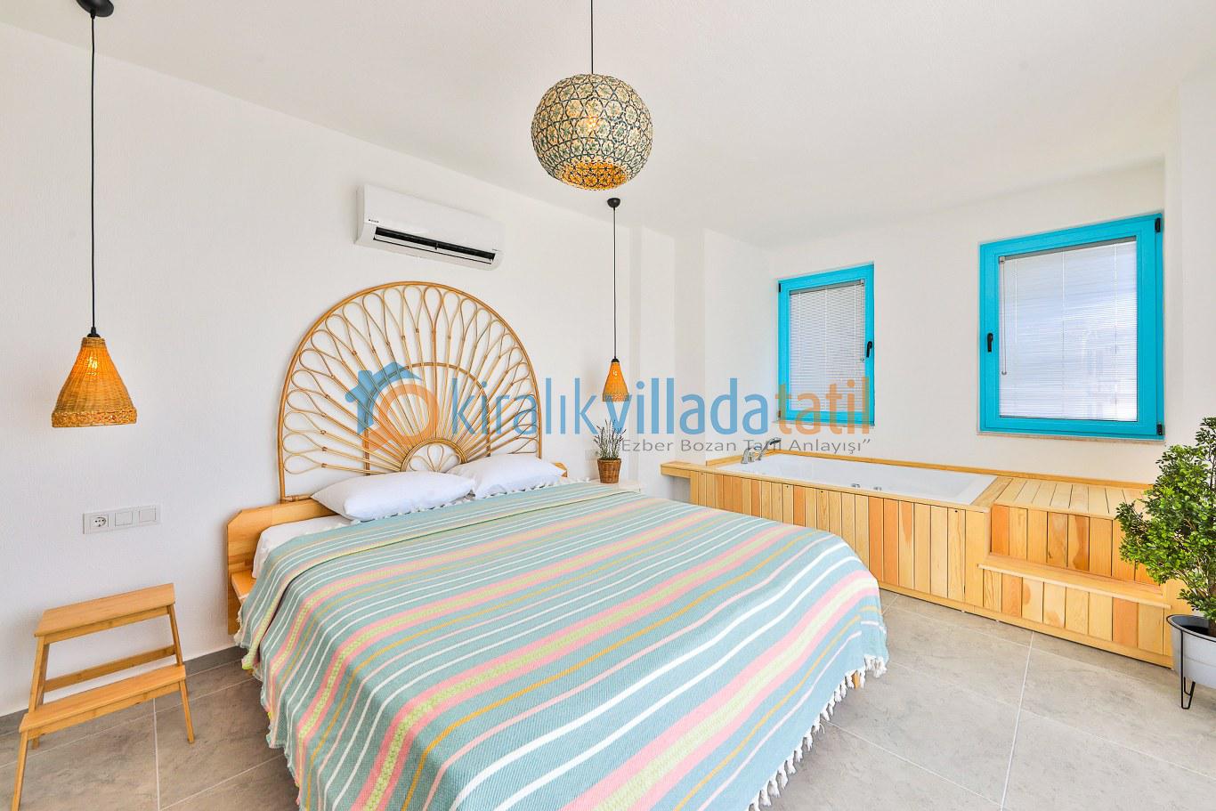 Yatak odası; çift kişilik yatak, klima, elbise dolabı, makyaj masası, komodin, saç kurutma makinesi, televizyon ve odanın içinde yer alan geniş jakuziyle donatılmıştır. Kendine ait banyo ve tuvaleti bulunan bu oda, romantik bir tatil arayan çiftler için kusursuz bir alan sunar.
