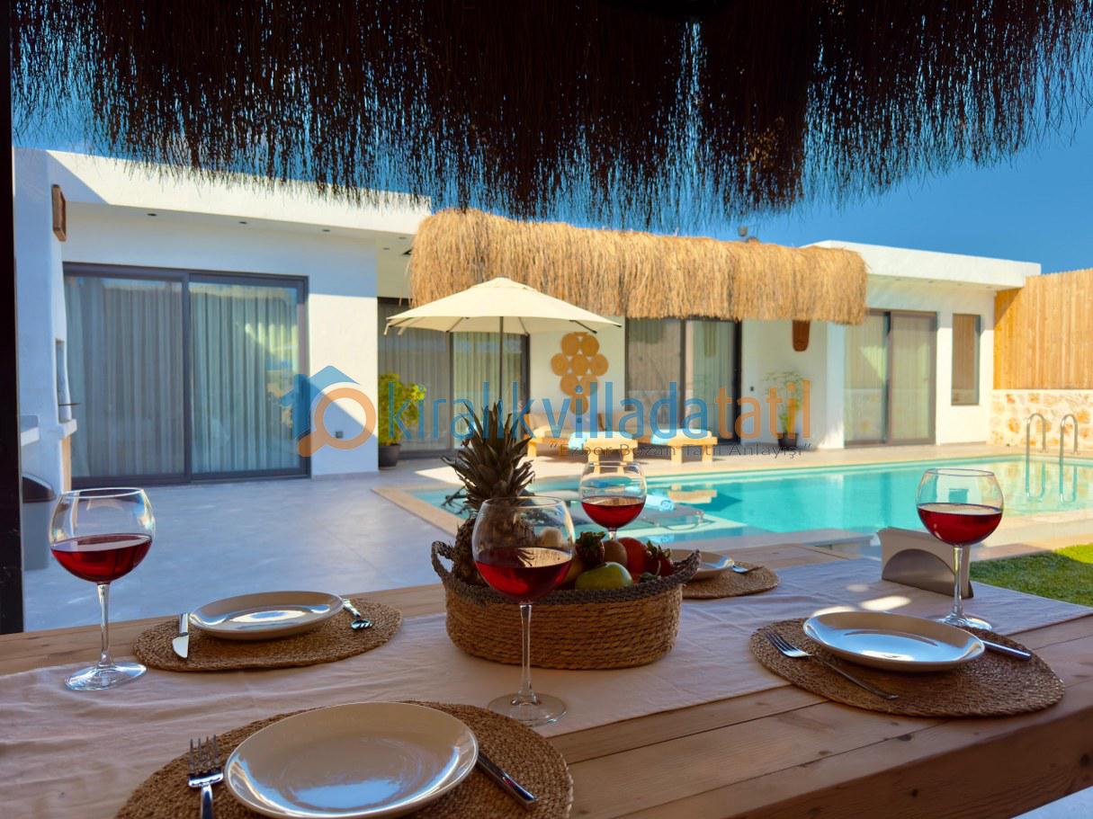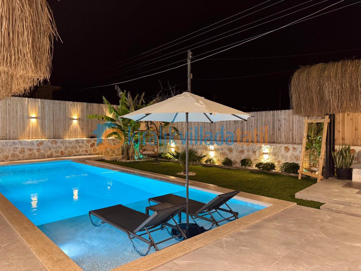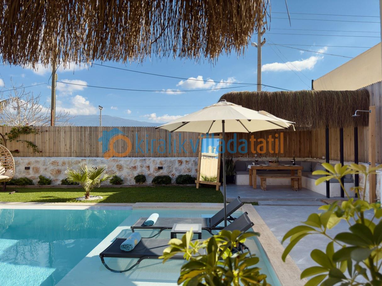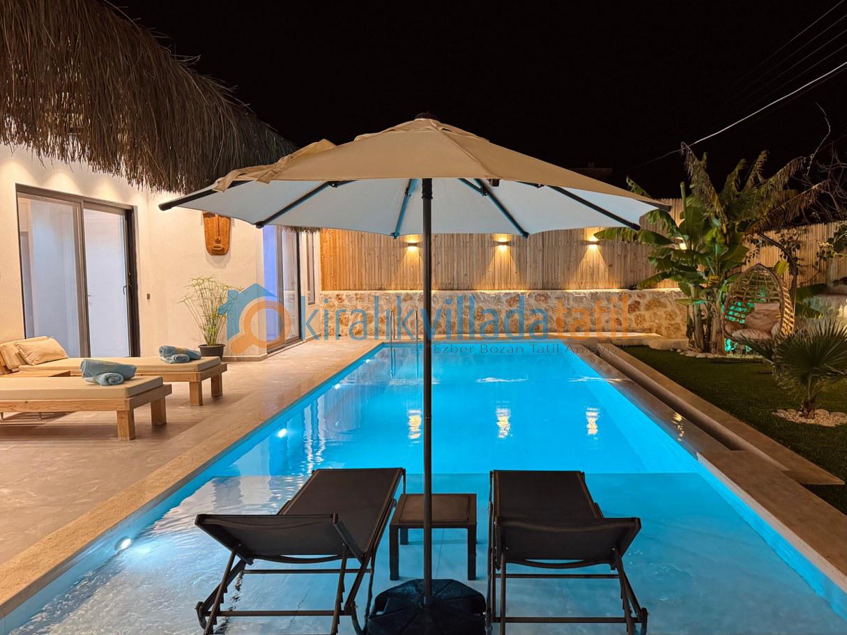 Villanın korunaklı yapısı, dış havuz alanının dışarıdan görünmesini engelleyerek muhafazakâr aileler için güvenli ve rahat bir tatil ortamı sunar. Doğayla iç içe bir atmosferde, sakinlik ve huzur arayan misafirler için ideal bir kiralık villa deneyimi sağlar.