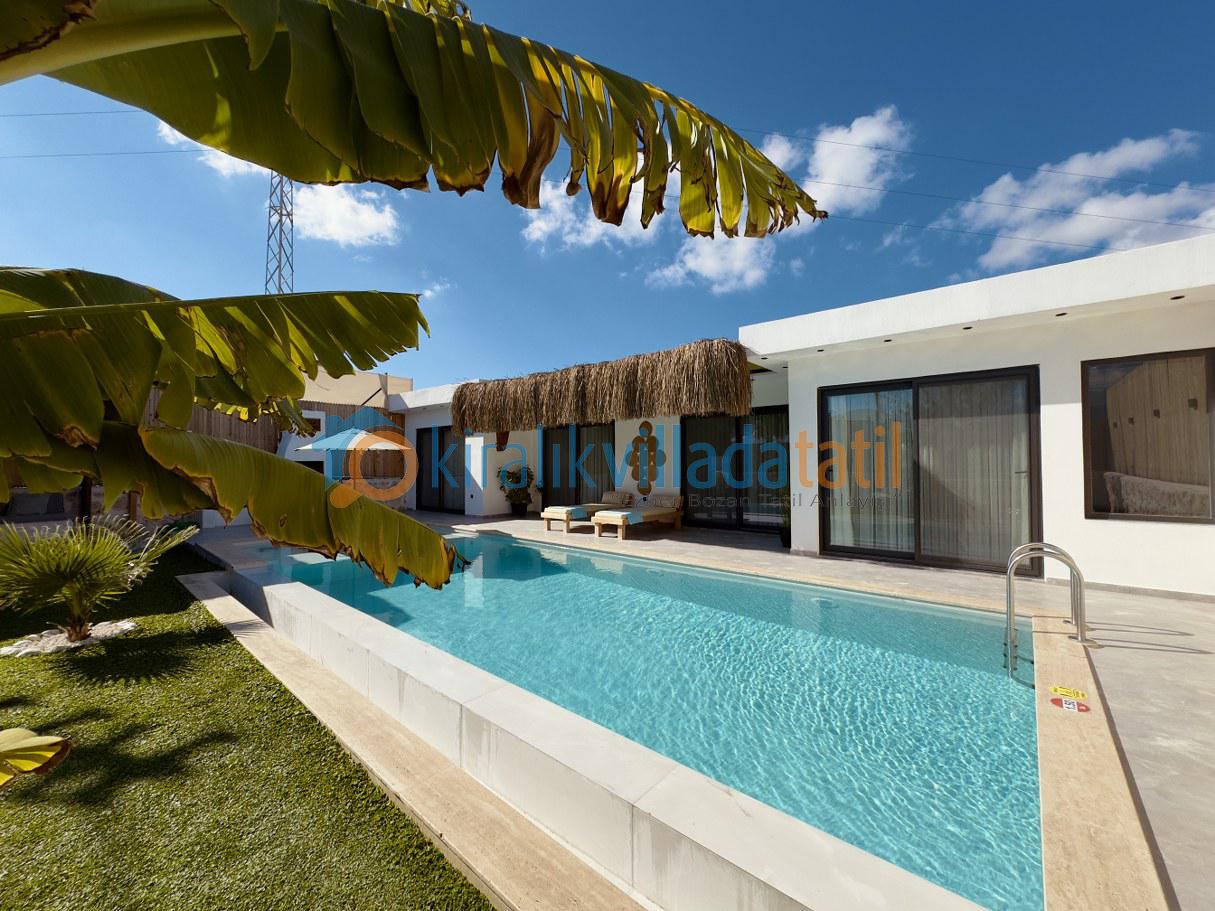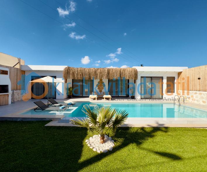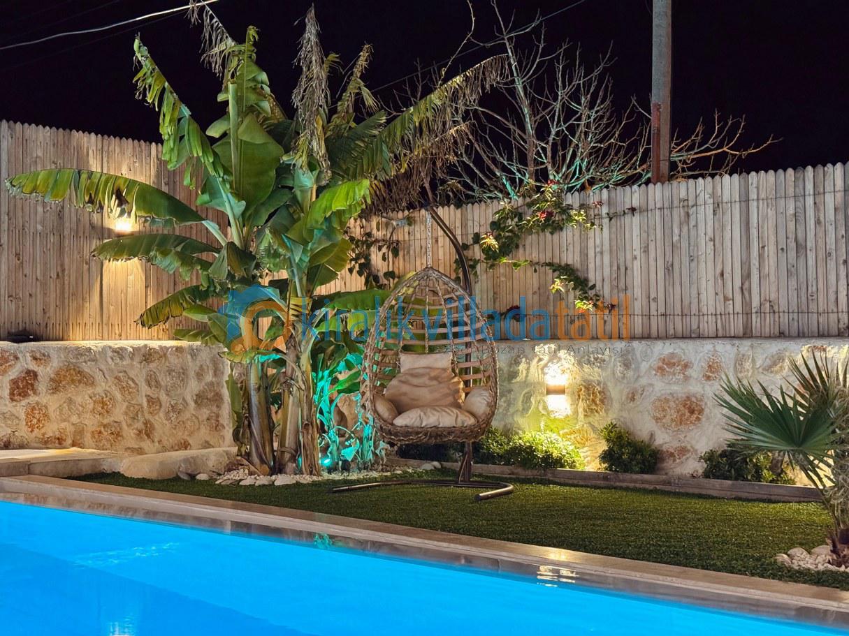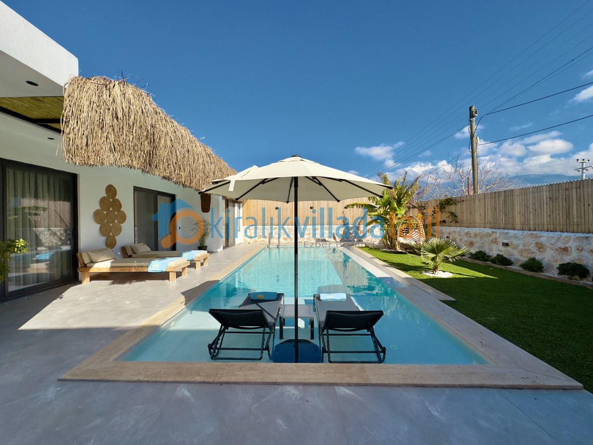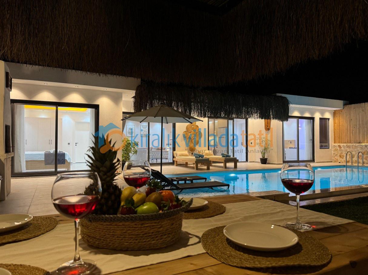 Villanın korunaklı yapısı, dış havuz alanının dışarıdan görünmesini engelleyerek muhafazakâr aileler için güvenli ve rahat bir tatil ortamı sunar. Doğayla iç içe bir atmosferde, sakinlik ve huzur arayan misafirler için ideal bir kiralık villa deneyimi sağlar.