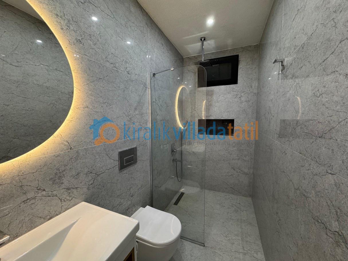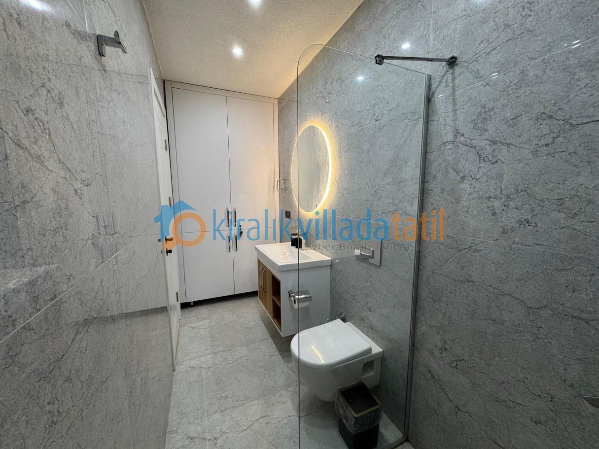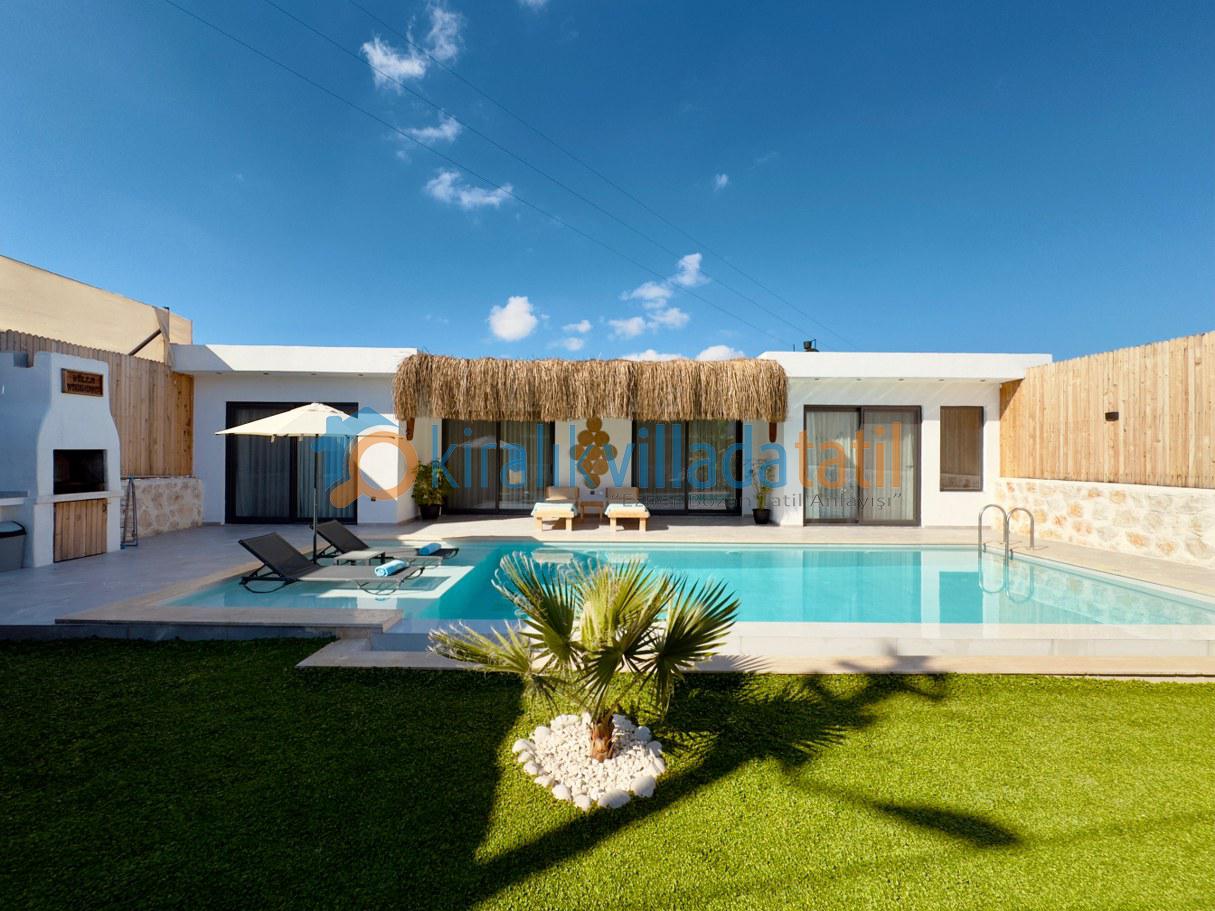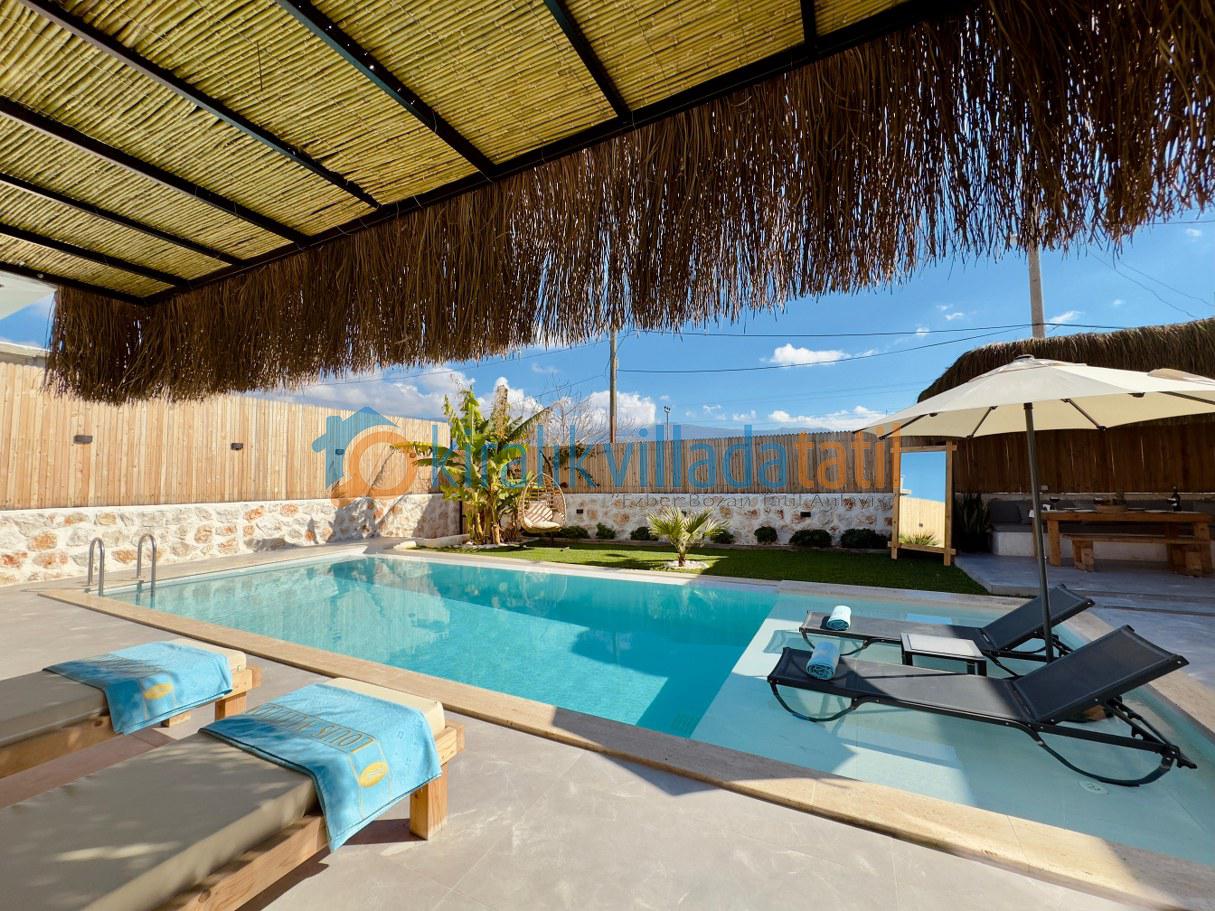 Villanın korunaklı yapısı, dış havuz alanının dışarıdan görünmesini engelleyerek muhafazakâr aileler için güvenli ve rahat bir tatil ortamı sunar. Doğayla iç içe bir atmosferde, sakinlik ve huzur arayan misafirler için ideal bir kiralık villa deneyimi sağlar.