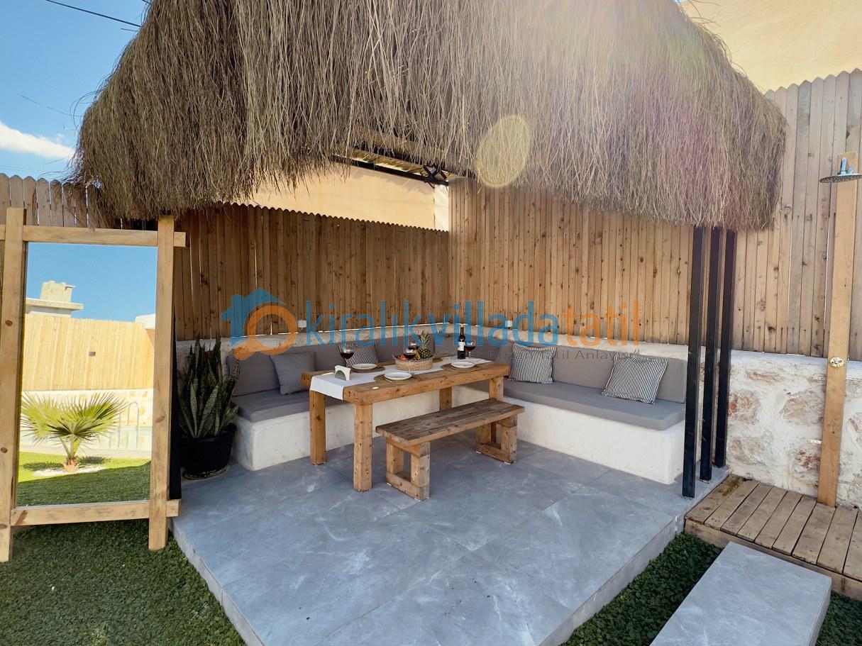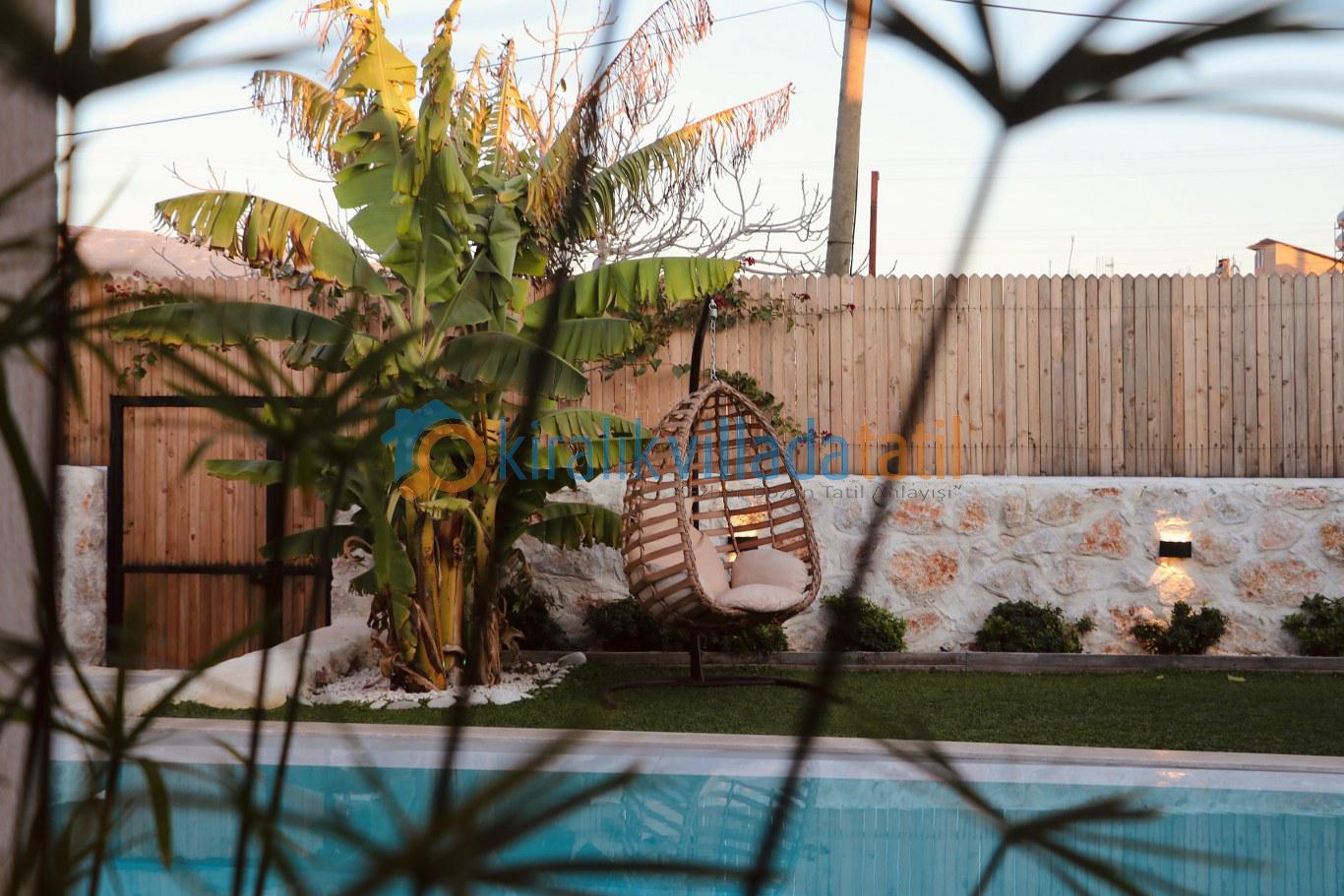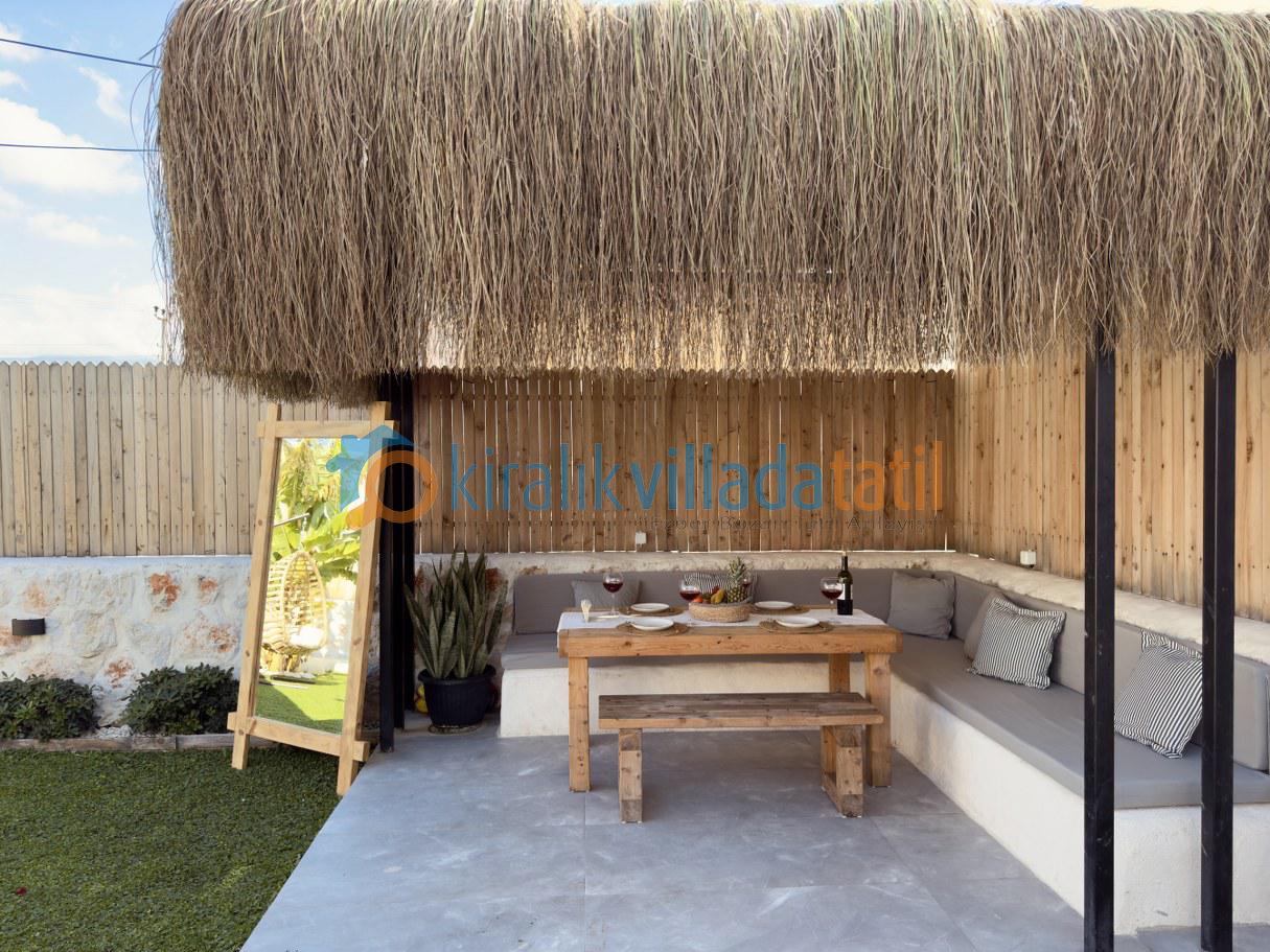 Bahçe alanı tamamen misafir kullanımına özel olup dışarıdan görünmeyecek şekilde tasarlanmıştır. Geniş havuz terası, güneşlenme alanı, yemek köşesi ve keyifli akşamlar için ideal açık hava oturma alanı bulunmaktadır. Korunaklı villa kategorisinde yer alması, misafirlerin tatil boyunca gönül rahatlığıyla vakit geçirmesini sağlar.