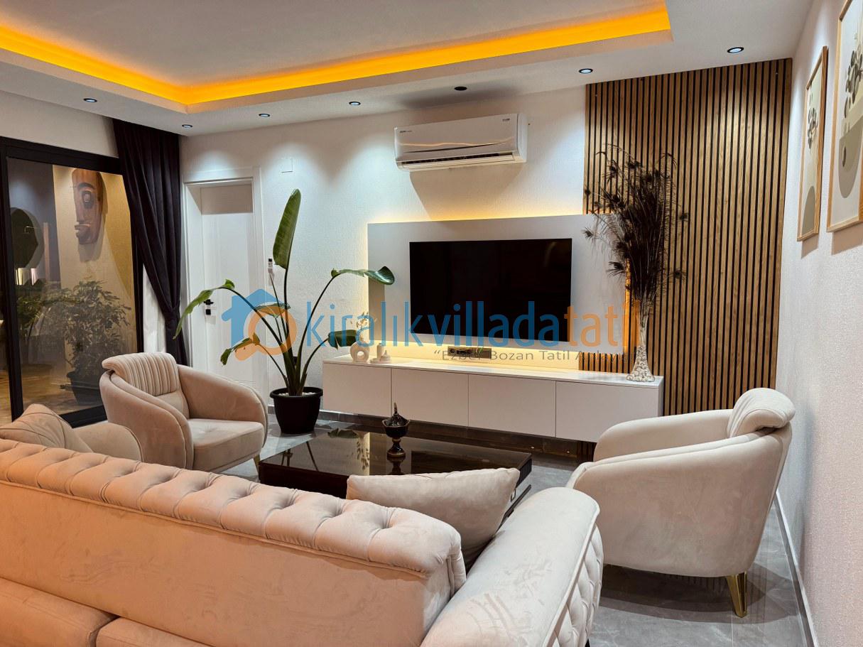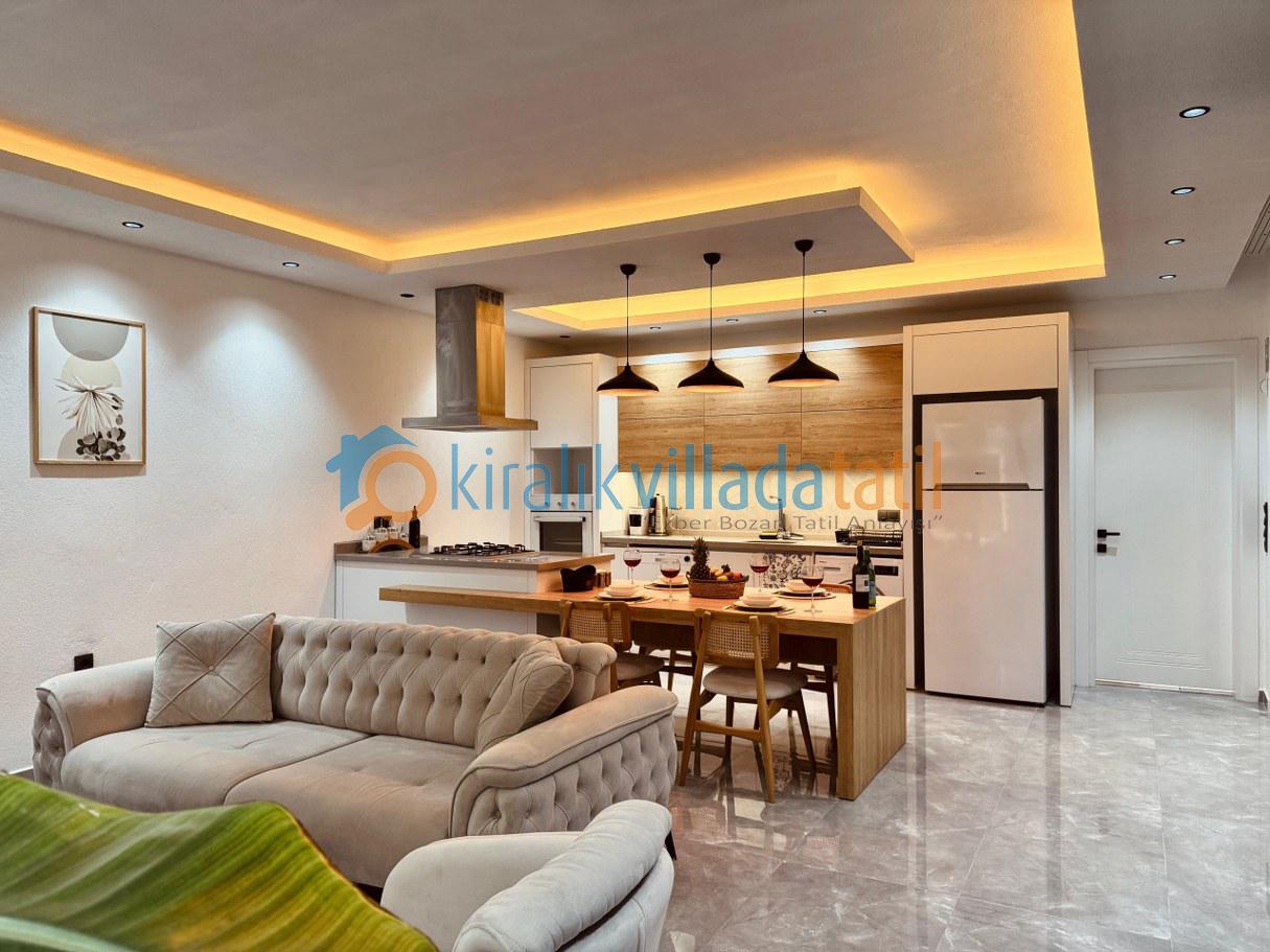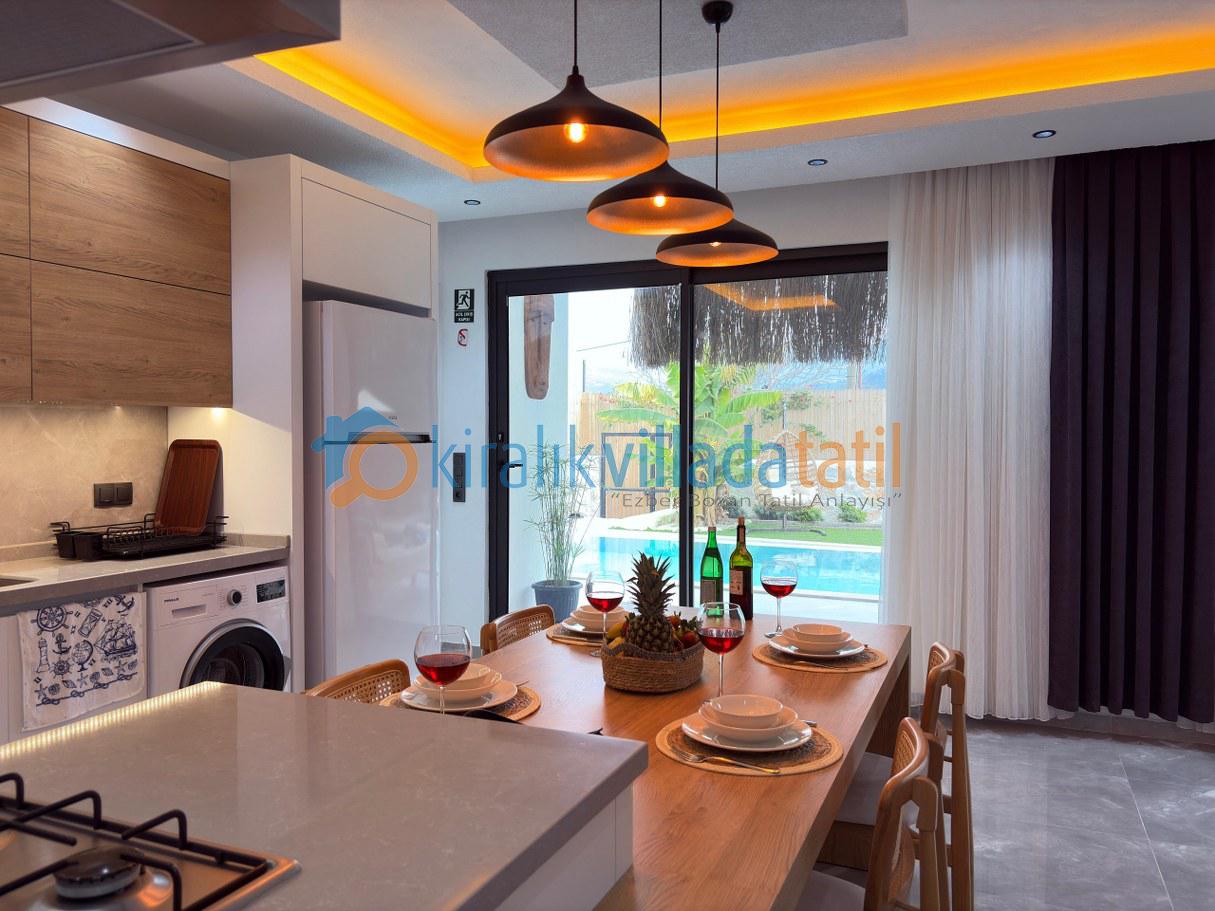Villanın tam donanımlı açık mutfağı ve konforlu salonu, ev konforunu tatilde de yaşamak isteyen misafirler için tüm ihtiyaçlara cevap verir. Oturma alanından havuz terasına direkt çıkış olması, özellikle yaz aylarında büyük kolaylık sağlar.