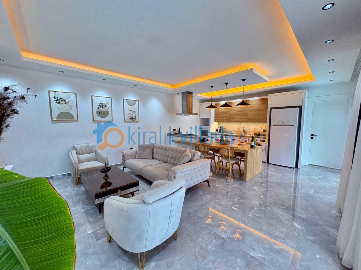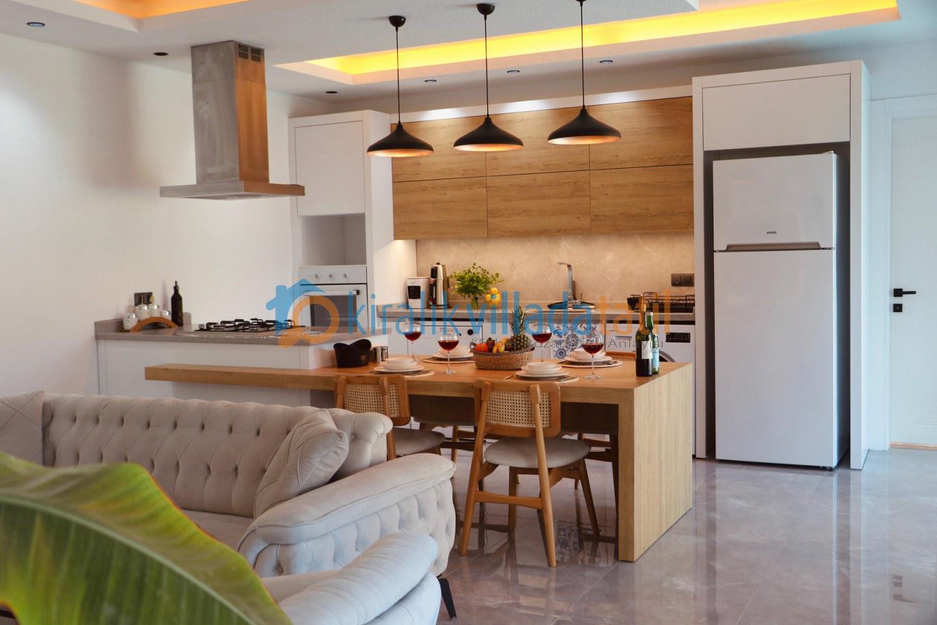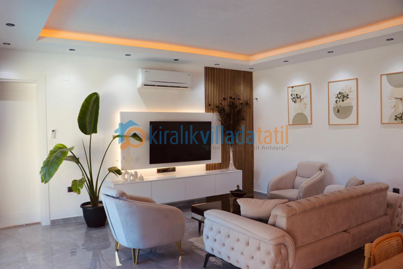 Villanın tam donanımlı açık mutfağı ve konforlu salonu, ev konforunu tatilde de yaşamak isteyen misafirler için tüm ihtiyaçlara cevap verir. Oturma alanından havuz terasına direkt çıkış olması, özellikle yaz aylarında büyük kolaylık sağlar.