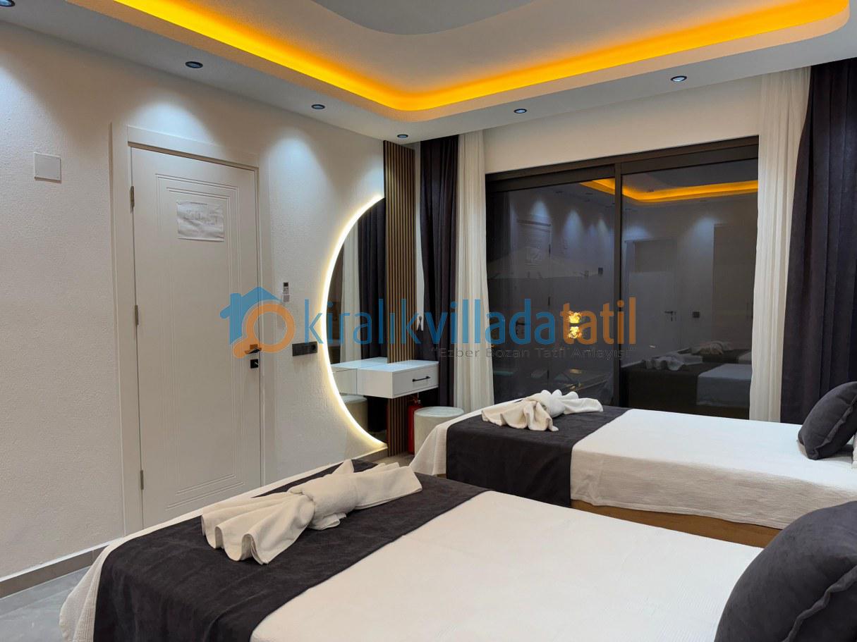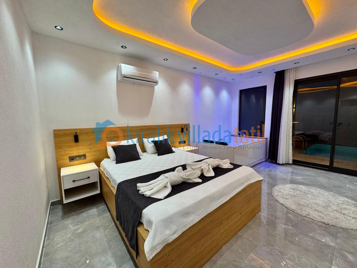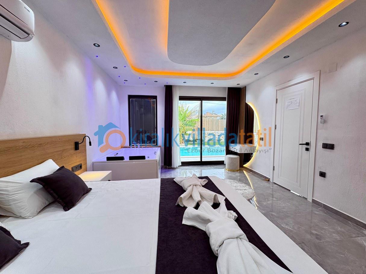 Şık ve modern iç dekorasyonuyla dikkat çeken villanın ana yatak odasında özel jakuzi bulunur. Bu özellik, romantik ve keyif dolu bir konaklama arayan misafirler için büyük avantaj sağlar. Geniş yaşam alanları, ferah odalar ve özel havuzuyla villa, lüks villa kategorisinde yılın her döneminde tercih edilen seçeneklerden biridir.