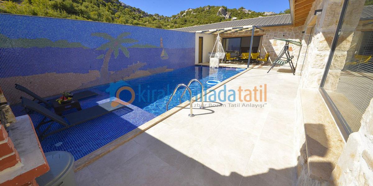 Bu ilan ait Detaylı açıklama ve bilinmesi gereken detaylarKalkan Sarıbelen mevkiinde olan villamız 2 yatak odası olup 4 kişilik kapasiteye sahiptir.Villamız taş mimarisi kullanılarak dizayn edilmiş, havuz alanı ve bahçesi dışarıdan görülmeyecek şekilde tasarlanmıştır.Villamız muhafazakar ailelerimiz için uygunudur.Jakuzili villa olma özelliğine de sahip olan kiralık villamız balayı çiftlerimiz içinde tercih ediliyor.Villamızın bahçe kısmında Özel yüzme havuzu, şezlong, şemsiye, salıncak, oturma grubu, yemek masası, langırt ve barbekü bulunmaktadır.