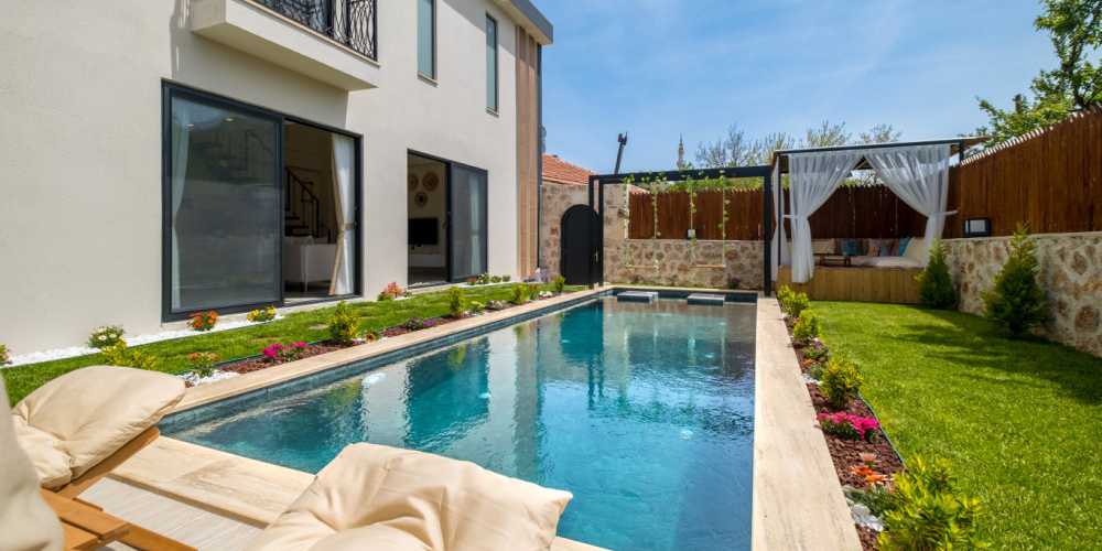 Villamızın havuz alanı yüksek duvarlar ve çitlerle çevrili olup dışarıdan görünmeyecek şekilde korunaklı olarak tasarlanmıştır. bu sayede mahremiyetine önem veren misafirler için rahat bir tatil ortamı sağlanmaktadır. korunaklı yapısı sayesinde özellikle muhafazakar balayı tatili planlayan çiftler için oldukça uygun bir konaklama seçeneği sunmaktadır.