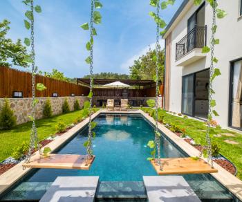 Bu ilan ait Detaylı açıklama ve bilinmesi gereken detaylar2023 yılında inşa edilen bu özel havuzlu ve özellikli tatil villası, Kaş’ın Sarıbelen mahallesinde yer almaktadır. Her detayı titizlikle tasarlanmış olan bu lüks balayı villası, havuz alanının yüksek çitler ve duvarlarla çevrili olması sayesinde dış dünyadan tamamen izole bir ortam sunmaktadır.