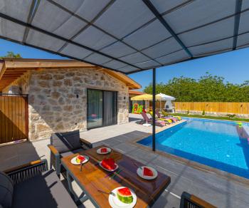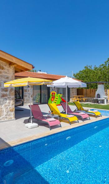 Villanın mutfağı, tam donanımlı olarak tasarlanmış ve yemek yapımı yedi misafirin ihtiyacı duyulabilecek tüm araç gereçlere sahiptir. Modern oturma grubu, büyük bir televizyon ve klima ile donatılmış geniş salon ise, günün yorgunluğunu üzerinizden atabileceğiniz sıcak bir ortam sağlar.