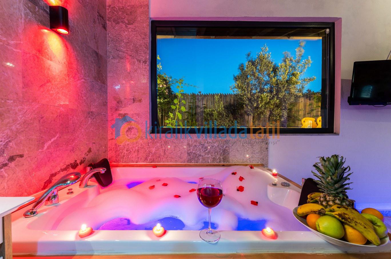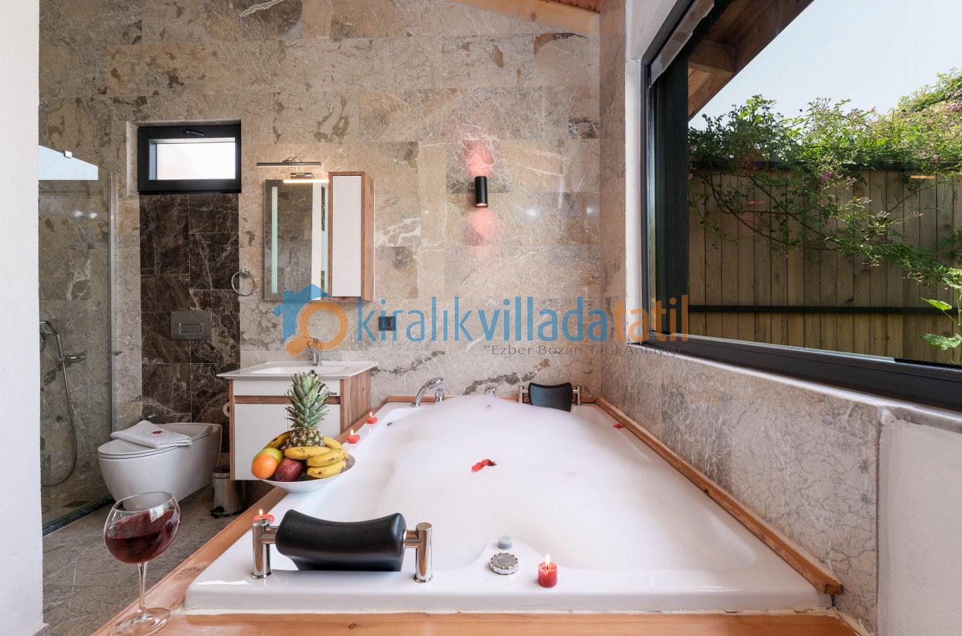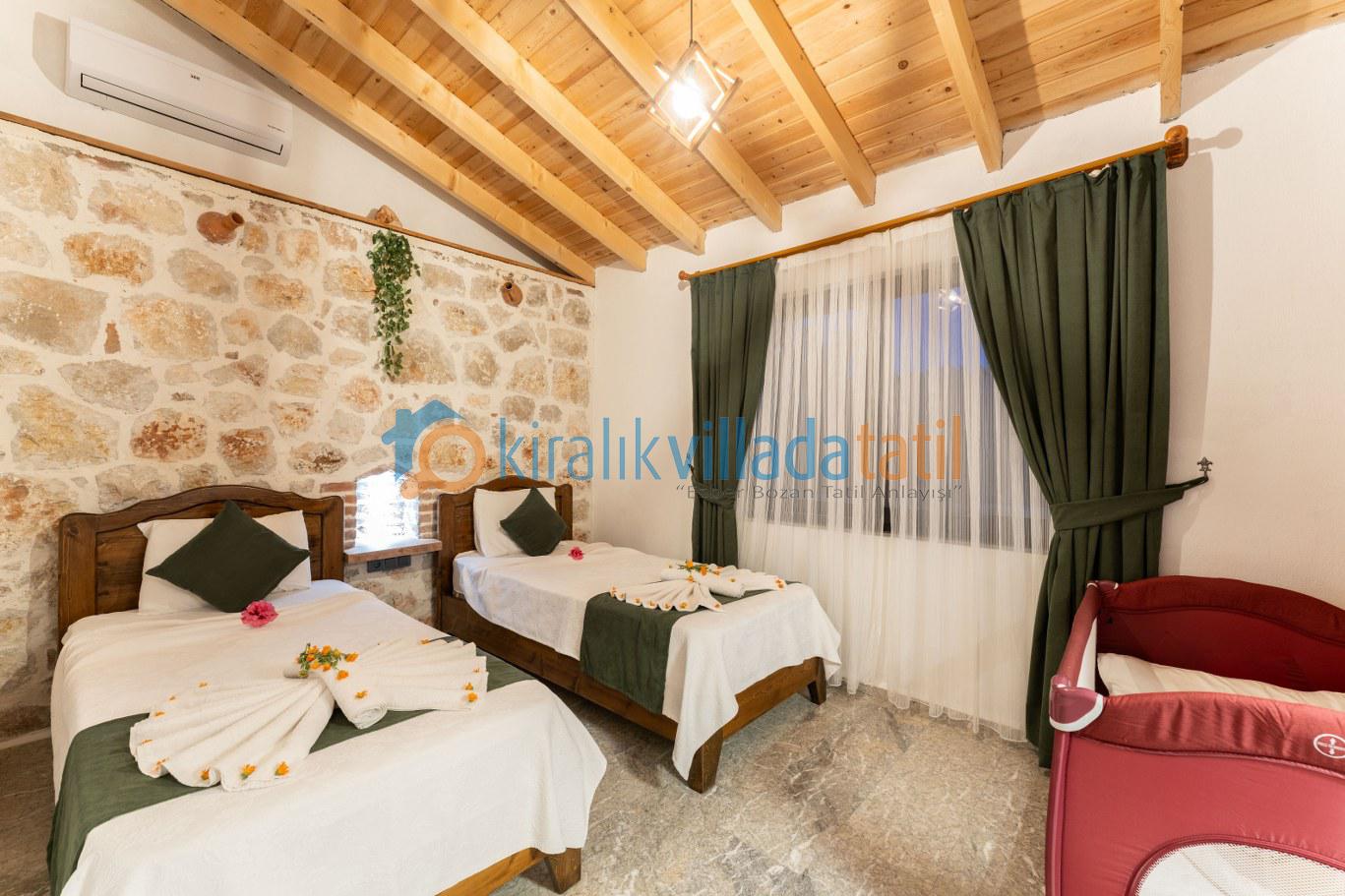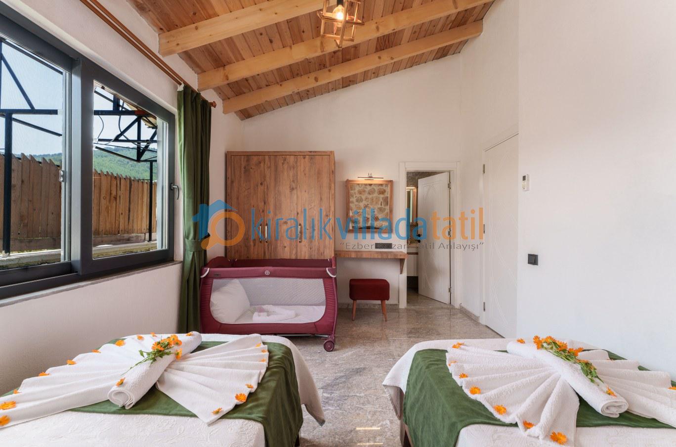 Bir yatak odası çift kişilik yataklı diğer yatak odası ise iki adet tek kişilik yataklı olan villanın, her iki yatak odasında da kendisine ait banyo lavabo bulunmaktadır. Aynı zamanda ebebeyn yatak odasında jakuzi de mevcuttur.