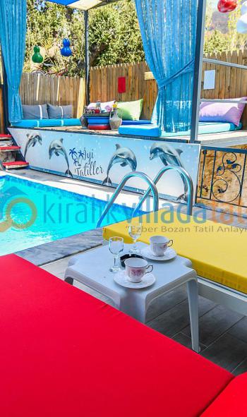 Geniş güneşlenme terasında ve balkon kısmında iki adet şezlong ve rahat oturma alanları yer alır. Gün boyunca sessizlik ve kuş sesleri eşliğinde güneşlenebilir, akşamları gökyüzünde yıldızları izleyebilirsiniz. Villamızın en önemli özelliği ise tam korunaklı yapısıdır. Havuz ve bahçe alanı dışarıdan görünmez şekilde dizayn edildiği için özellikle muhafazakâr aileler ve balayı çiftleri için mükemmel bir konaklama seçeneğidir.