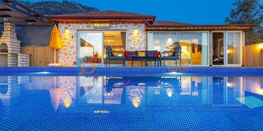 Villamız Üzümlü köyünün çıkışında bulunmakta olup, köy merkezine yaklaşık 2 km, Kalkan şehir merkezine ise 10 Km mesafede bulunmaktadır. Tek kat plana sahip olan villamızda Oturma odası, Açık plan bir mutfak, Yatak odası ve banyosu bulunmaktadır. Geniş havuz terasında gölgelik pergola, yemek masası ve sandalyeler, sığ havuz içinde 2 adet şezlong ve şemsiye ve bir adet oturma grubu vardır. Villamız içinde ihtiyacınız olan tüm mobilya mutfak araç gereçleri ütü saç kurutma makinesine kadar mevcuttur.