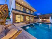Modern ve lüks bir tarzda dekore edilmiş olan bu villa, çift katlı mimarisi ve kaliteli mobilyalarıyla öne çıkmaktadır. Villanın geniş ve ferah iç mekanları, konforlu ve şık bir yaşam alanı yaratır. Her odada özenle seçilmiş eşyalar ve modern tasarımlar, misafirlerimize evlerindeymiş gibi rahat bir tatil geçirme imkanı sağlar.