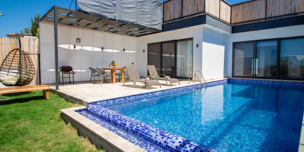 Doğa içinde sakin konumu, korunaklı havuz yapısı, kapalı ısıtmalı havuz sistemi, jakuzi ve özgün mimari detaylarıyla bu balayı villası, Kalkan Üzümlü bölgesinde romantik ve özel bir tatil planlayan çiftler için ideal bir seçenek sunmaktadır.