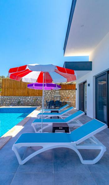 Villamızda rahat edebilmeniz için tüm detaylar düşünüldü. Tam donanımlı mutfak, ücretsiz Wi-Fi, klima, güvenlik kamerası, barbekü alanı, şezlong ve şemsiyeler gibi olanaklar, konforlu ve keyifli bir tatil için gerekli tüm detayları sunuyor.
