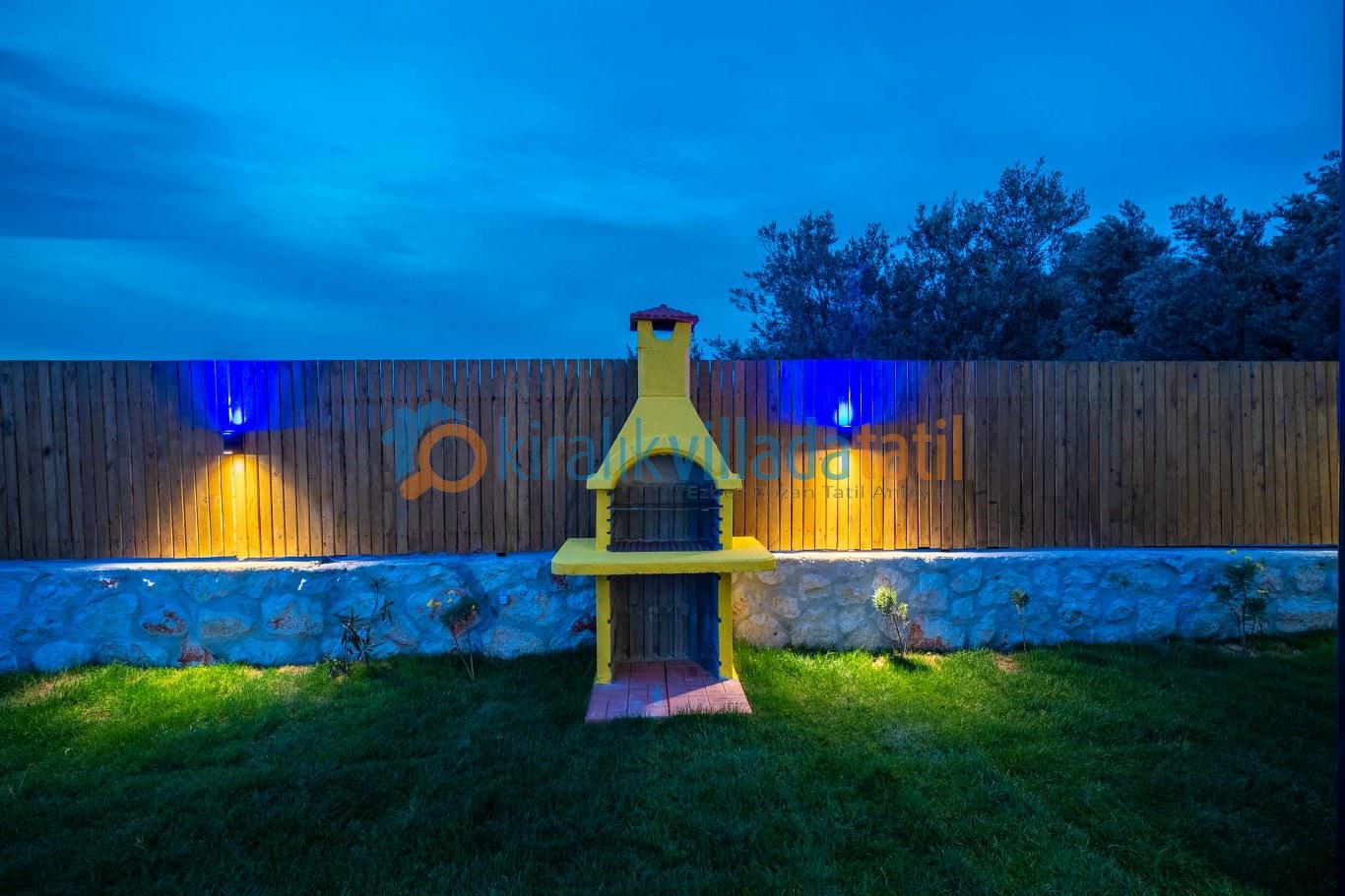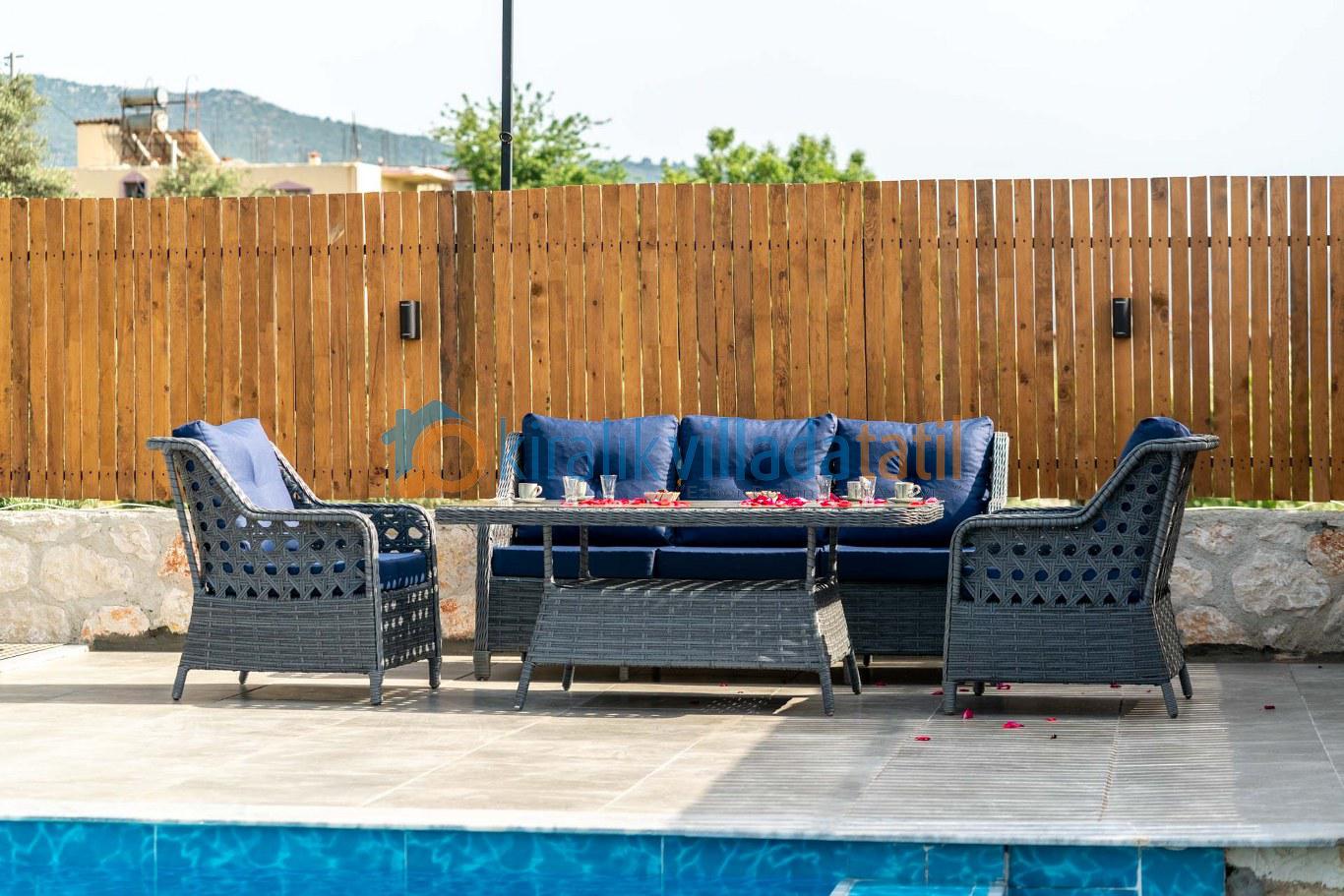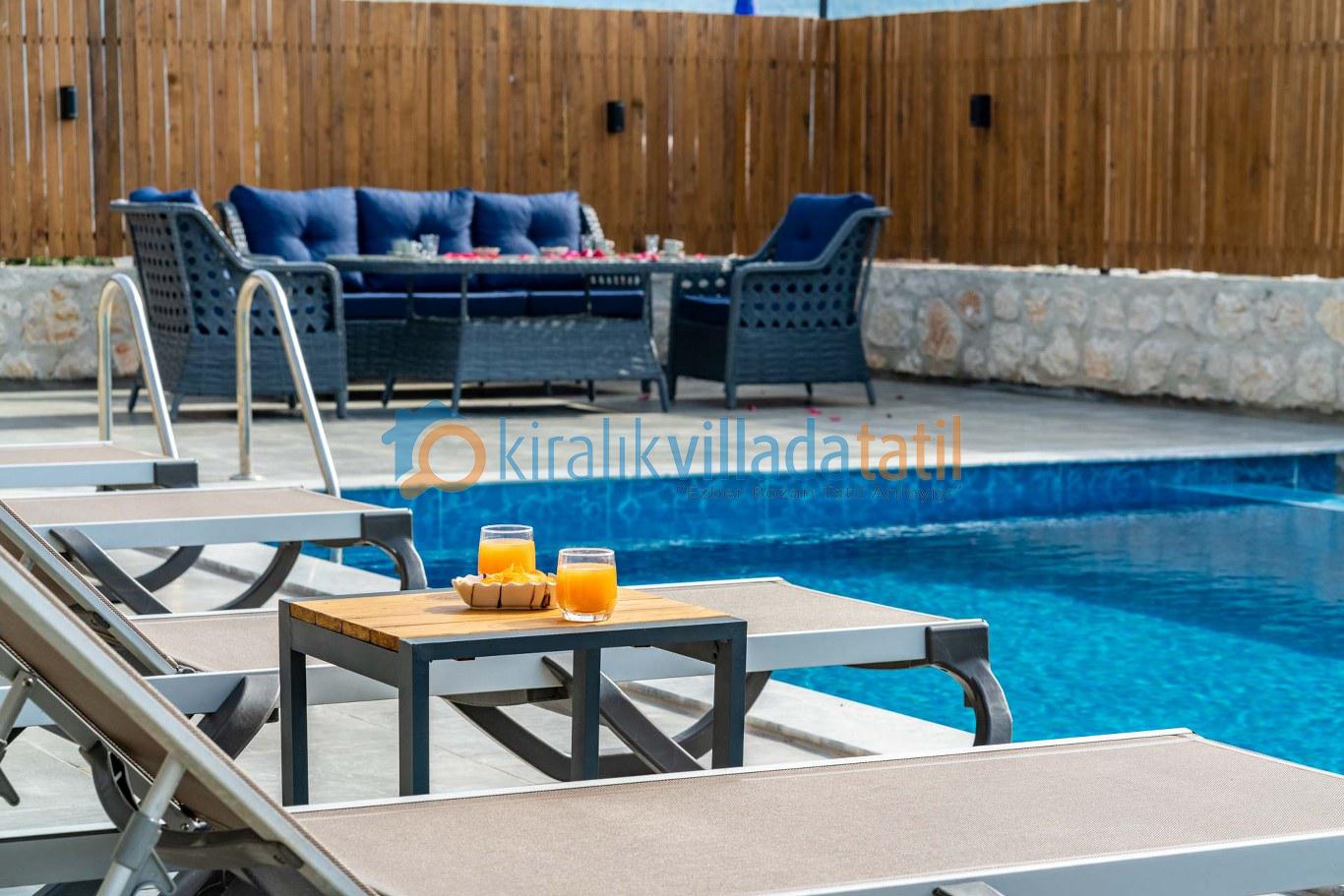 Villanın geniş bahçesinde oturma grubu, yemek masası, barbekü alanı, şezlonglar ve salıncak bulunur. Korunaklı özel havuz, hem mahremiyet hem de güvenlik açısından tatilinizde en büyük rahatlığı sağlar. Havuz ölçüleri 4 x 10 metre olup 1.55 metre derinliğe sahiptir.