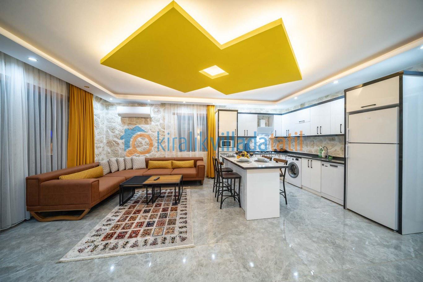 Villanın modern salon alanı, geniş oturma grubu, klima, televizyon, uydu sistemi ve kablosuz internet gibi tatil boyunca ihtiyaç duyacağınız tüm imkanları sunar. Havuz terasına direkt çıkış sağlayan salon, hem gündüz hem gece keyifle vakit geçirebileceğiniz ferah bir yaşam alanına sahiptir.