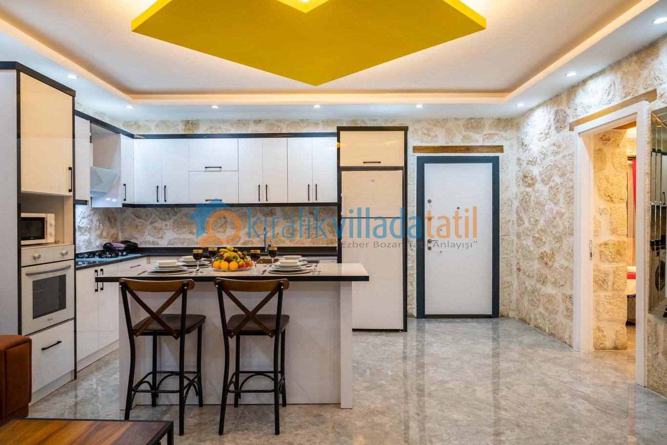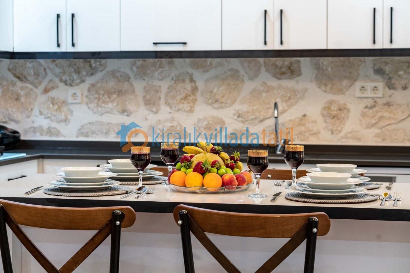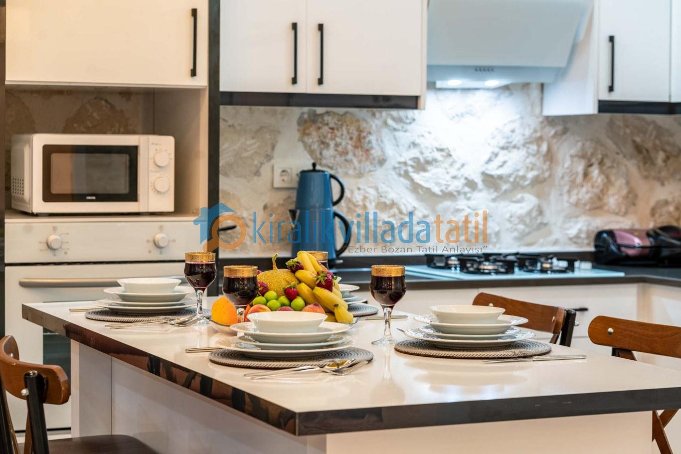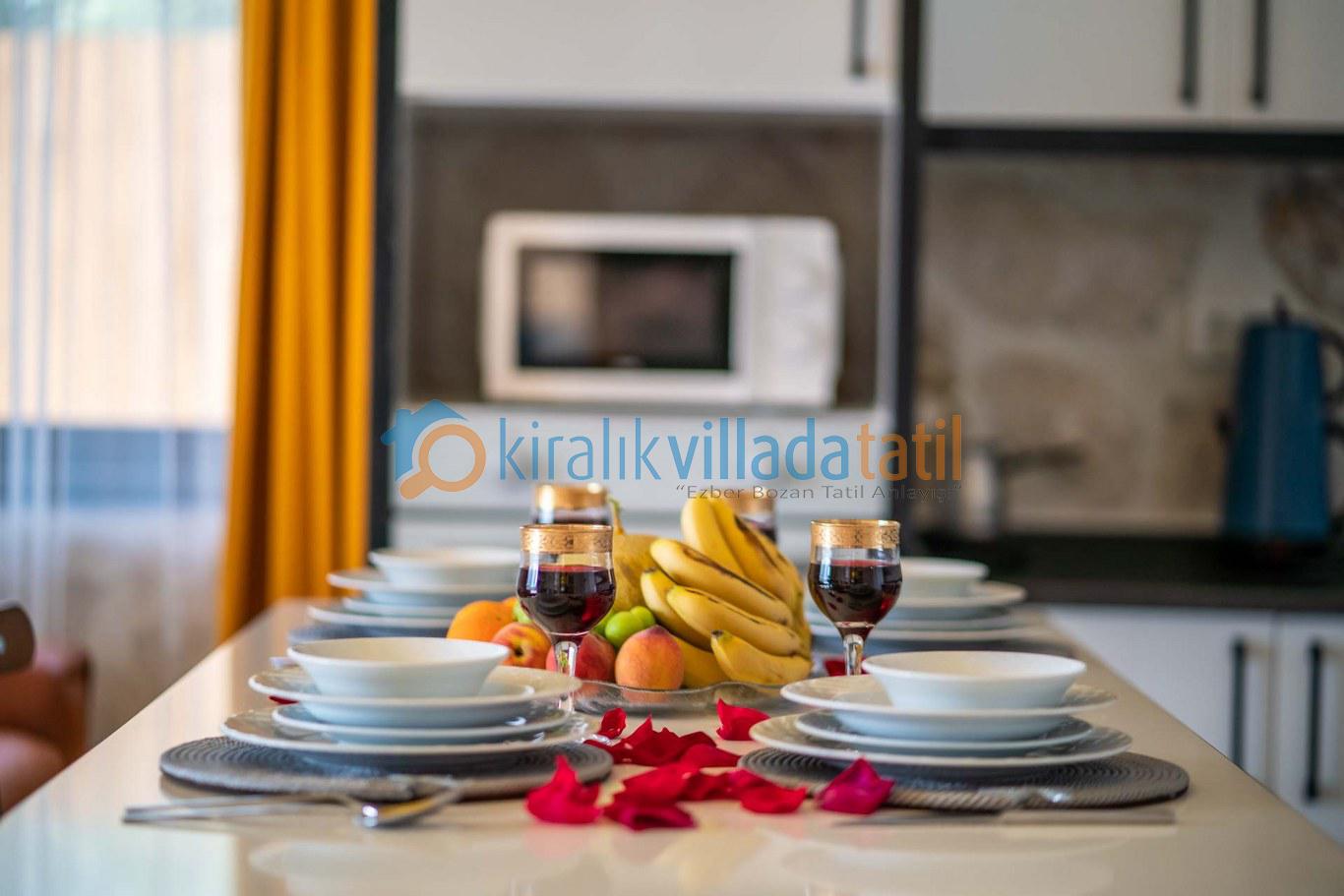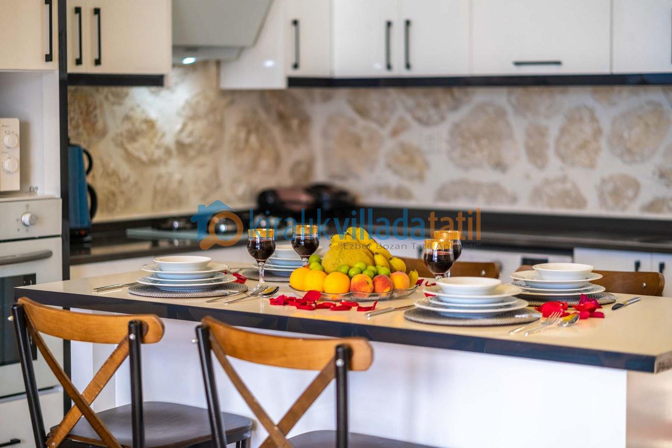 Amerikan mutfak konseptiyle tasarlanan iç mekânda; buzdolabı, bulaşık makinesi, ocak, fırın, çamaşır makinesi, mikrodalga, su ısıtıcısı, kahve makinesi, yemek takımları ve tüm mutfak gereçleri eksiksiz olarak yer almaktadır. Tatiliniz boyunca dilediğiniz gibi yemek hazırlayabilir ve özgürce vakit geçirebilirsiniz.