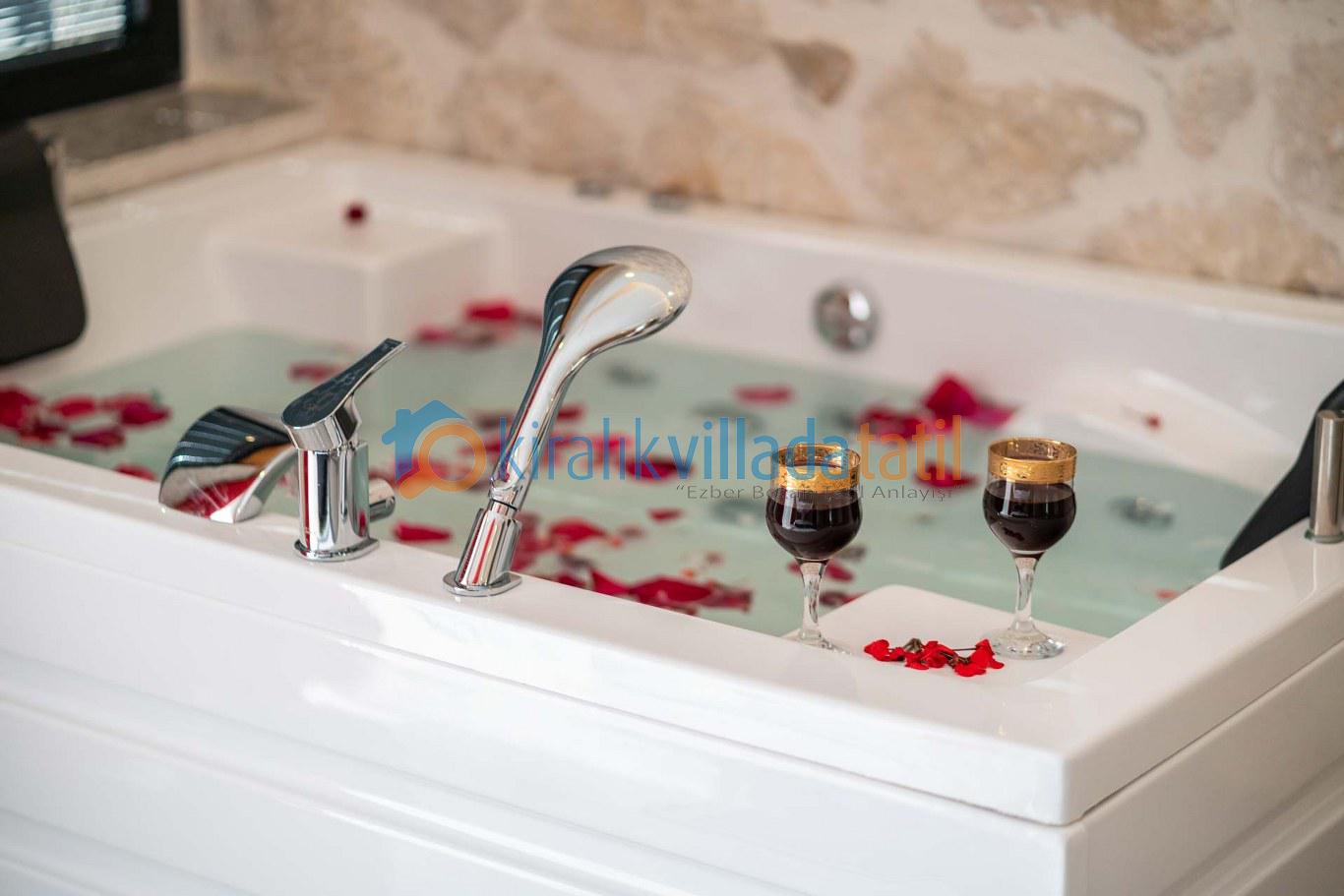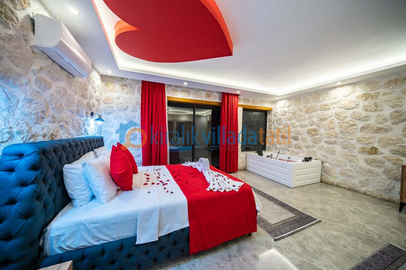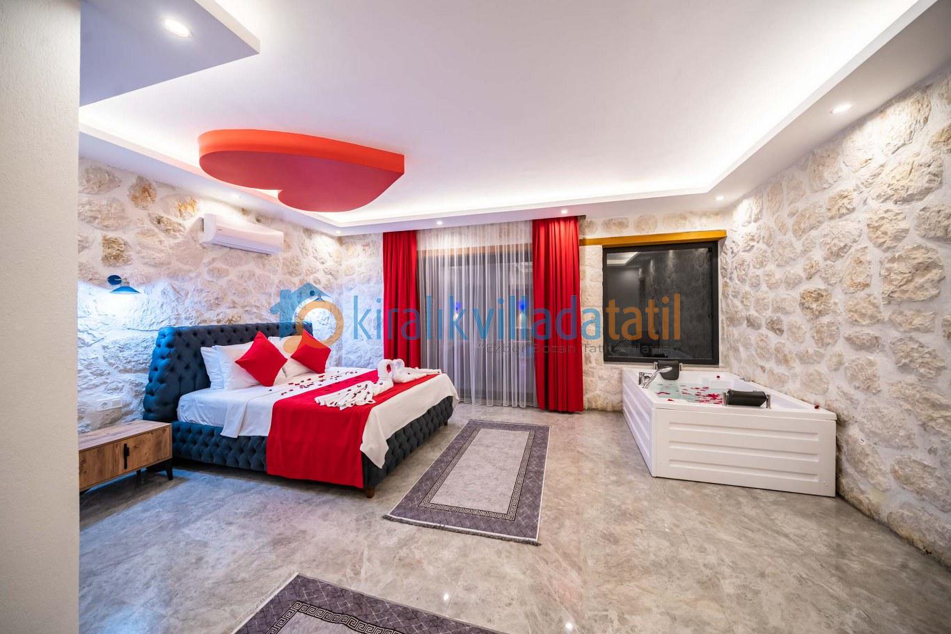• 1. Yatak Odası: Çift kişilik yatak, klima, elbise dolabı, makyaj masası, komodin, özel banyo ve oda içinde jakuzi bulunmaktadır.