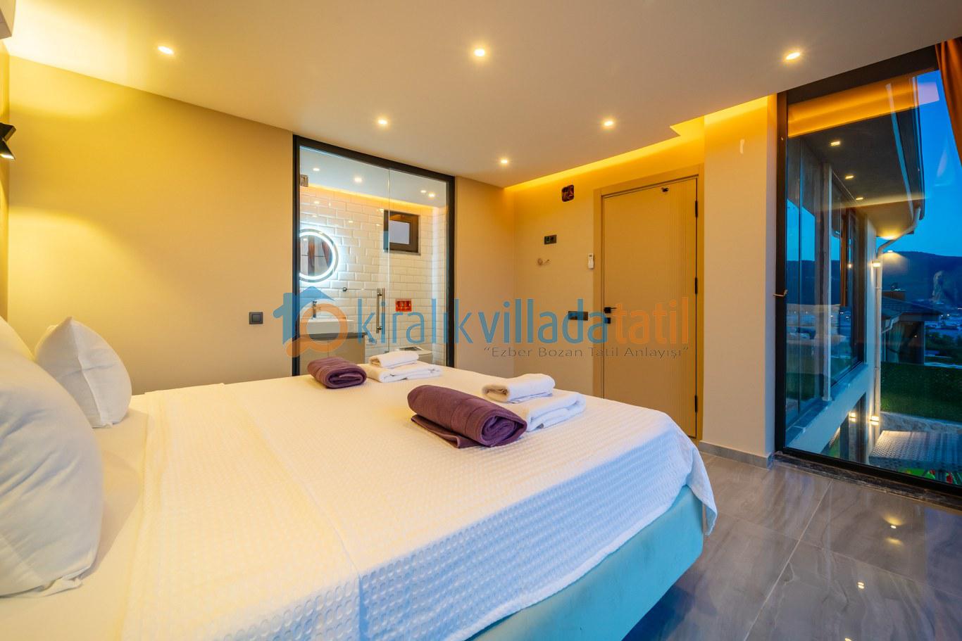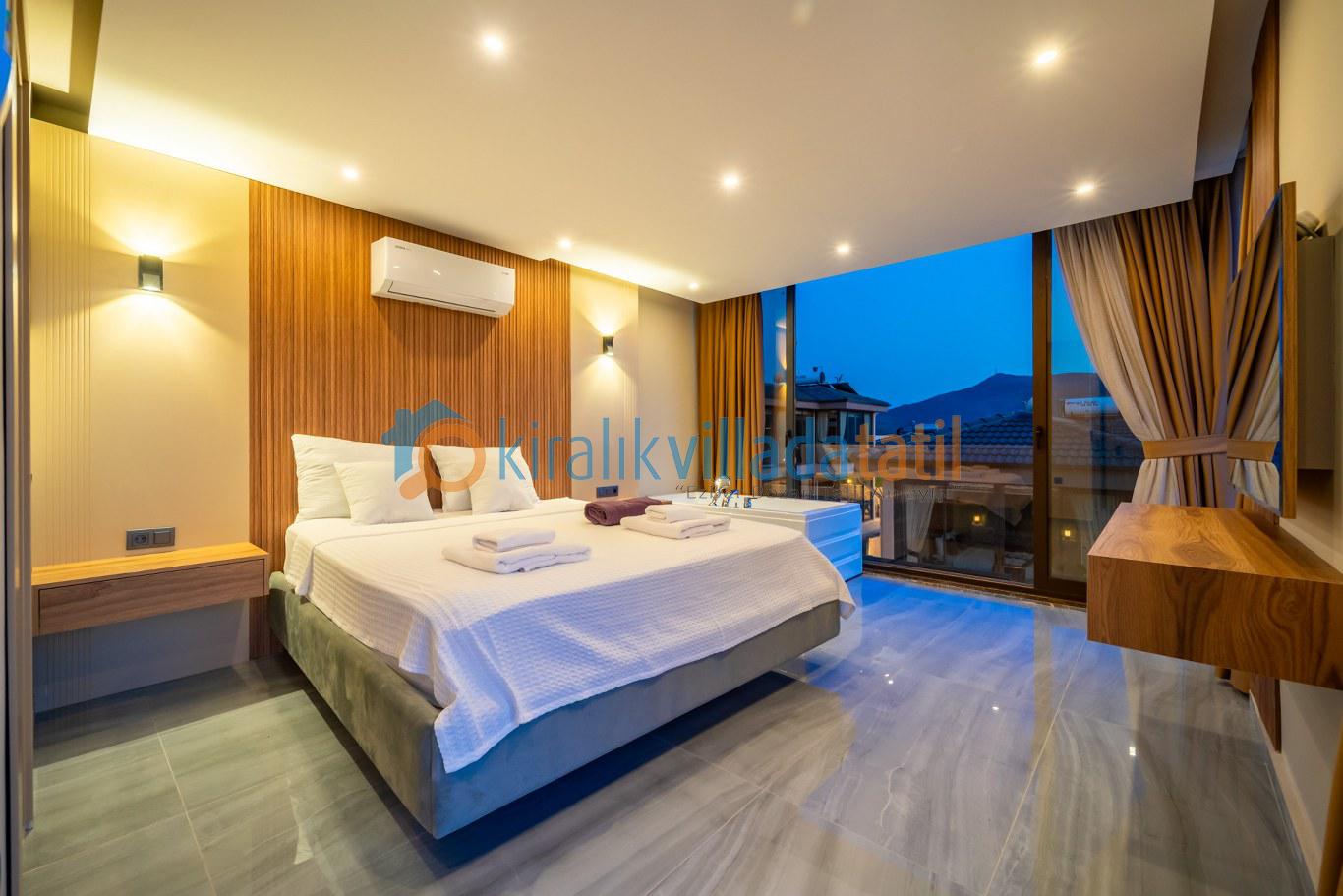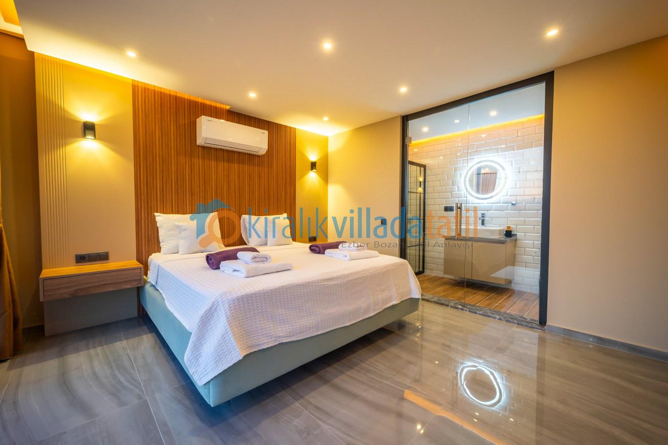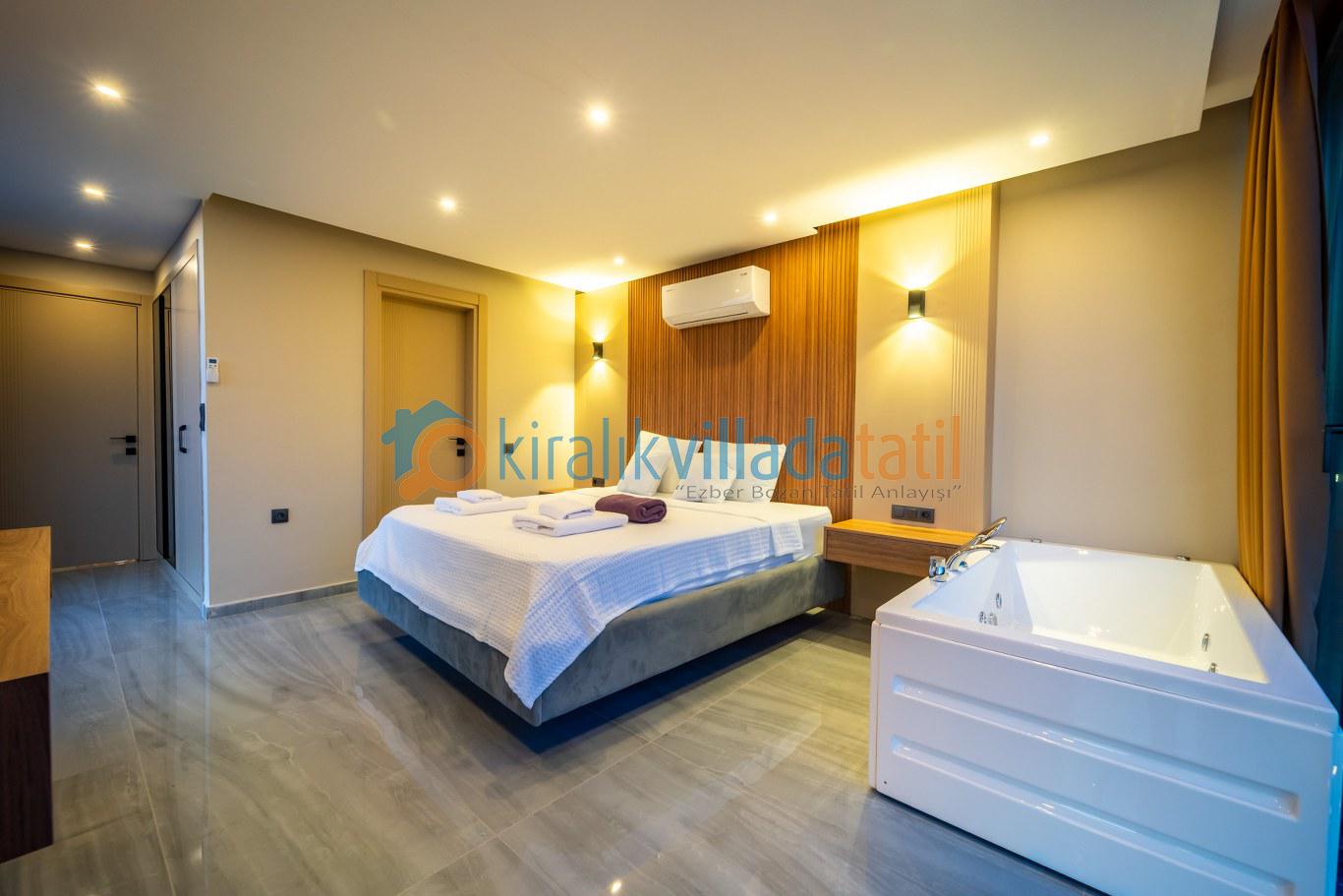 İki yatak odası bulunan villanın, her iki yatak odası da çift kişilik yatağa sahip olup, bir yatak odasında jakuzi mevcuttur. Yatak odalarının, kendilerine ait, banyo-wc, klima, gardrop gibi gerekli oda eşyaları da mevcuttur.