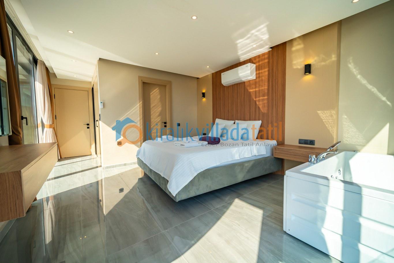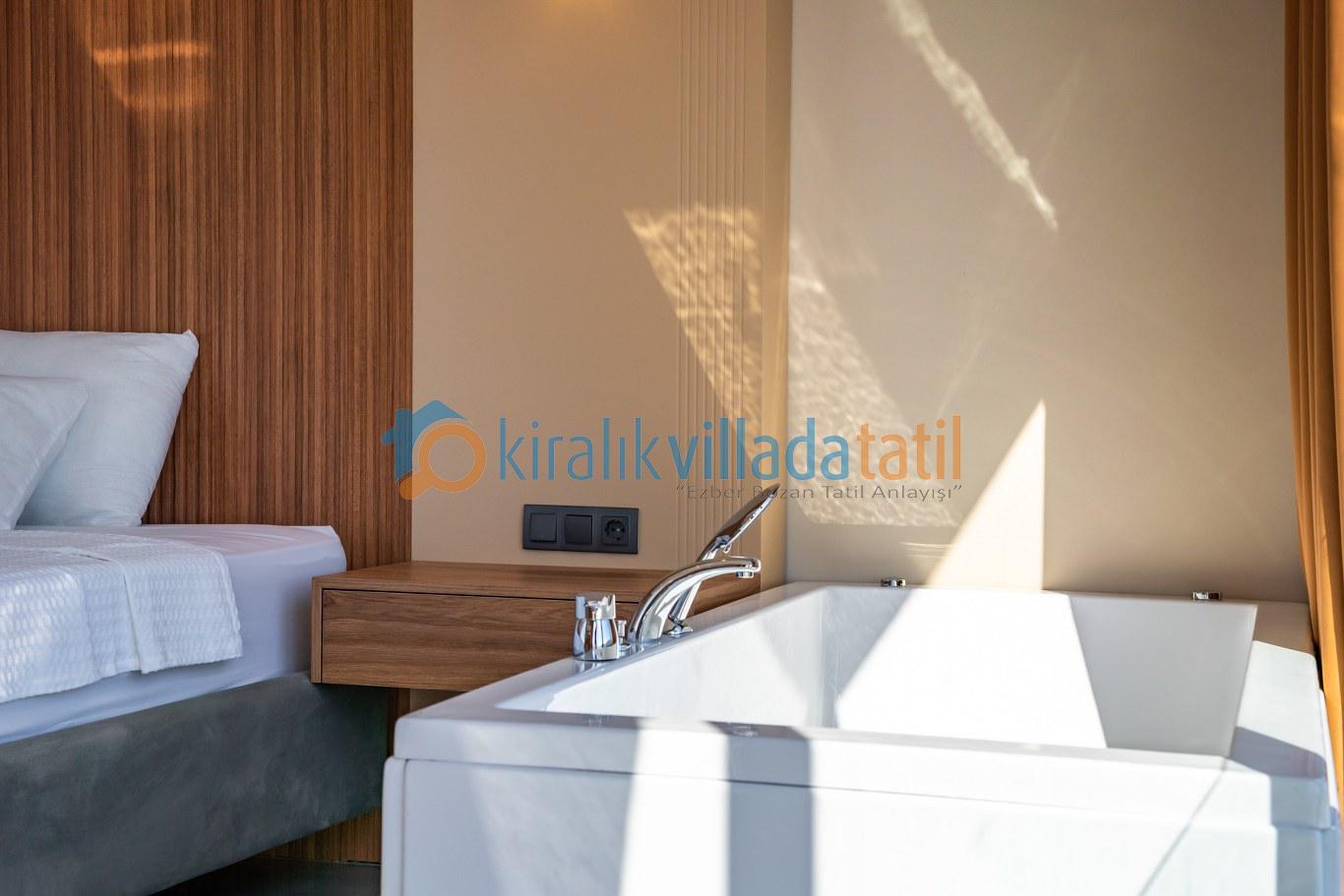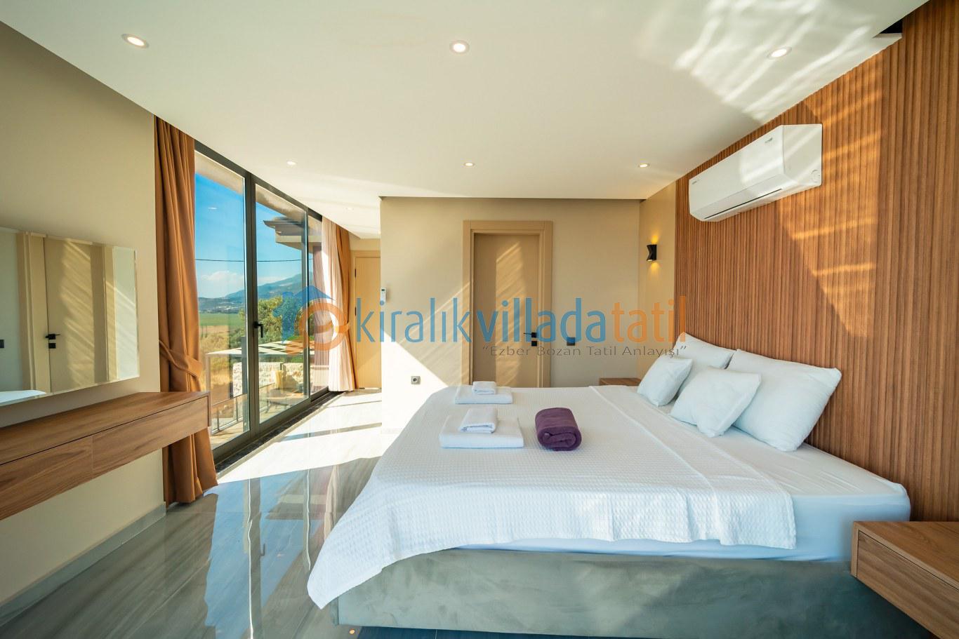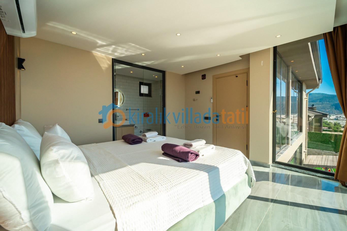 İki yatak odası bulunan villanın, her iki yatak odası da çift kişilik yatağa sahip olup, bir yatak odasında jakuzi mevcuttur. Yatak odalarının, kendilerine ait, banyo-wc, klima, gardrop gibi gerekli oda eşyaları da mevcuttur.