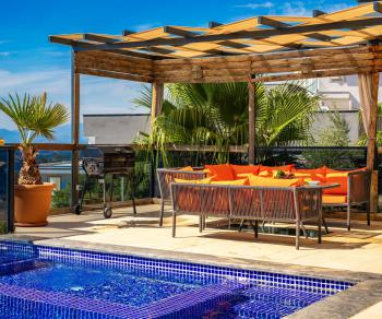 Tamamen korunaklı havuz ve geniş havuz terası sayesinde, dış gözlerden uzak bir tatil keyfi yaşayabilirsiniz. Gün boyu güneşin tadını çıkarabileceğiniz bu özel alanda, akşamları barbekü keyfi yapabileceğiniz bir mangal alanı da bulunmaktadır.
