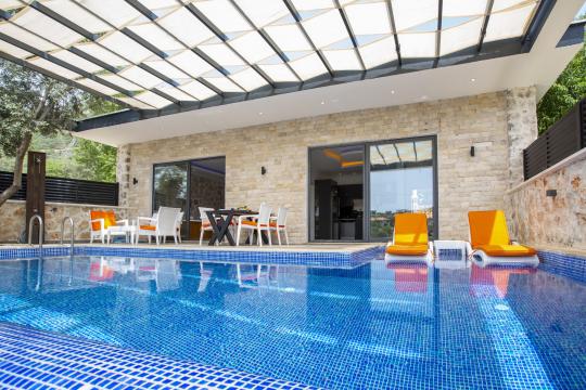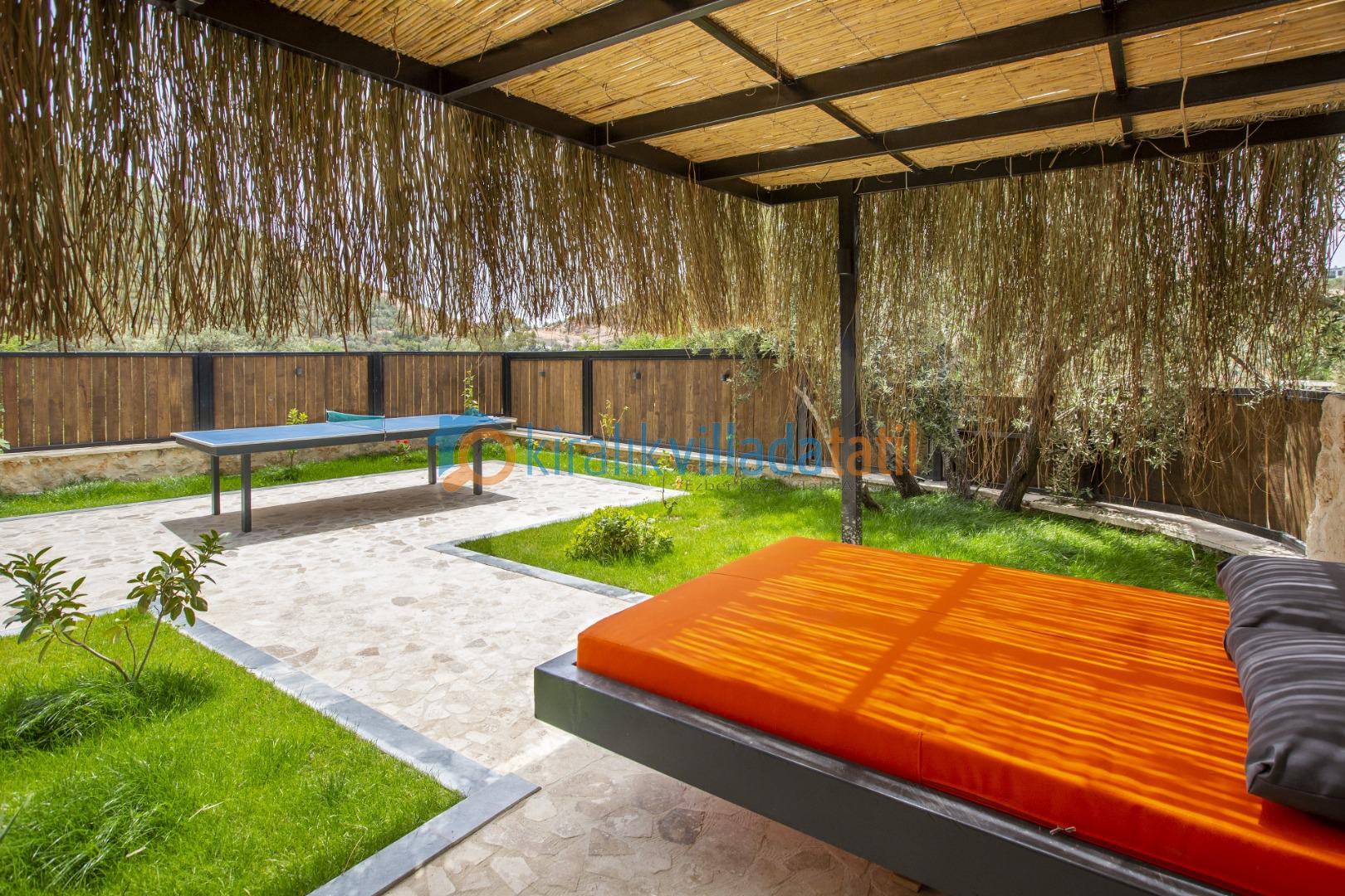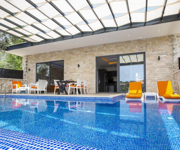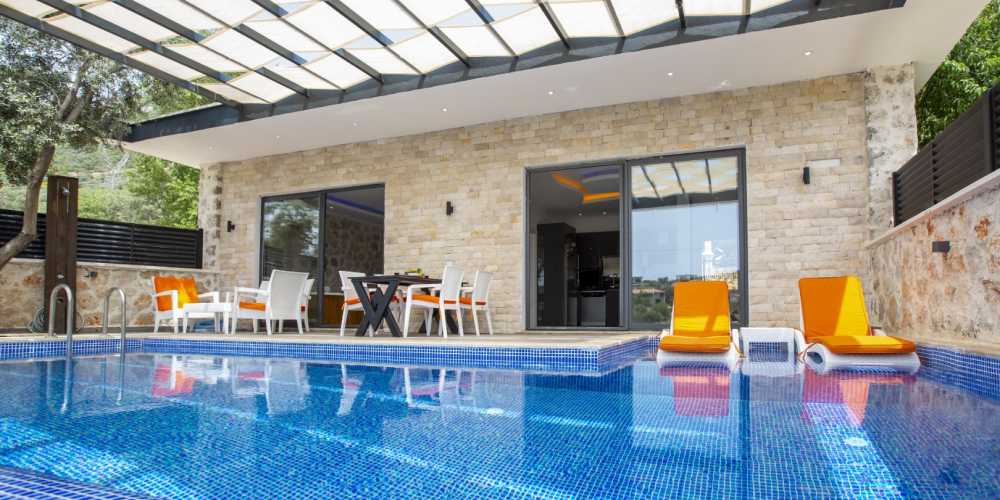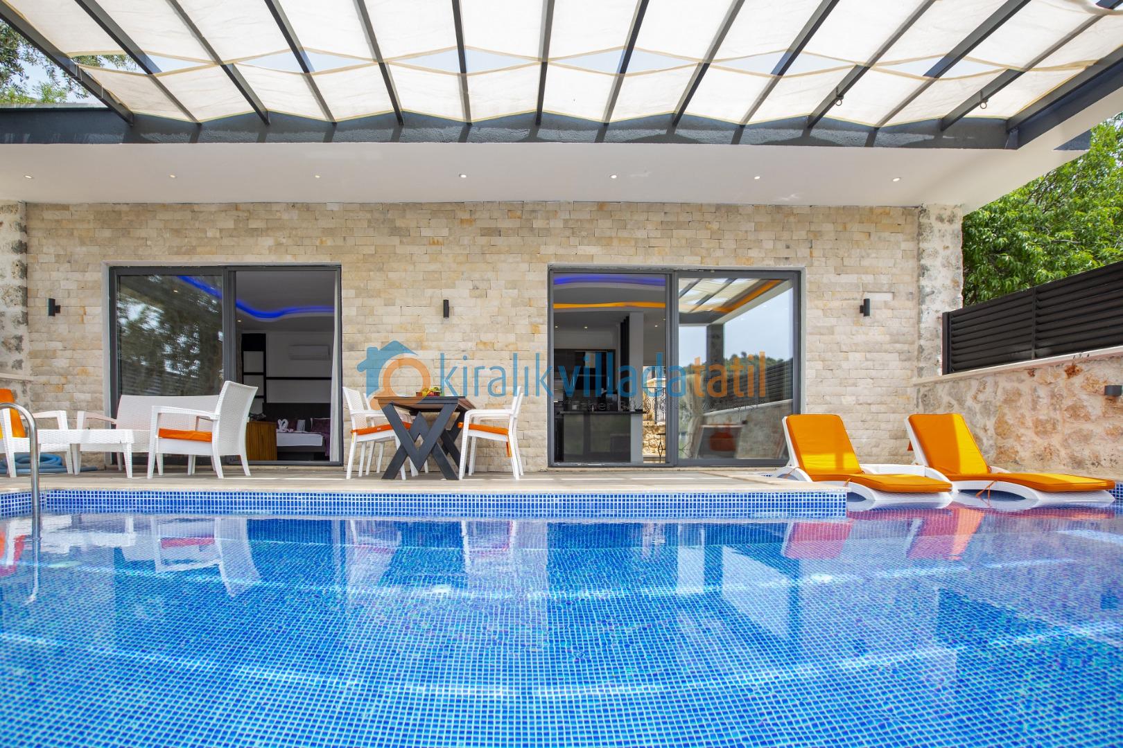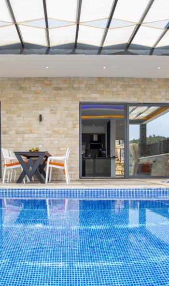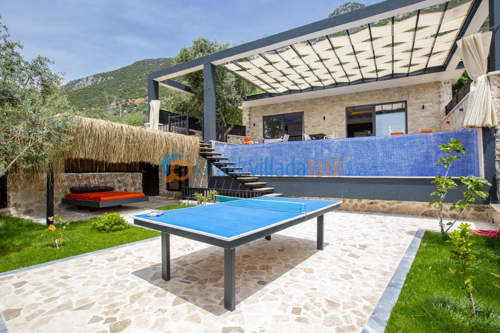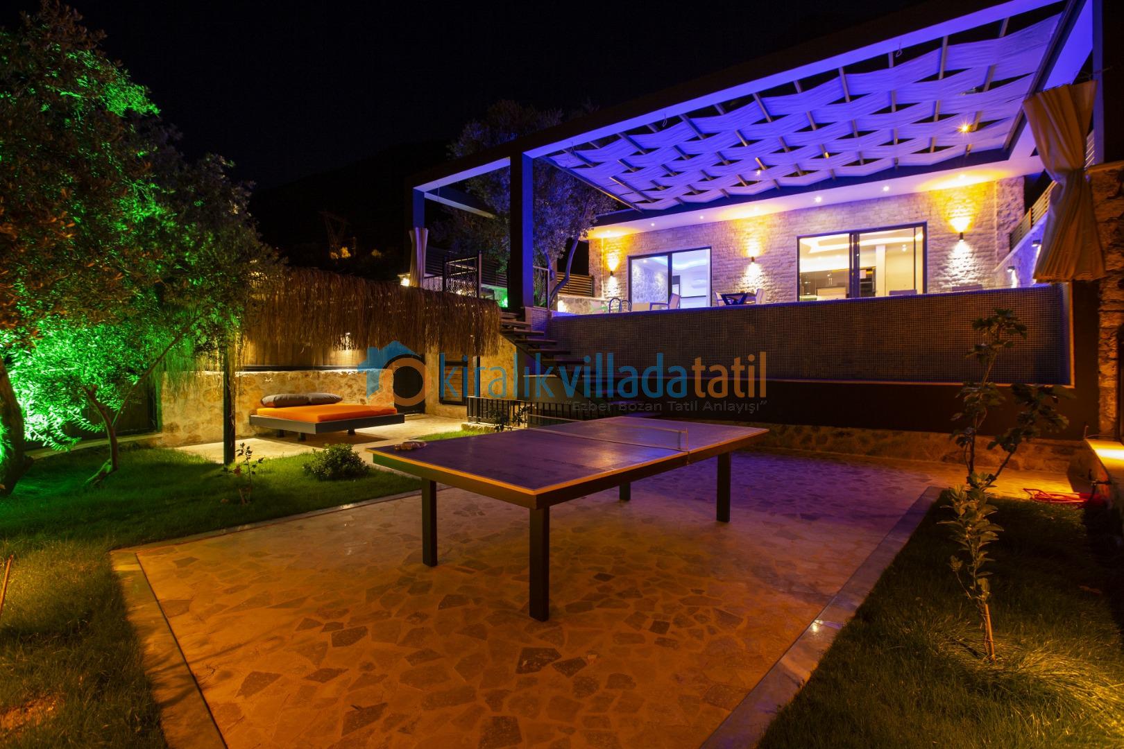 Villamızda yer alan havuz ve havuz terası, perdeleme sistemi sayesinde tamamen korunaklı hale getirilebiliyor. Bu sayede mahremiyetine önem veren muhafazakâr misafirler gönül rahatlığıyla tatillerini geçirebiliyor. Geniş bahçesi, masa tenisi, mangal alanı ve jakuzili yatak odası gibi olanaklarla dolu bu villa, hem eğlenceli hem de dinlendirici bir tatil atmosferi oluşturuyor.