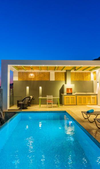 Villamızın tamamen korunaklı havuzu ve geniş teras alanı, dışarıdan görünmeden rahatça güneşlenmenize ve keyifli anlar yaşamanıza olanak tanır. Akşamları gün batımının büyüleyici renklerine karşı mangalınızı yakabilir, doğa ve deniz manzarası eşliğinde romantik akşamlar geçirebilirsiniz.