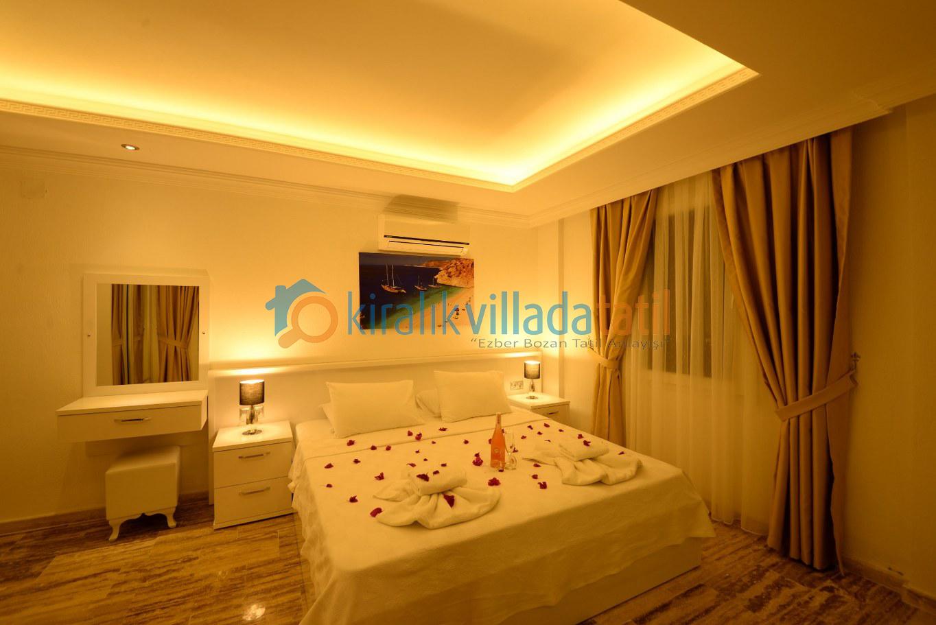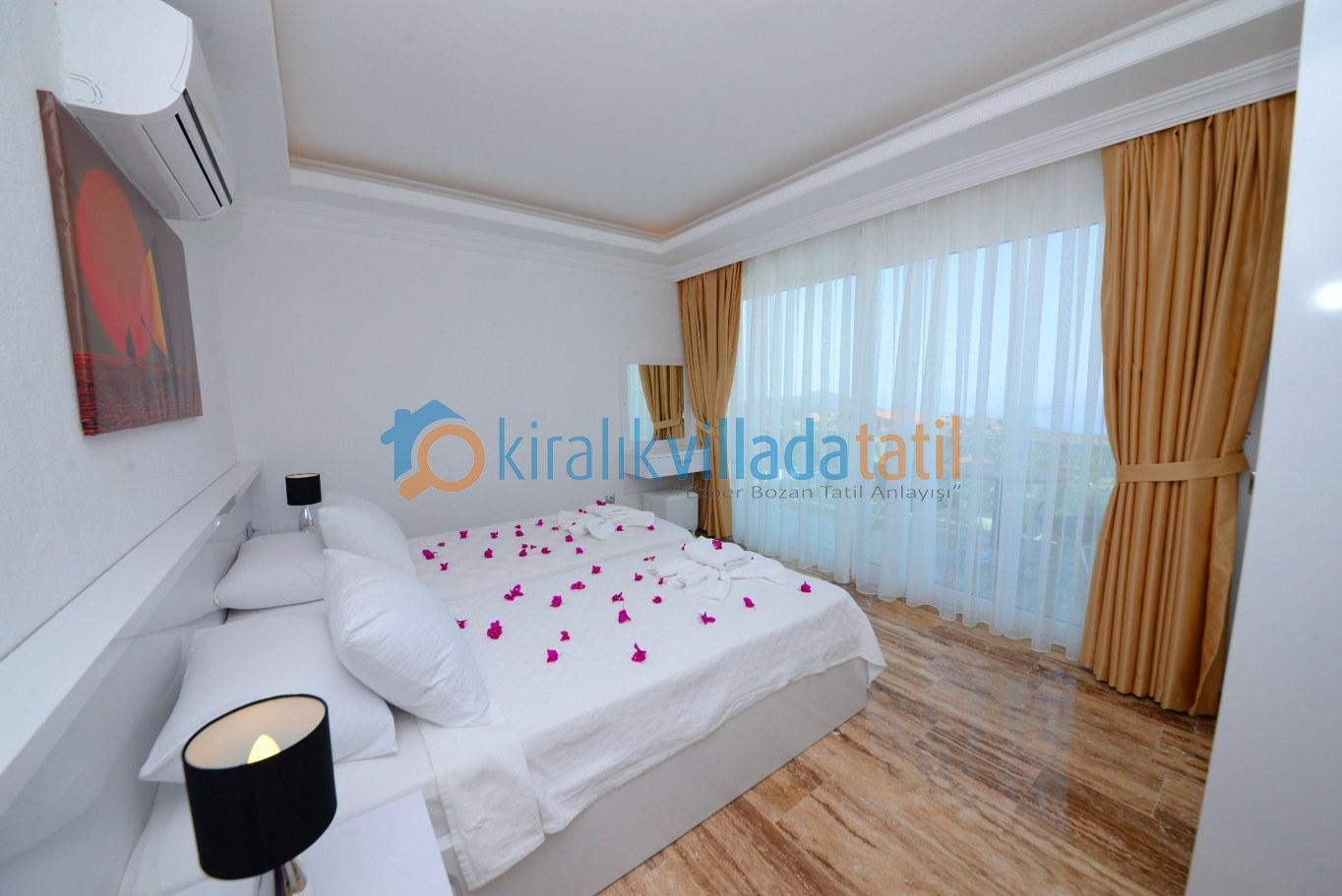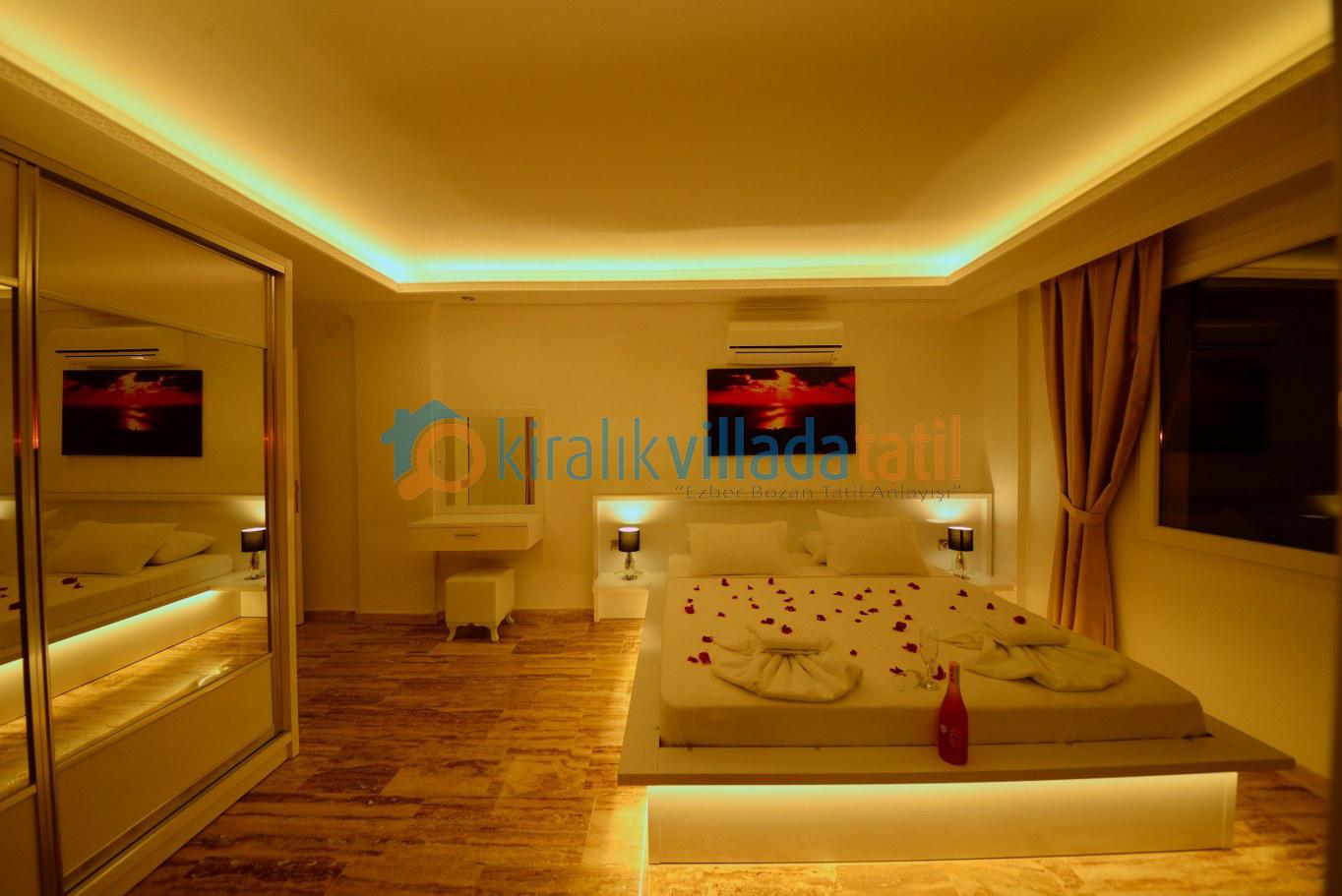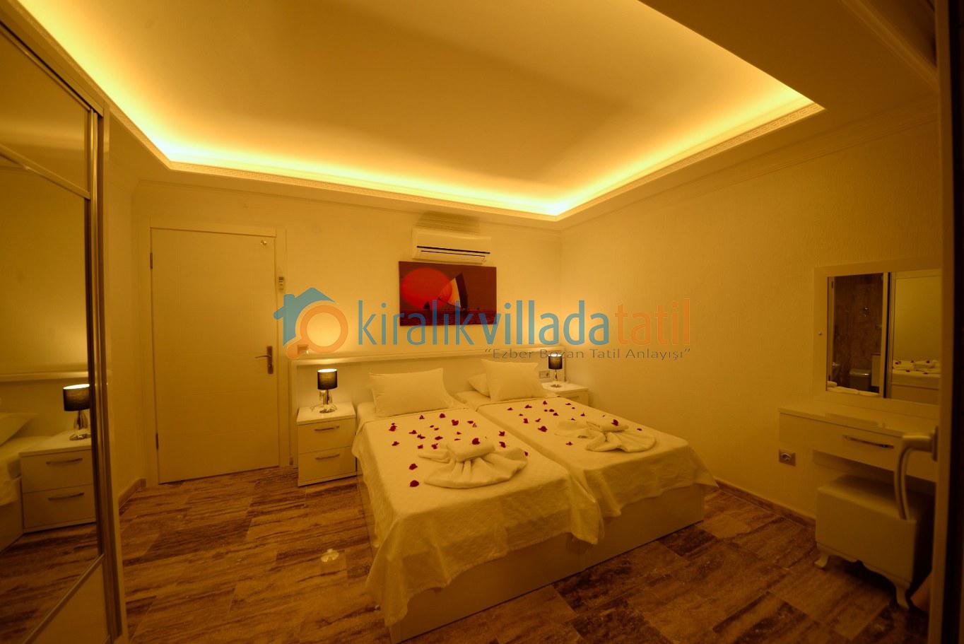 Dört yatak odası bulunan villanın, üç yatak odasında çift kişilik yatak, diğer yatak odasında ise, iki adet tek kişilik yatak bulunmaktadır. Yatak odalarının, kendilerine ait, klima, gardrop, makyaj masası, banyo-wc gibi olanakları mevcuttur.