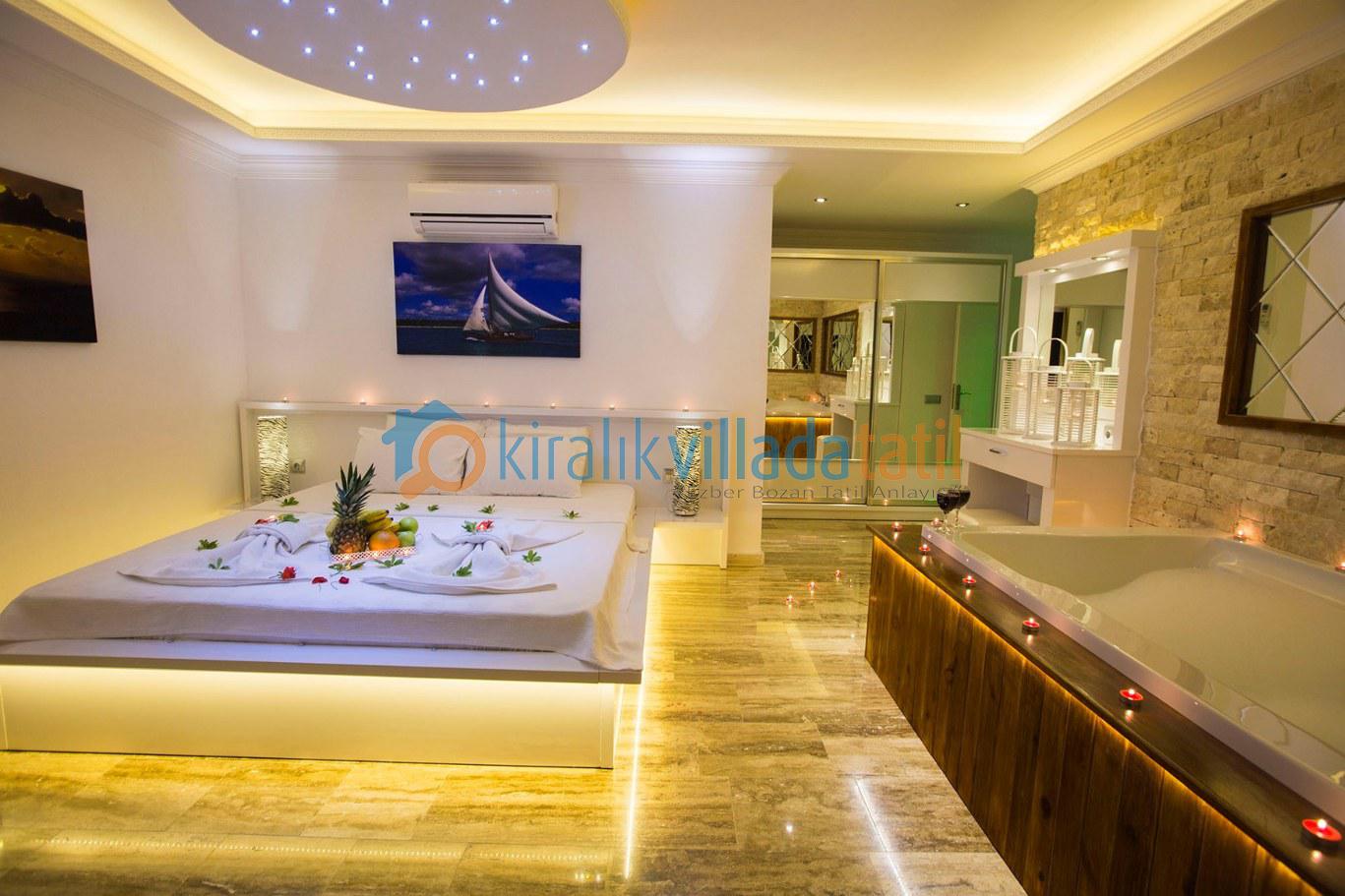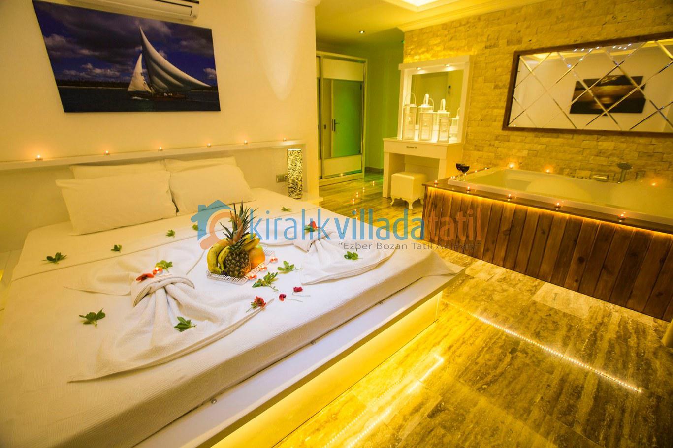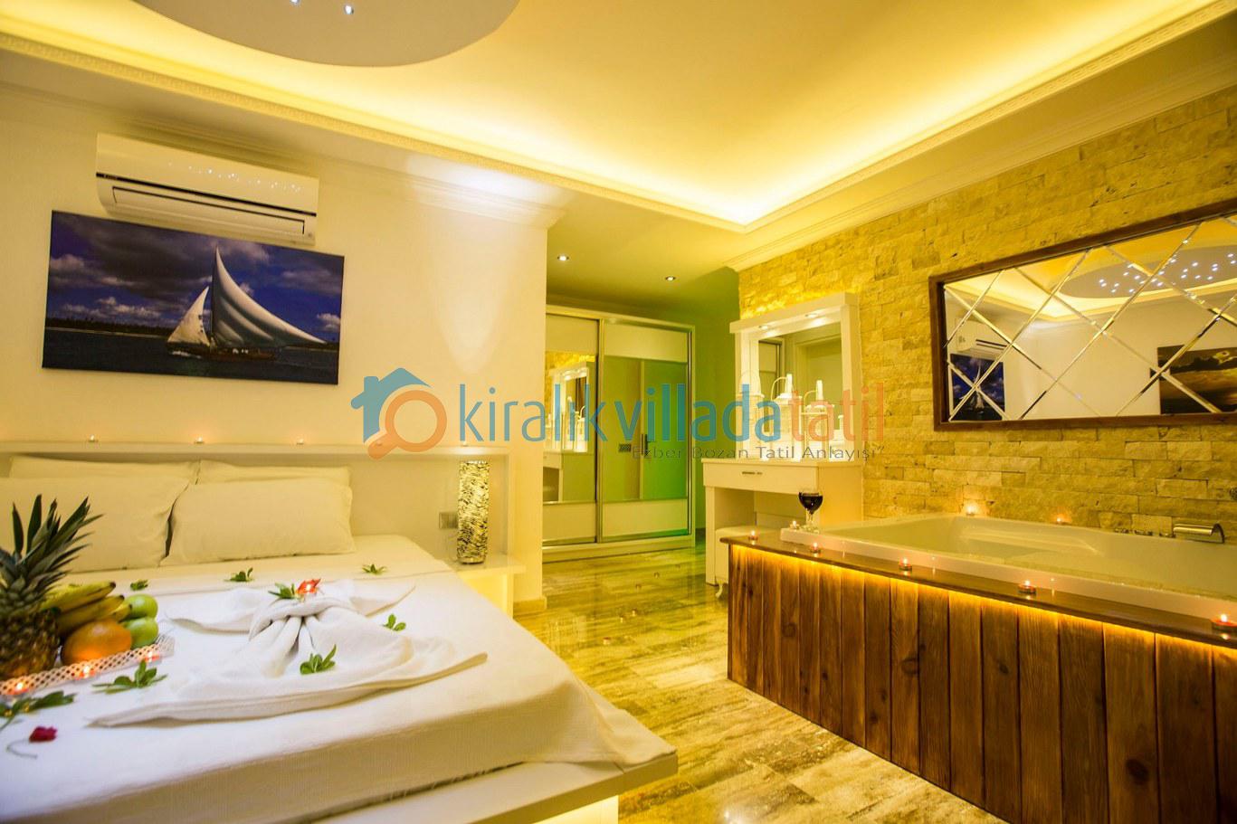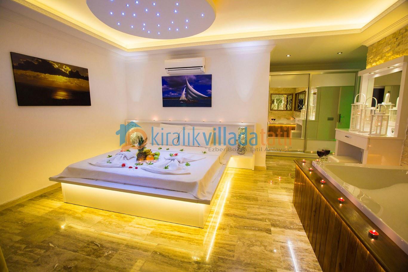 Dört yatak odası bulunan villanın, üç yatak odasında çift kişilik yatak, diğer yatak odasında ise, iki adet tek kişilik yatak bulunmaktadır. Yatak odalarının, kendilerine ait, klima, gardrop, makyaj masası, banyo-wc gibi olanakları mevcuttur.