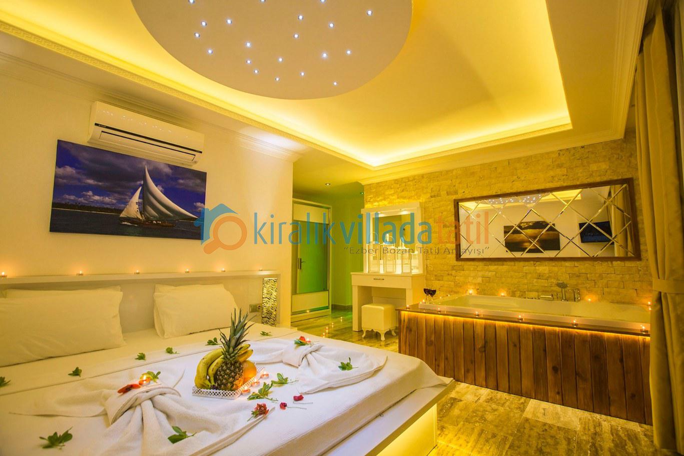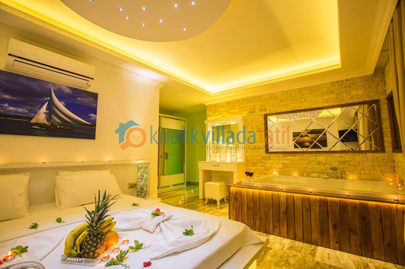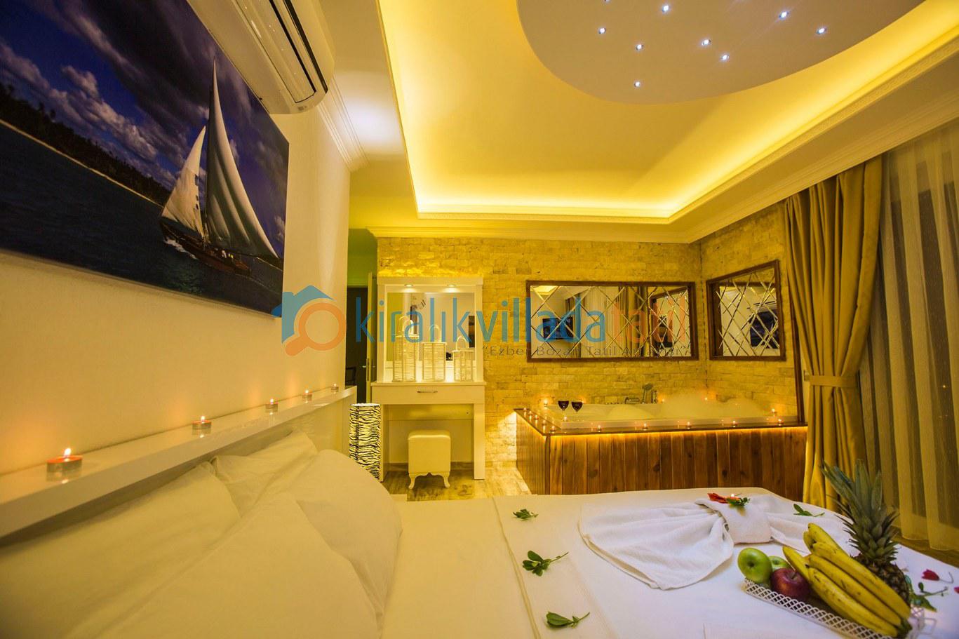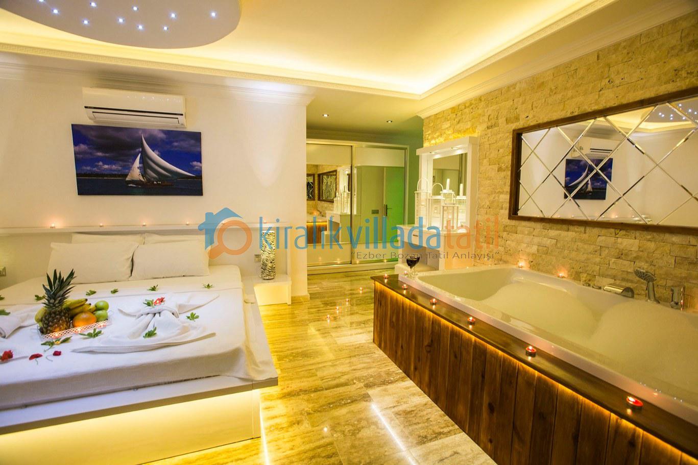 Dört yatak odası bulunan villanın, üç yatak odasında çift kişilik yatak, diğer yatak odasında ise, iki adet tek kişilik yatak bulunmaktadır. Yatak odalarının, kendilerine ait, klima, gardrop, makyaj masası, banyo-wc gibi olanakları mevcuttur.