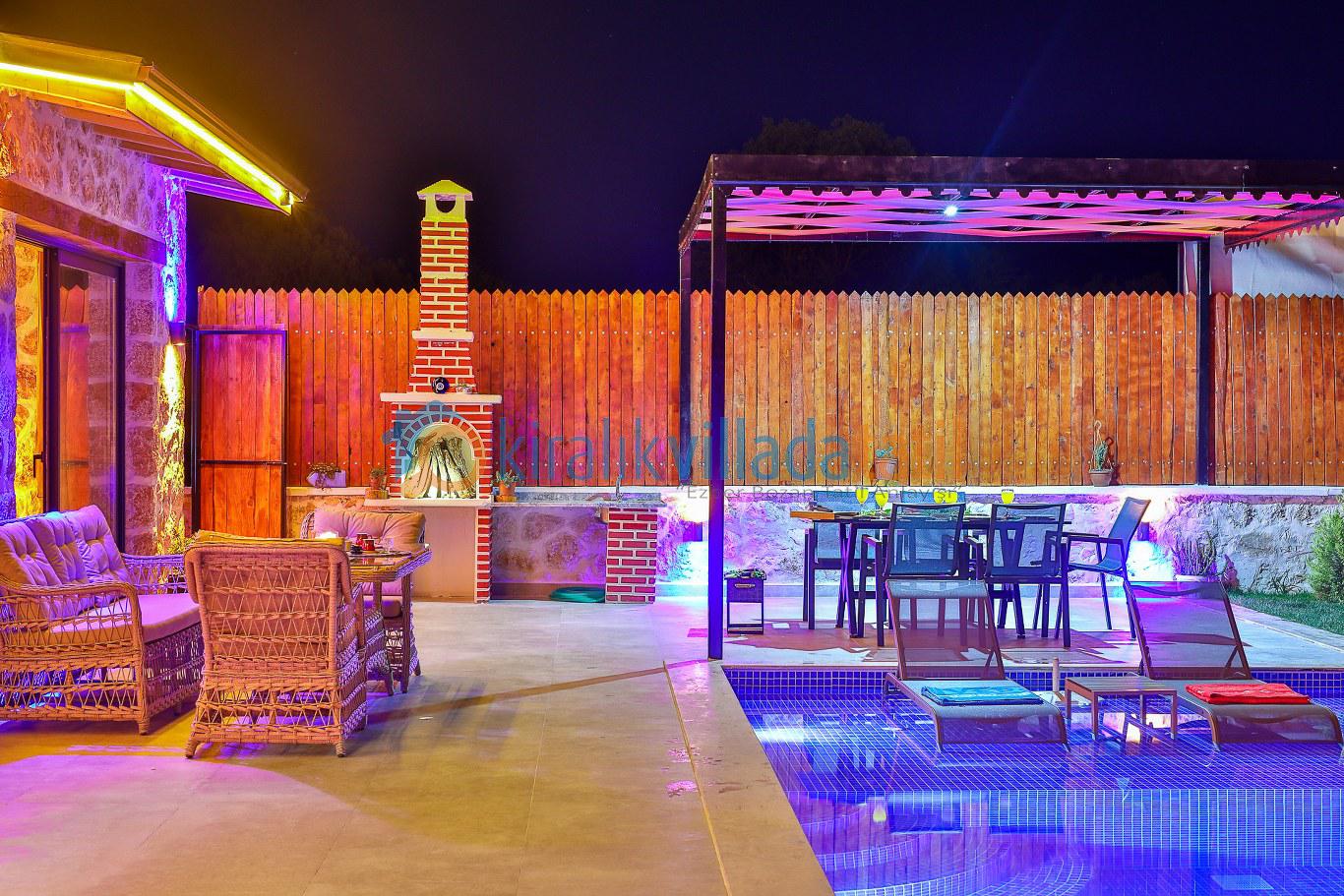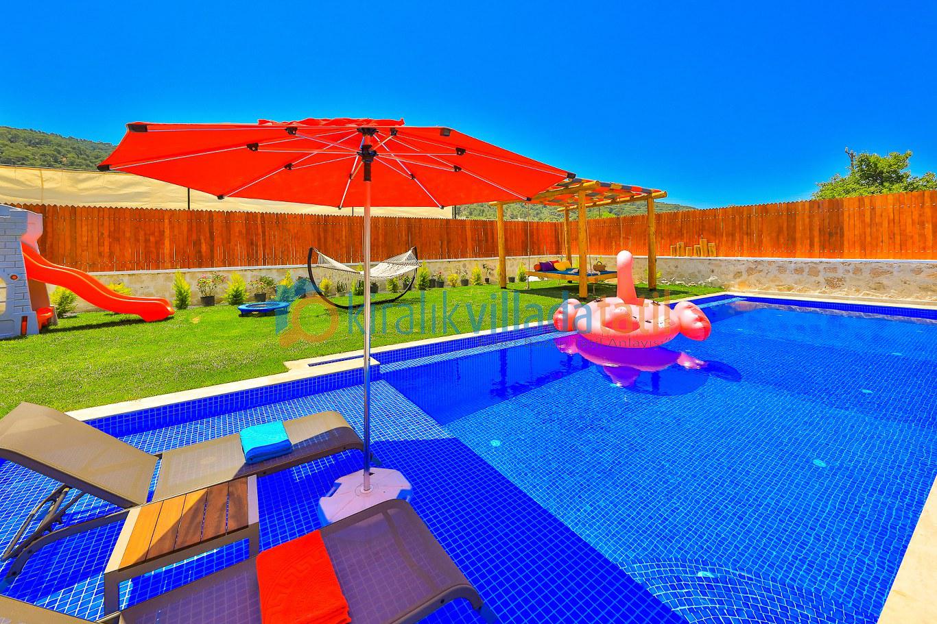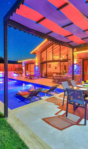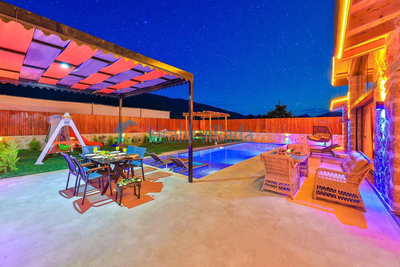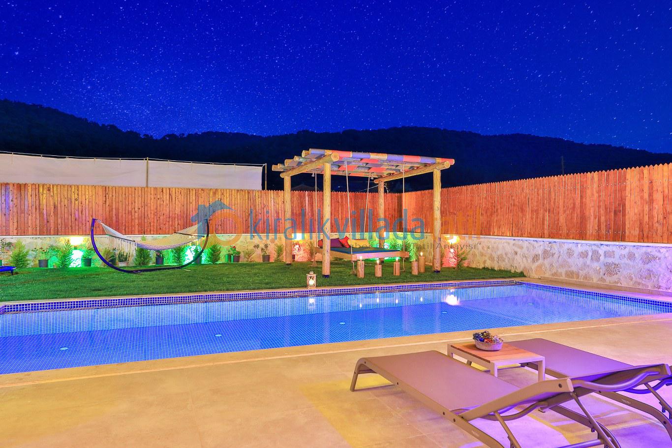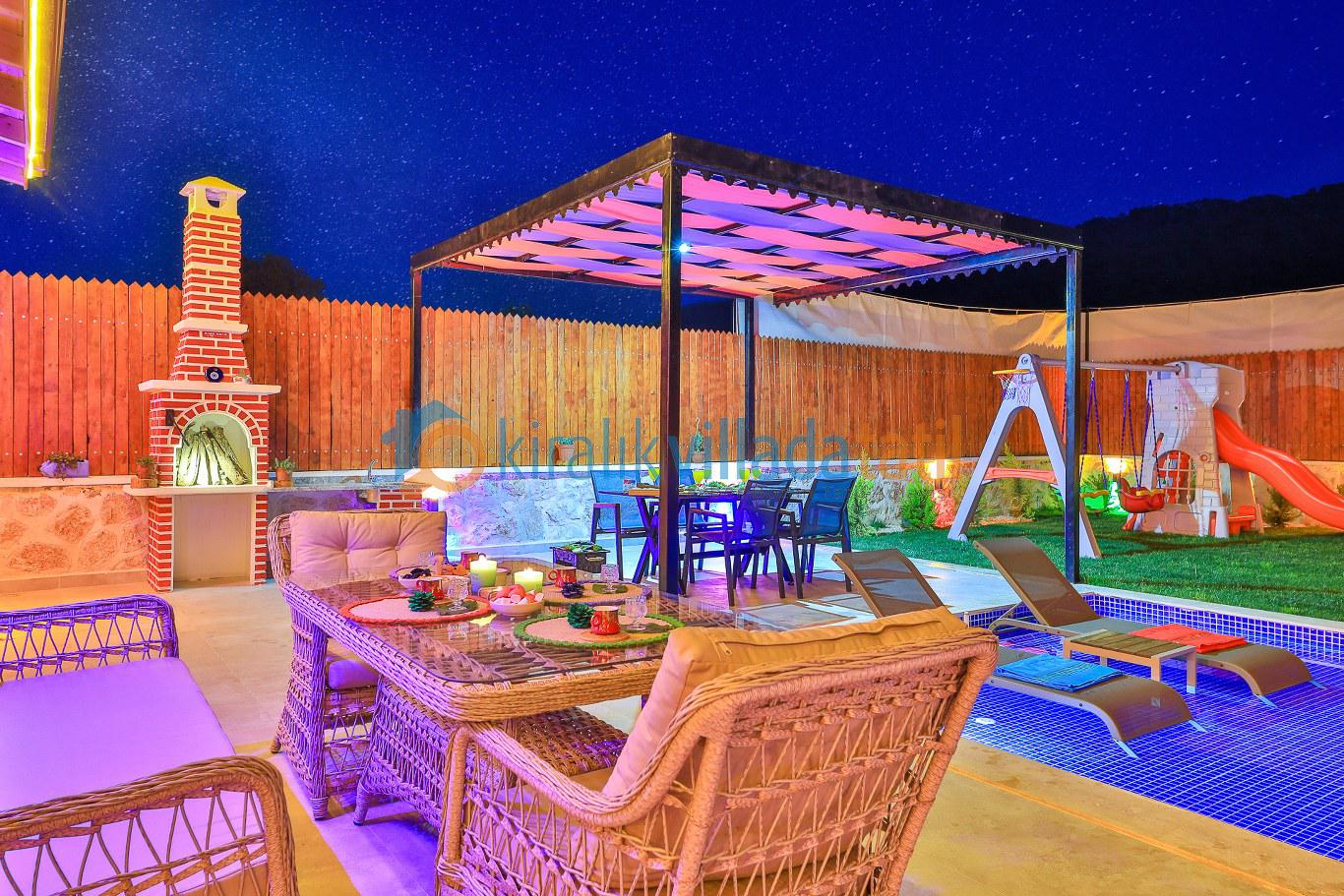 Villanın havuzu ve havuz terası tamamen korunaklıdır, bu sayede dış gözlerden uzak, rahat ve güvenli bir tatil deneyimi sunar.