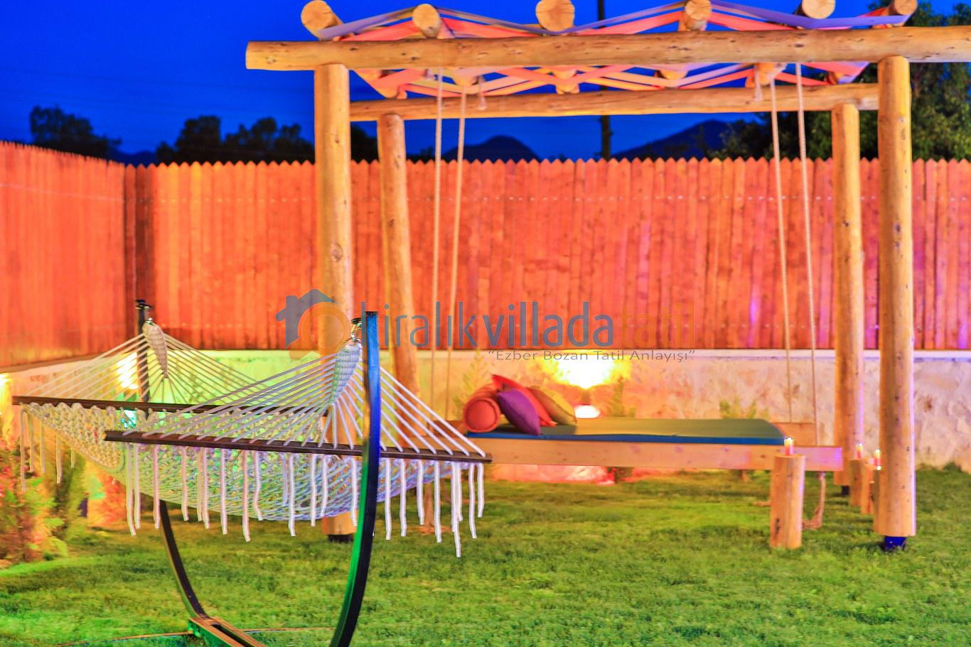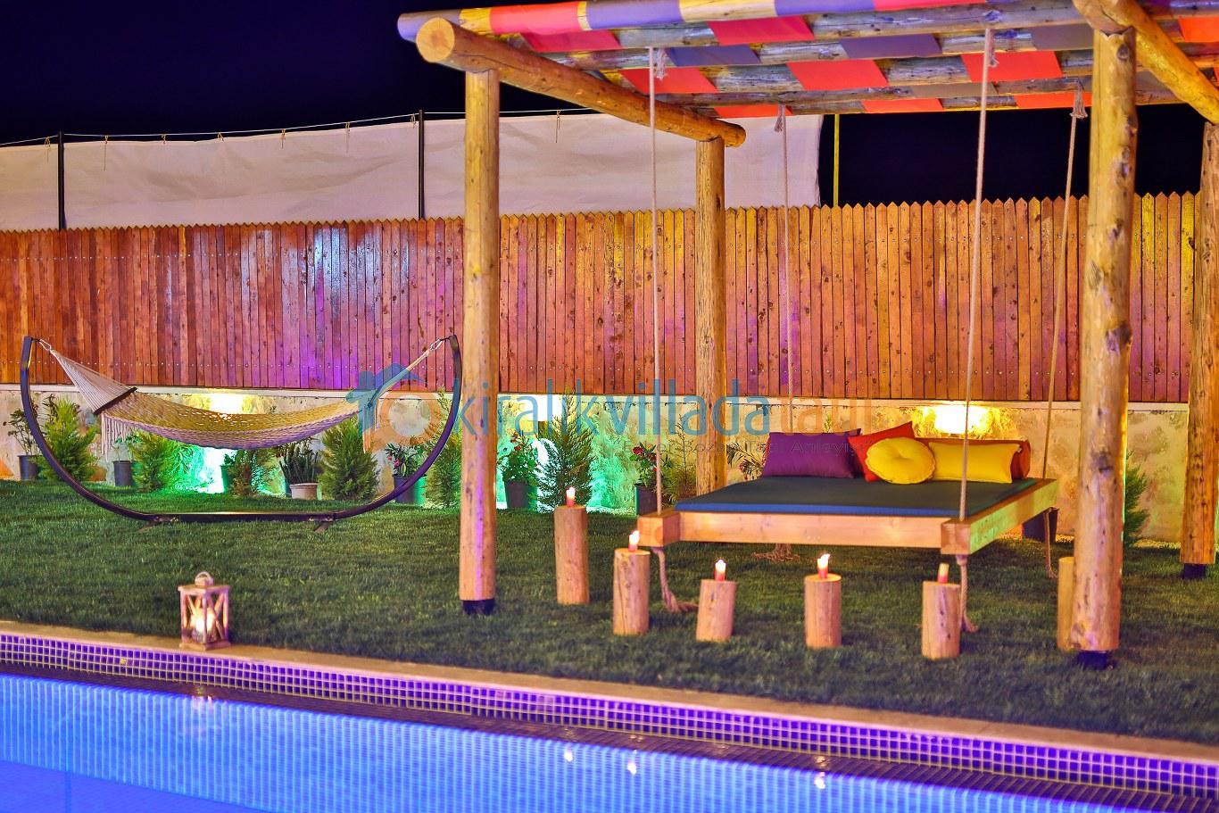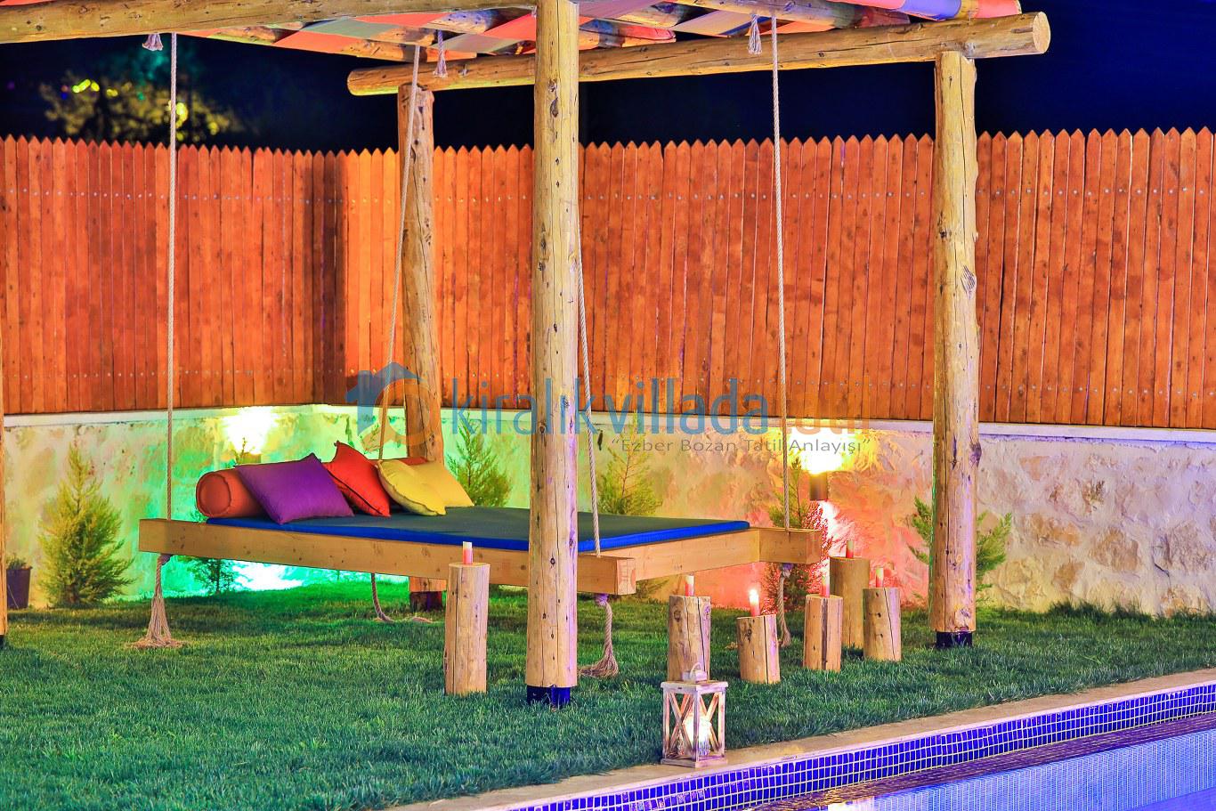 Villada eğlenceli zaman geçirmek isteyenler için barbekü alanı, jakuzi ve bahçede salıncaklı yatak gibi imkânlar da mevcuttur.