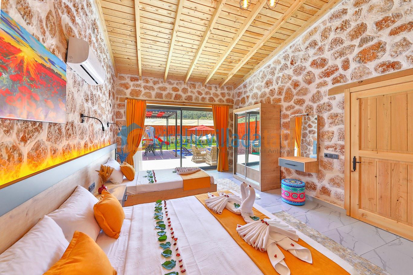 Ana yatak odasında çift kişilik yatak, ikinci odada ise biri tek, biri çift kişilik iki yatak bulunur.