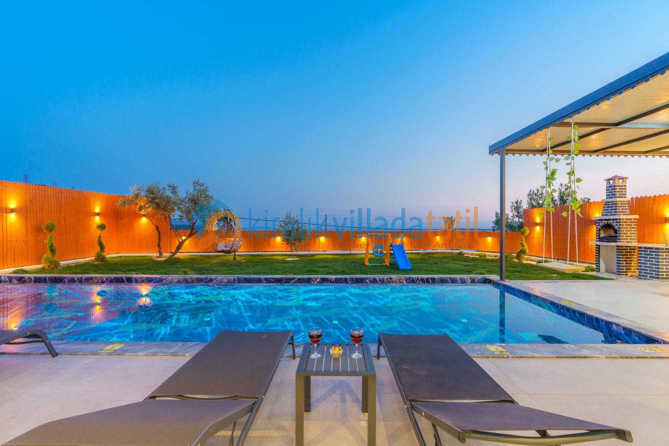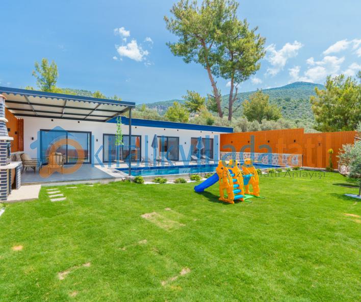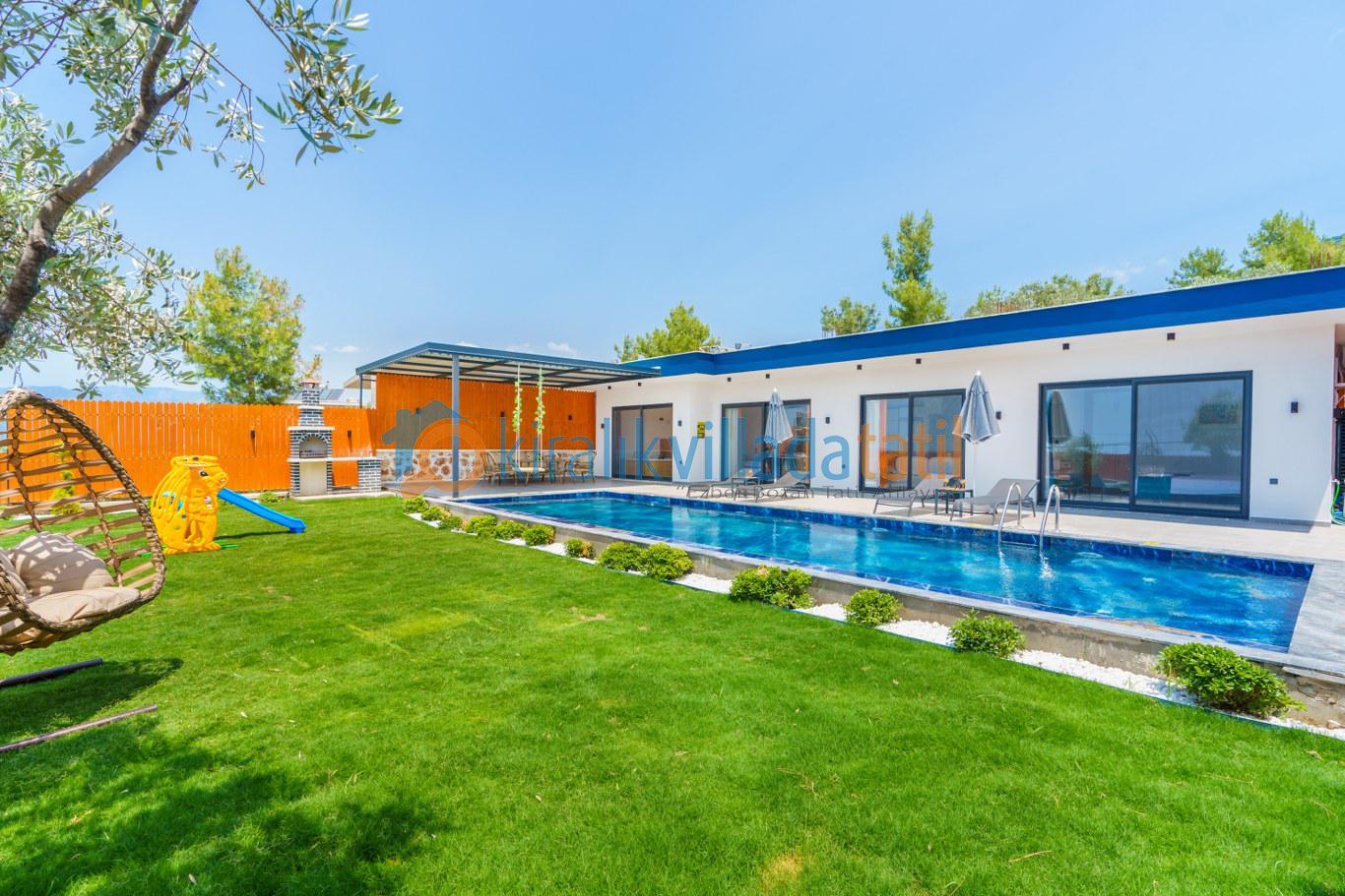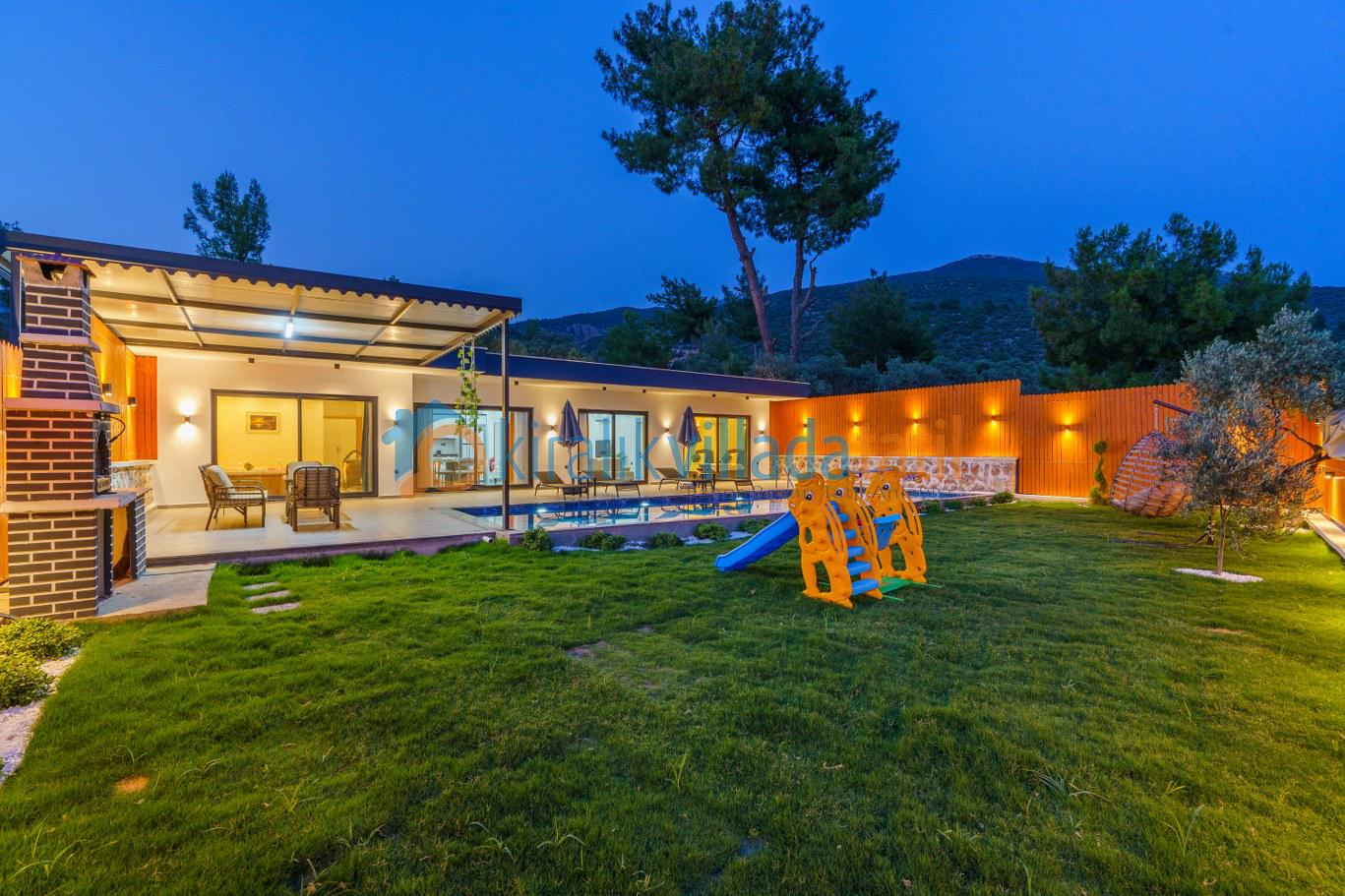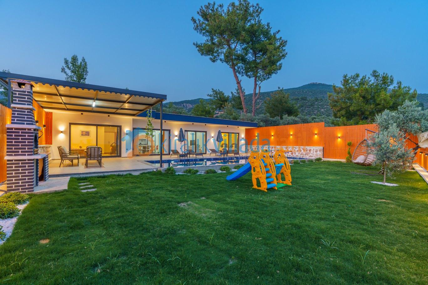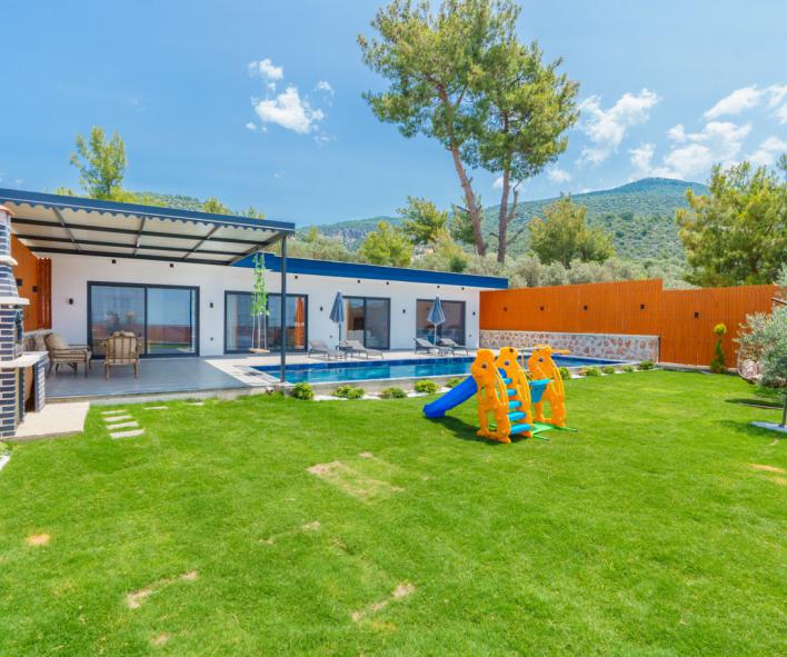 Geniş bir yeşil bahçeye sahip olan villa, jakuzi, çocuk oyun alanı, mangal alanı, bahçe mobilyaları gibi olanakları ile rahat bir tatil yaşamanızı sağlayacaktır.