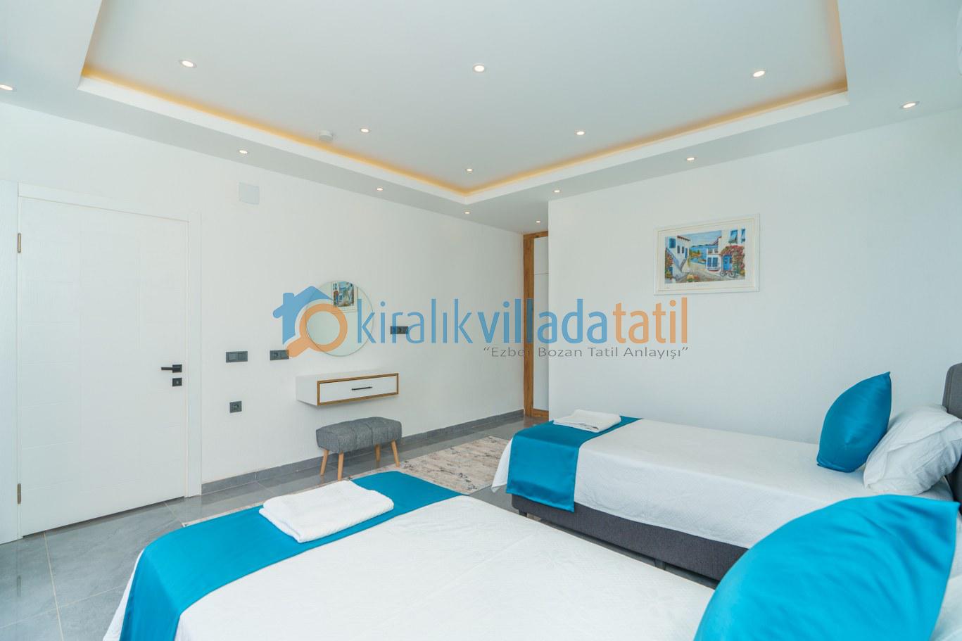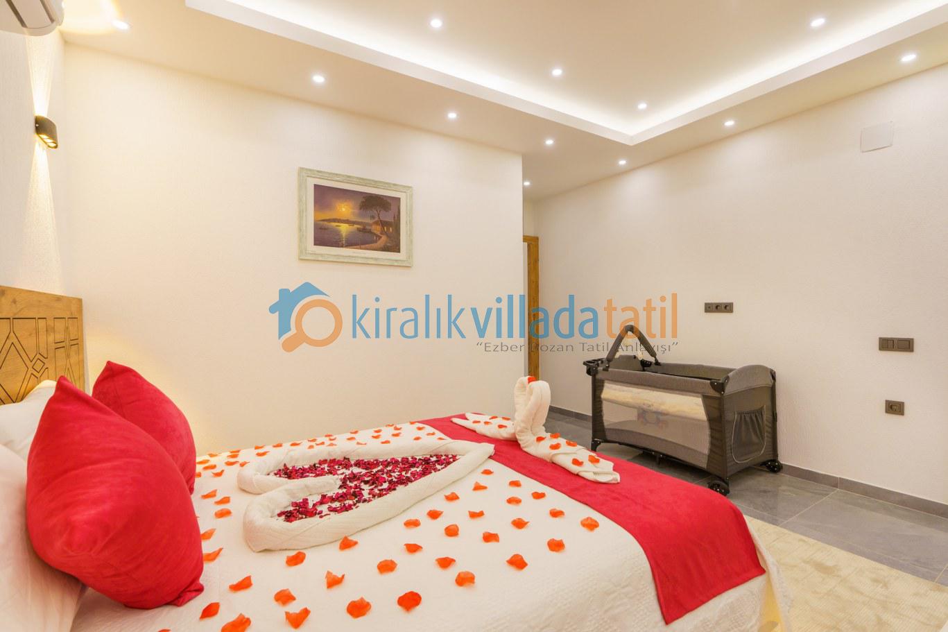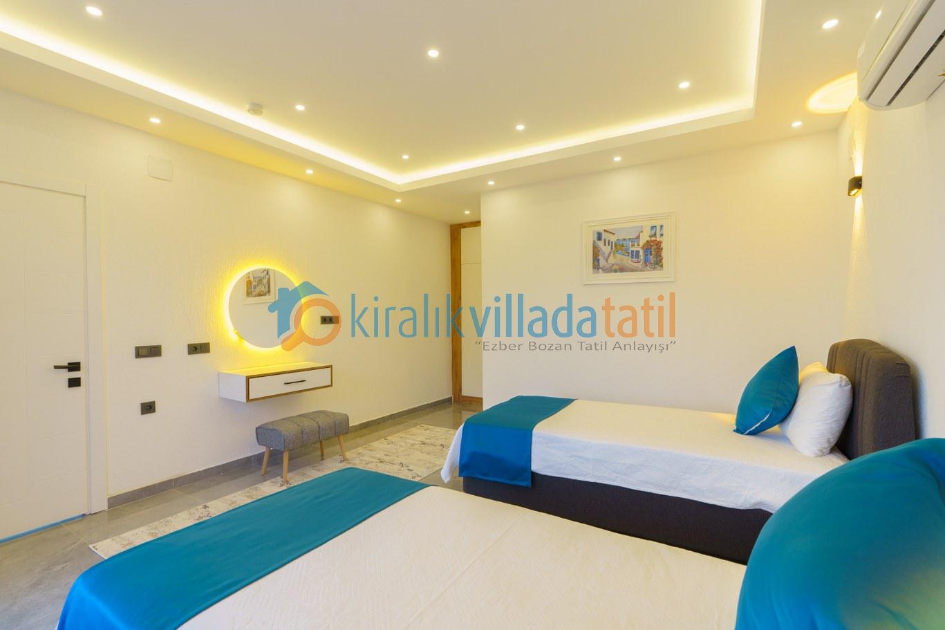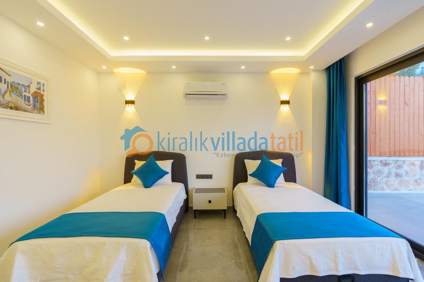 İki yatak odası bulunan villanın, ana yatak odasında çift kişilik yatak, diğerinde ise, iki adet tek kişilik yatak mevcuttur. Odalarda, gerekli olabilecek oda eşyaları, banyo-wc bulunmaktadır.