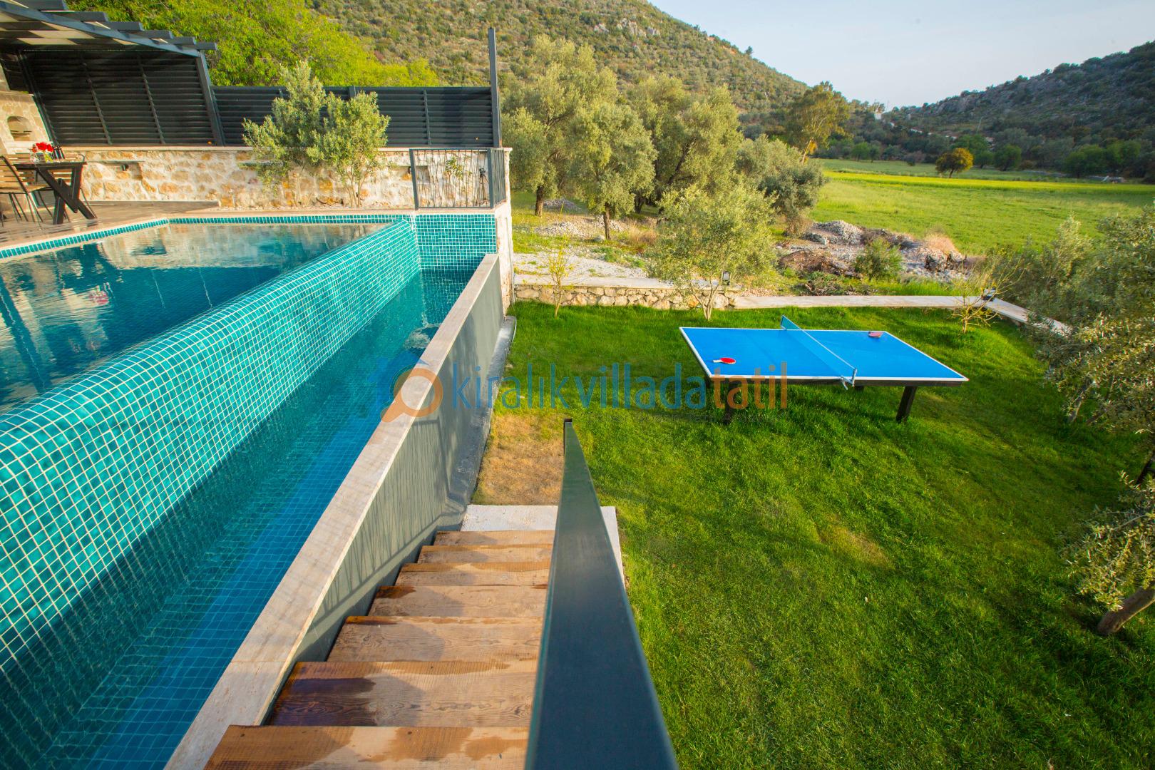 2 kişilik konaklama kapasitesine sahip villamızda, dışarıdan görünmeyen korunaklı havuz ve havuz terası bulunur. Bu özelliği sayesinde muhafazakâr çiftler için de ideal bir ortam sağlar. Geniş ve yeşilliklerle çevrili bahçesinde masa tenisi, barbekü alanı, bahçe mobilyaları ve jakuzili dinlenme alanı gibi olanaklarla dolu keyifli vakitler geçirebilirsiniz.