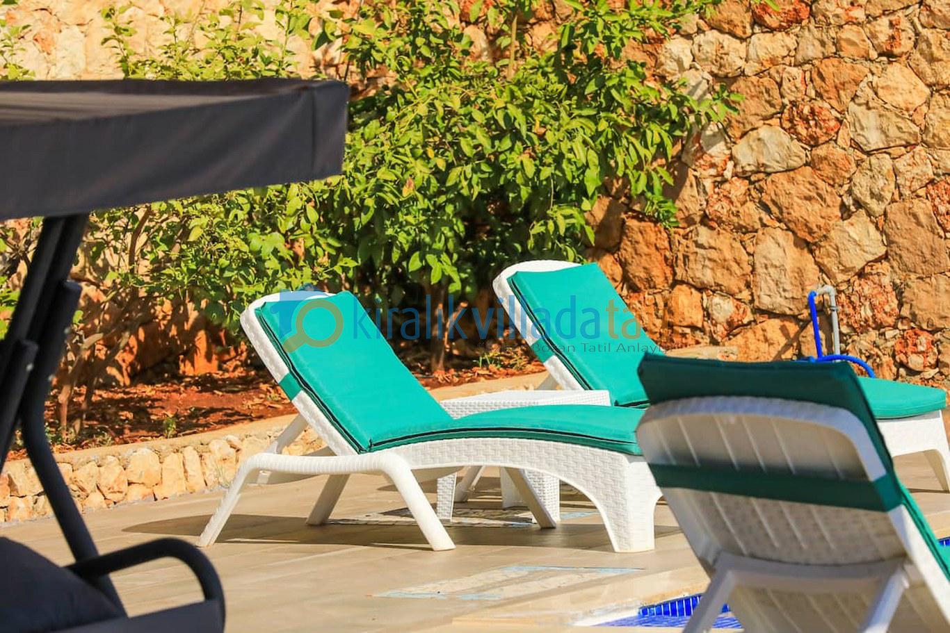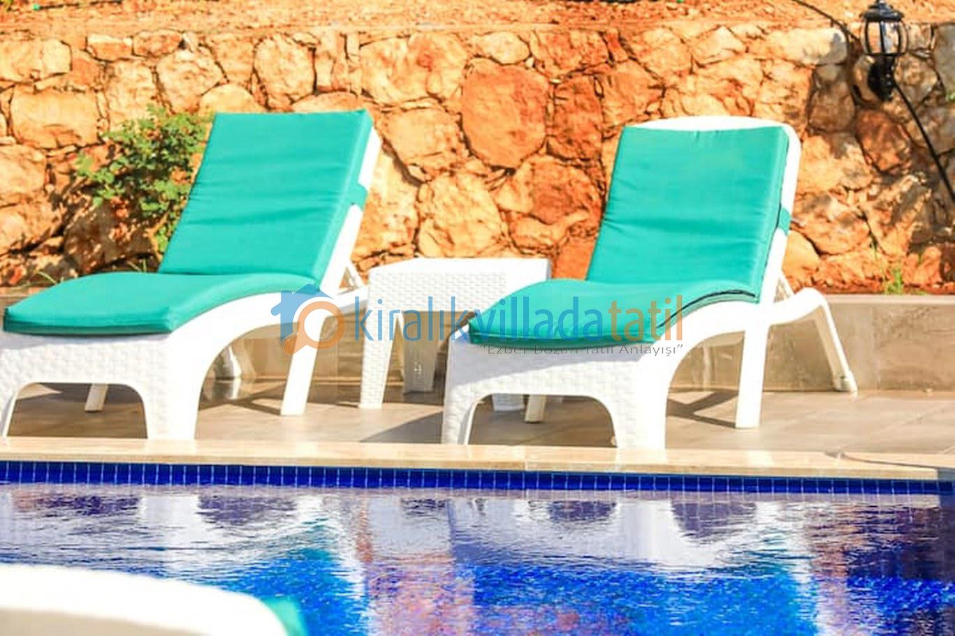Geniş bir havuz ve havuz terasına sahip olan villanın, havuz terası alanında şezlong, masa, sandalyeler mevcuttur.